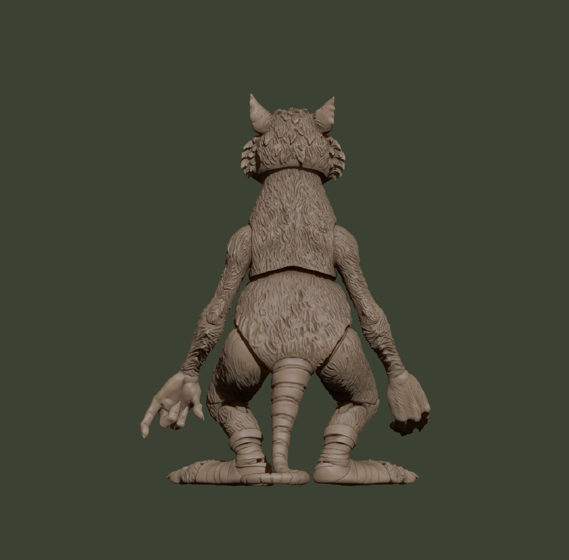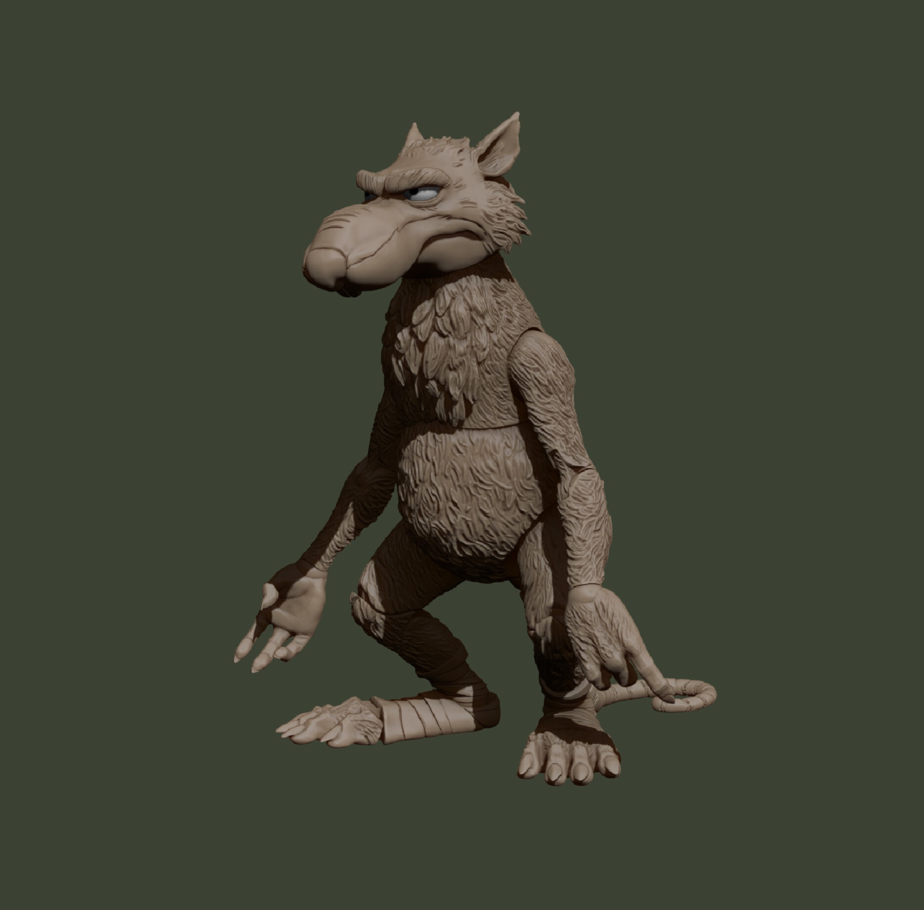 Je trouve que Perkins est parvenu à très bien capturer l’expression faciale de Splinter. La sculpture aurait pu être enlaidie par l’ajout des reliefs du pelage. Il n’en est rien ! Les oreilles, les moustaches, le poil, tout est là ! Et si vous regardez le modèle numérique que l’artiste a partagé (ci-dessus), vous noterez quelques grosses différences. Un travail de remodelage a été effectué avant la fin de la production de la figurine sur l’ensemble de sa tête. Ses sourcils et sa bouche ne sont clairement pas les mêmes. Il en va de même pour les poils des joues et pour sa bavette sur le torse, finalement plus petite, sans doute pour faciliter l’articulation du cou.