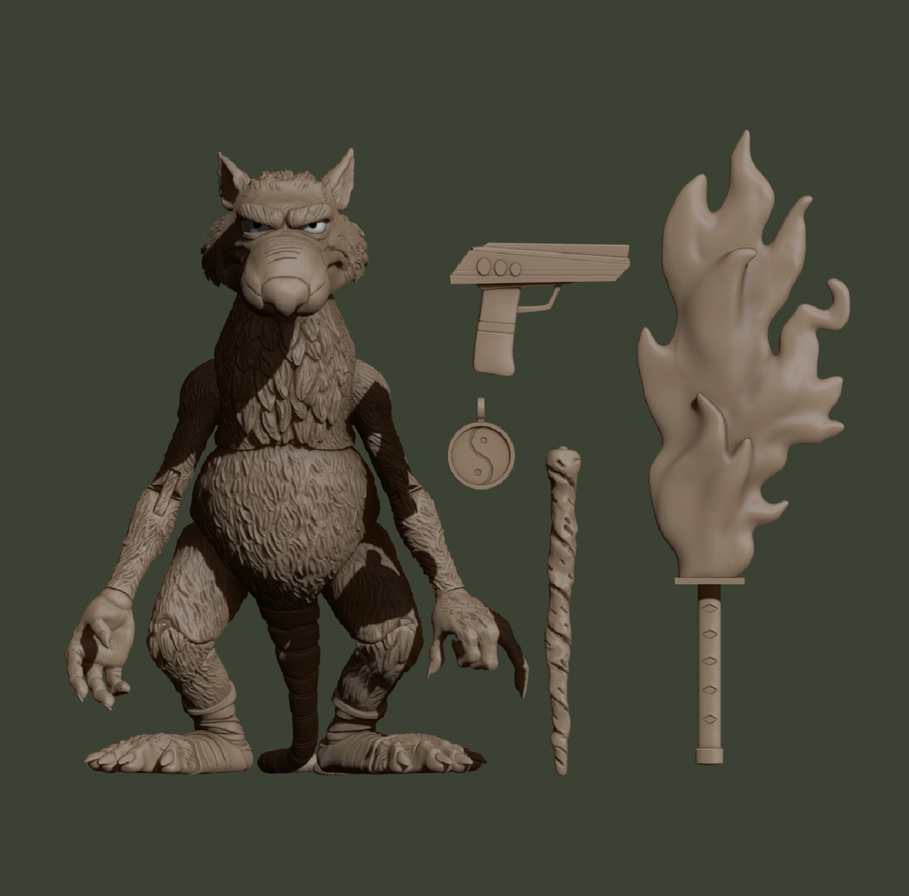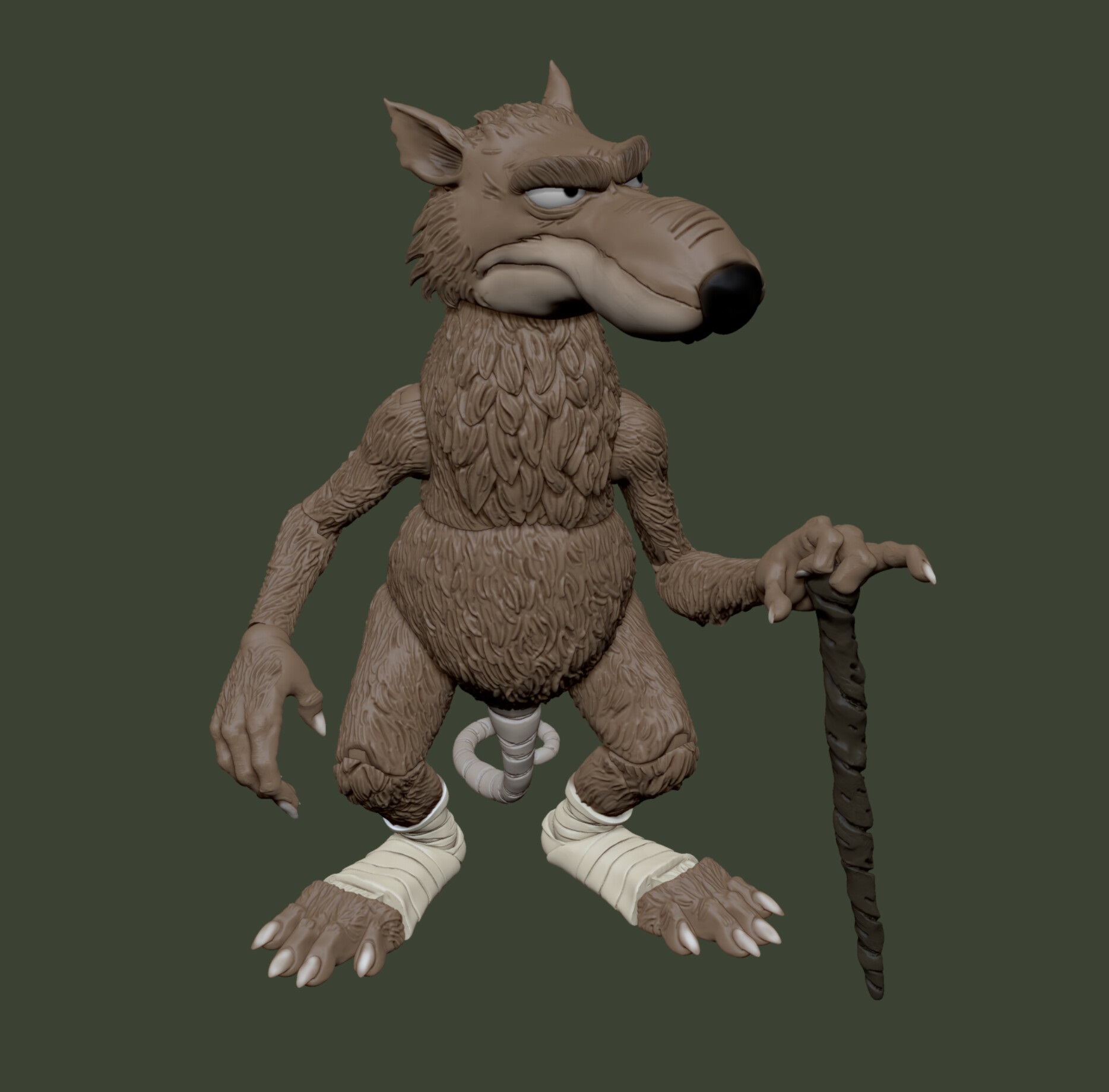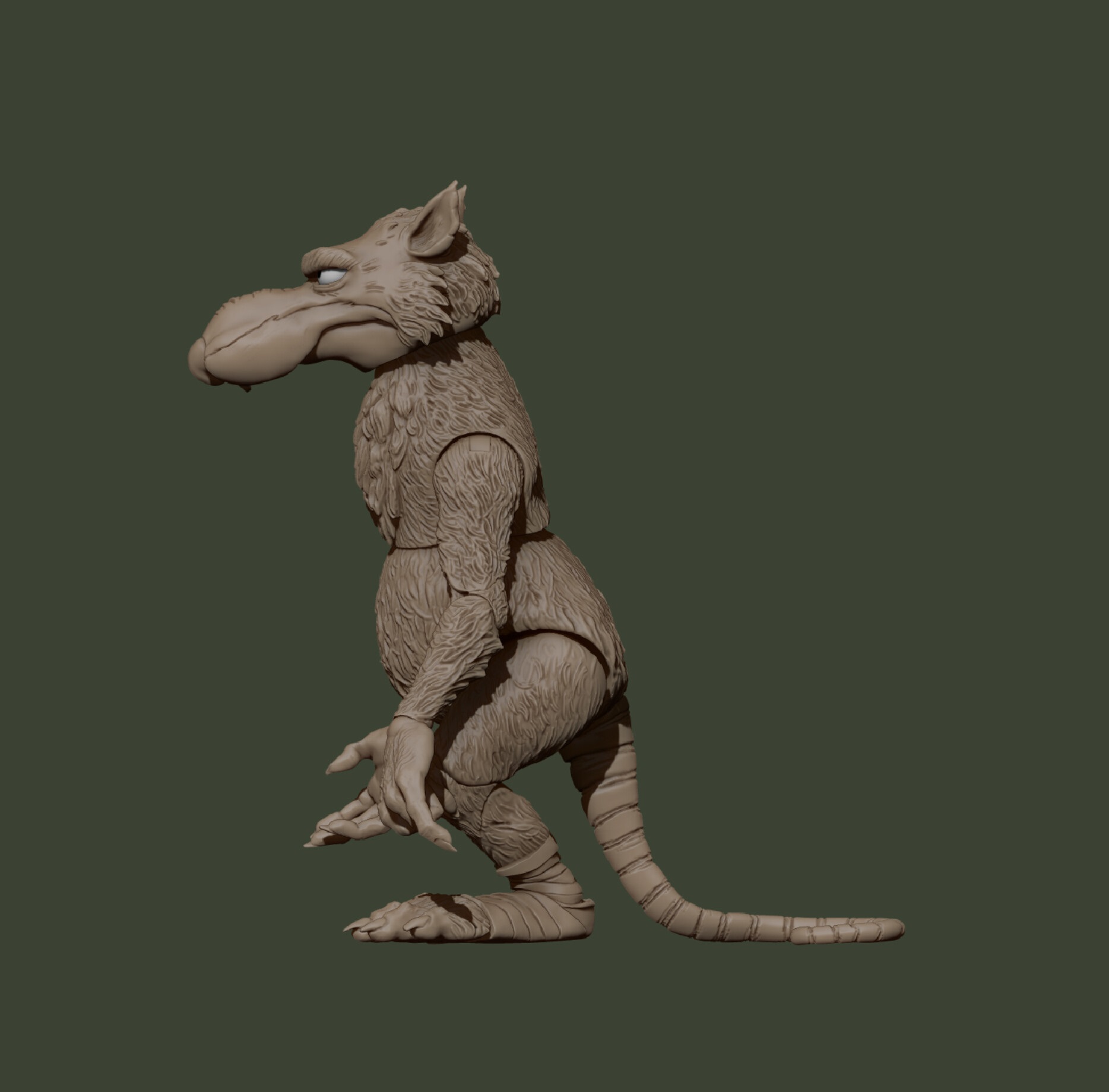 La figurine de Splinter a été sculptée informatiquement par Brodie Perkins à l’aide du logiciel Zbrush. Il en a publié le modèle numérique sur son réseau.