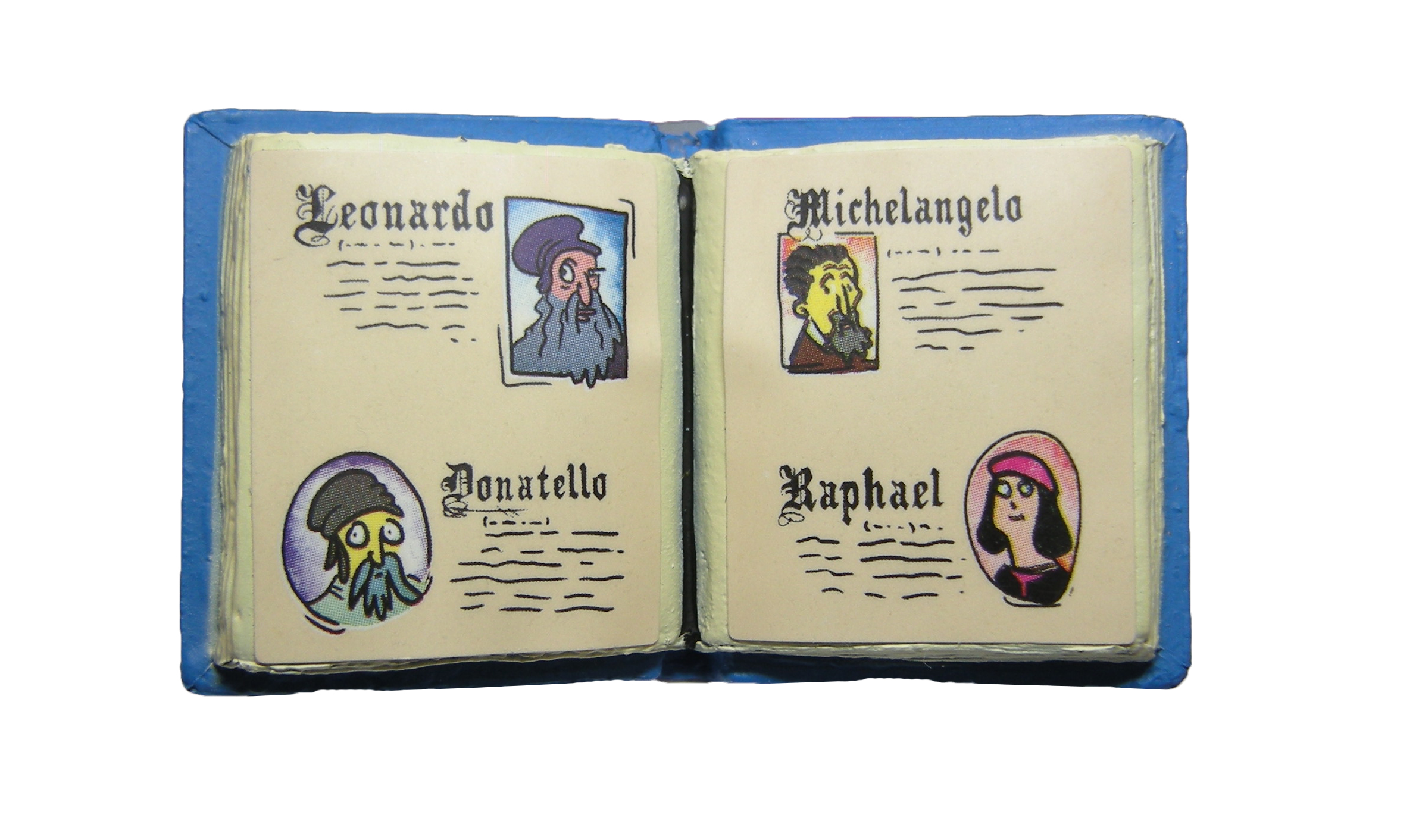 De cet épisode, nous retrouvons également les deux livres. L’un dévoré par les mites. L’autre est celui sur l’histoire de l’art, duquel Splinter a tiré les noms de ses quatre élèves. Ouvert à la page des grands artistes de la Renaissance, les illustrations sont des stickers collés à même les pages du livre.