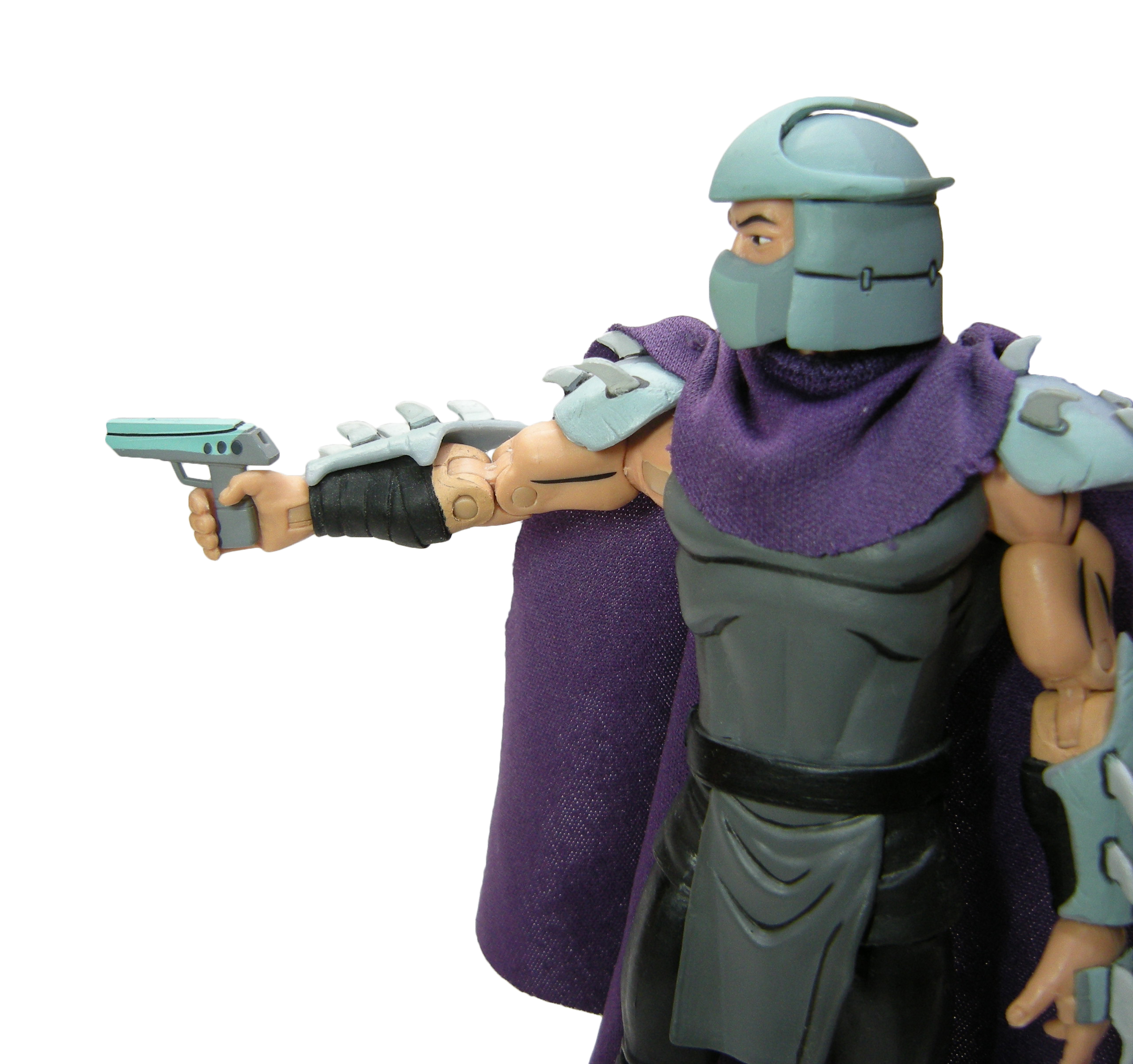 Le petit pistolet est le rayon rétro-mutagène de Shredder. Le grand rival avait défié les tortues pour qu’elles viennent le chercher dans son Technodrome, si elles voulaient espérer rendre son apparence humaine à leur maître (Un vrai combat de ninja, S1 E5).