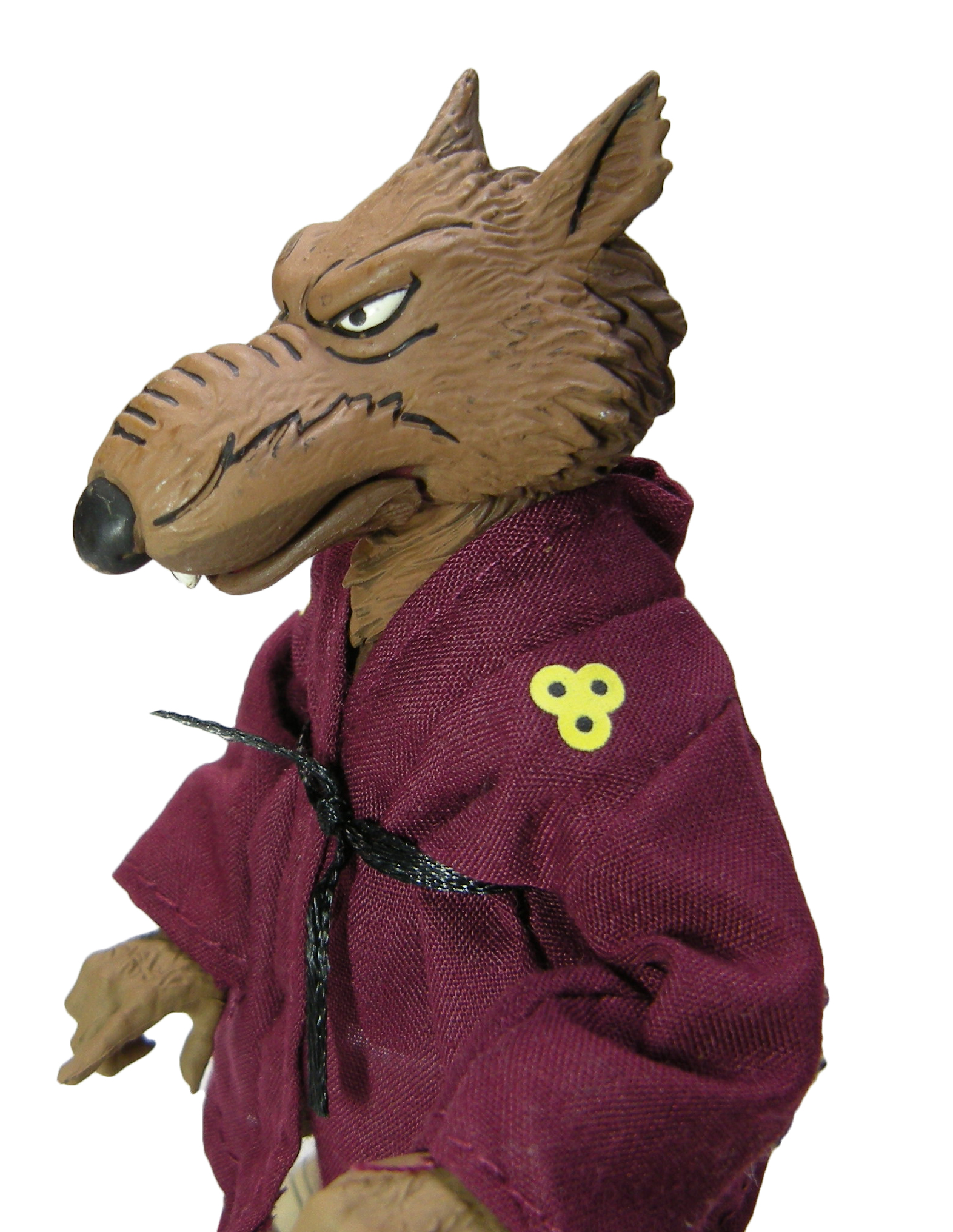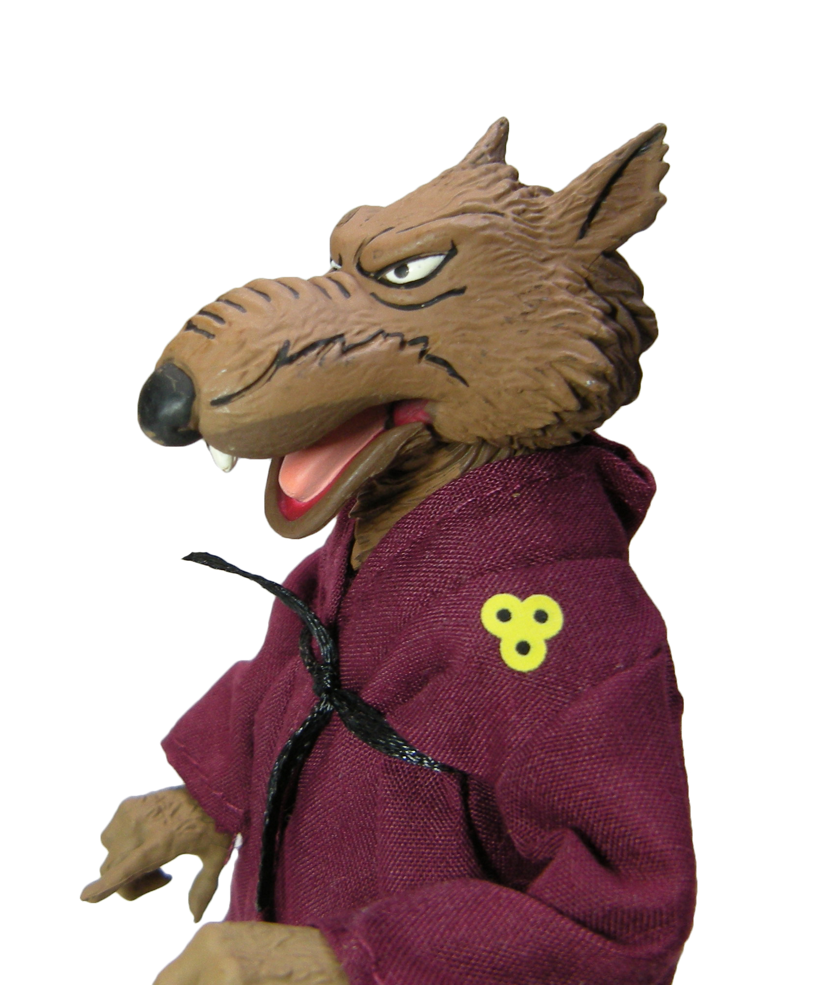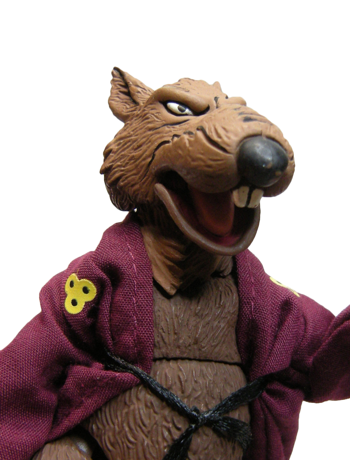 Vous pouvez retirer la robe de Spliner, ainsi que sa ceinture. Ceux qui suivent régulièrement mes reviews savent à quel point je déteste l’utilisation des tissus pour des figurines. Généralement, le tissu utilisé est trop épais par rapport à l’échelle de la figurine et ne fonctionne pas vraiment. Ici, la robe est réalisée dans un tissu très fin. Le rendu est loin d’être mauvais ! Nous retrouvons les symboles jaunes sur la poitrine, imprimés sur le tissu. En revanche, les plus connaisseurs auront noté l’absence du plan du repaire cousu à l’intérieur de la robe (Le kimono volé, S3 E33). Il s’agit toutefois d’un détail qui sera ajouté avec le pack de Wingnut et de Screwloose, à travers un petit sticker à coller. Personnellement j’éviterais, il sera totalement froissé avec les plis du vêtement sur le dos du rat.
