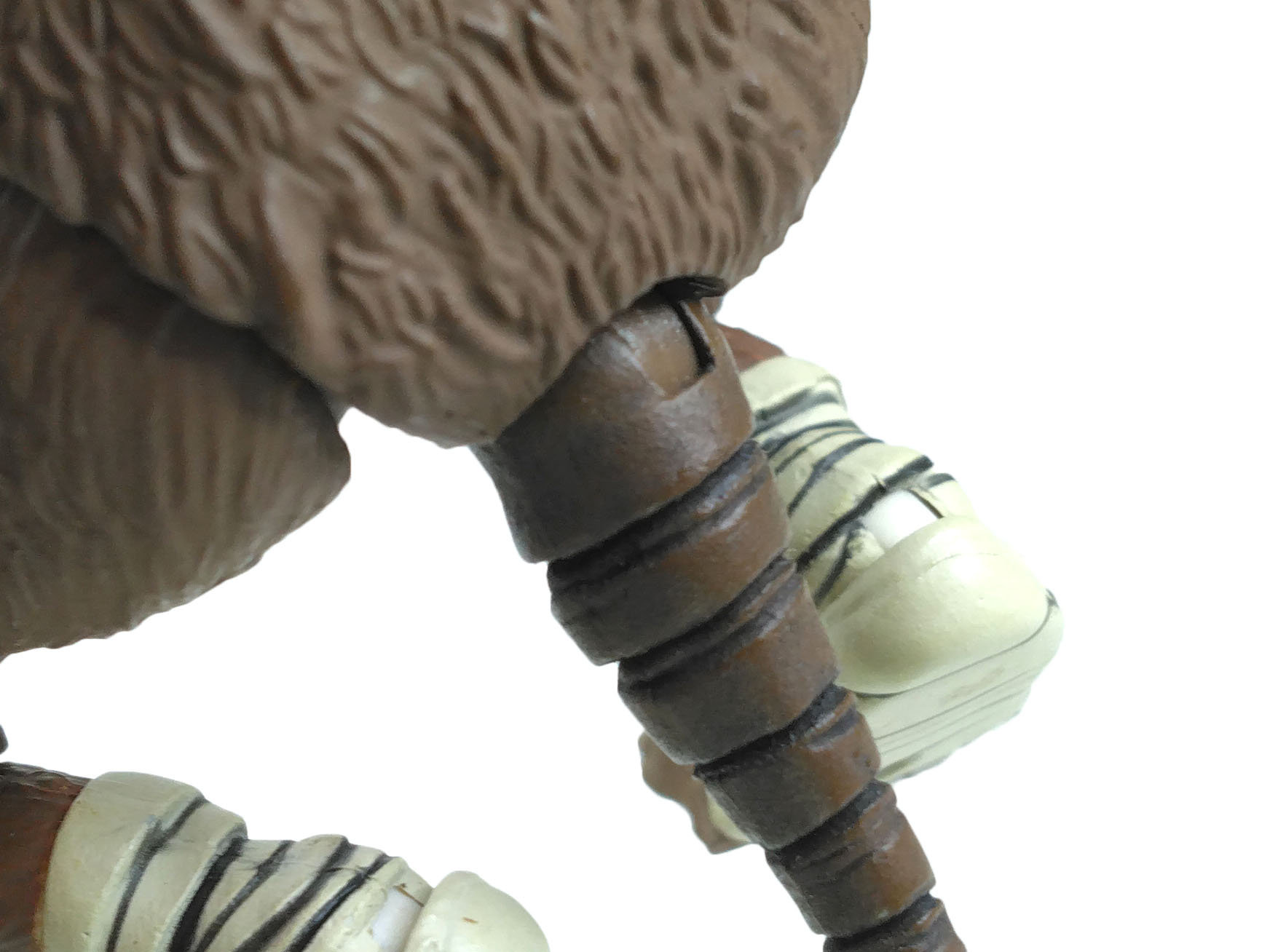 La totalité du corps est réalisée en plastique rigide. La seule exception est la queue, munie d’une tige de fer à l’intérieur. Réalisée dans un plastique malléable, vous pouvez apercevoir des perforations sur la partie inférieure de l’appendice. Ce sont les témoins des étais qui ont permis de fixer la tige dans la queue lors du moulage de celle-ci. Nous retrouvions déjà cette technique chez le Splinter du film de 1990 par exemple. Ou plus tard, dans cette gamme, chez le Pizza monster.
