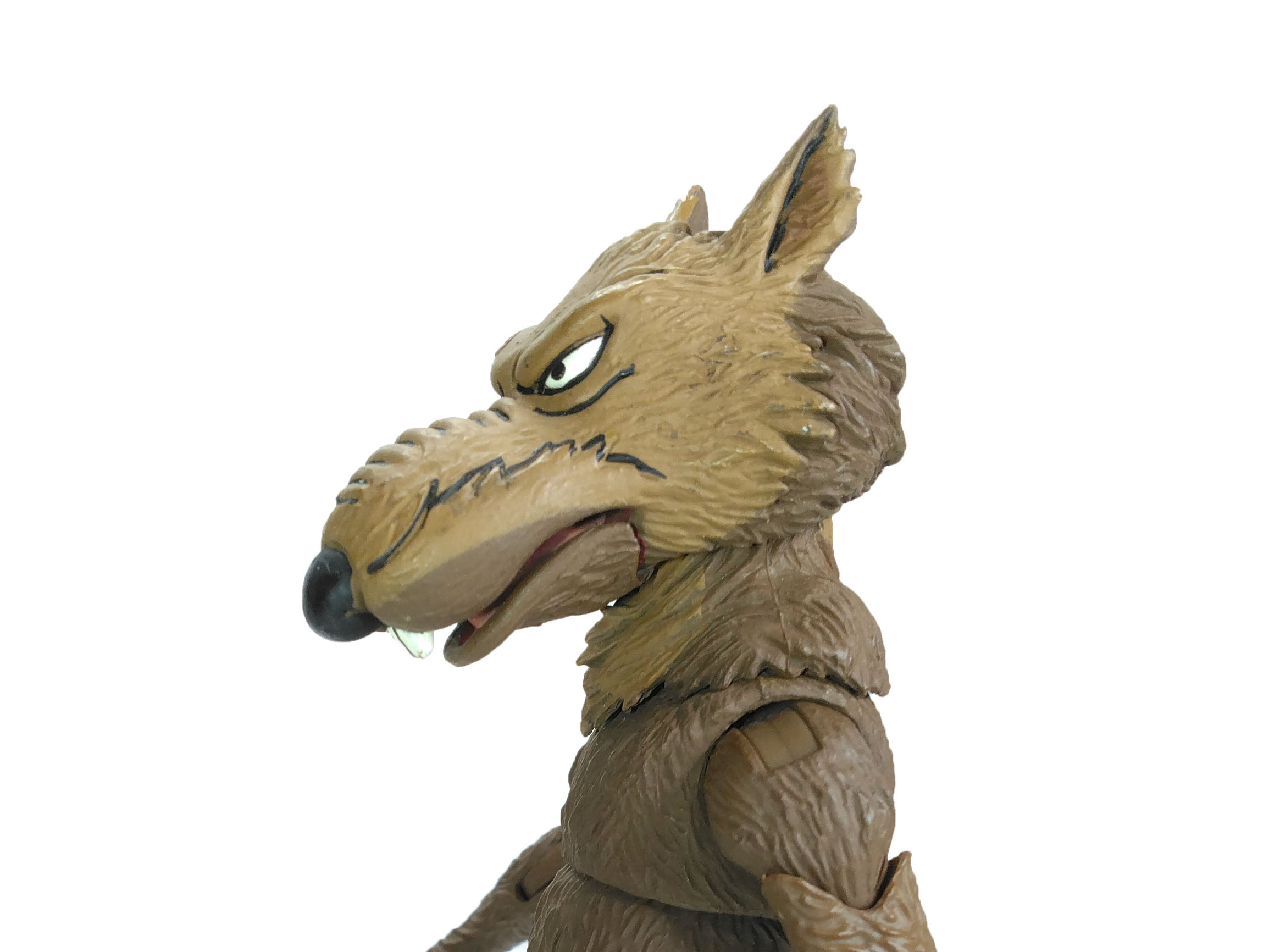 La peinture de la figurine est très sobre. La totalité du poil de Splinter est peint de brun clair. L’arrière est plus foncé afin de respecter le code bicolore de la gamme du dessin animé de NECA. Les détails du poil, les reliefs, sont rehaussés par des touches de peinture noire, comme au niveau des sourcils, de la moustache ou encore au-dessus de son museau.