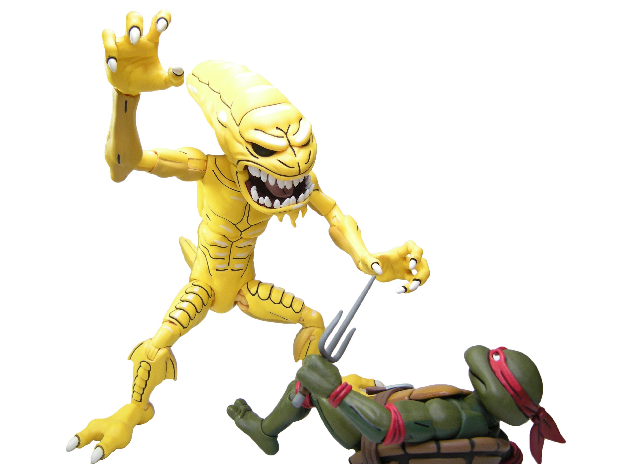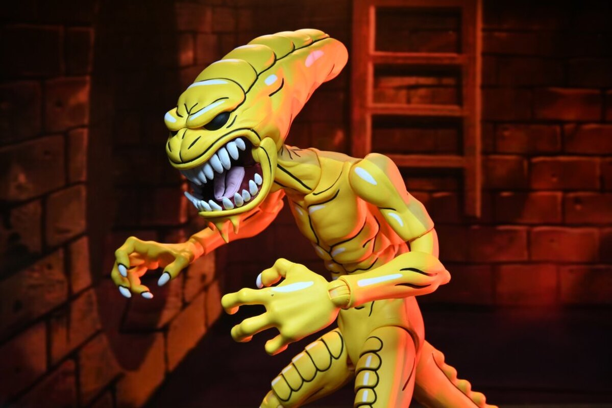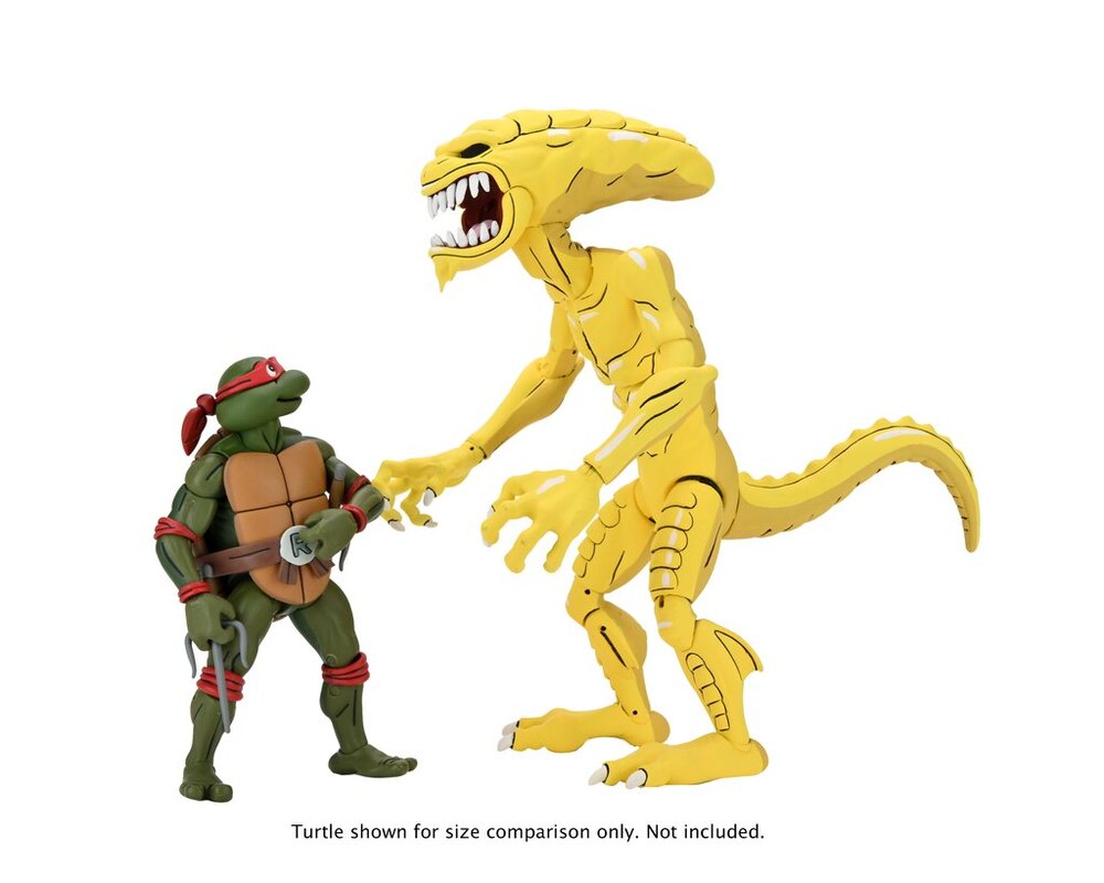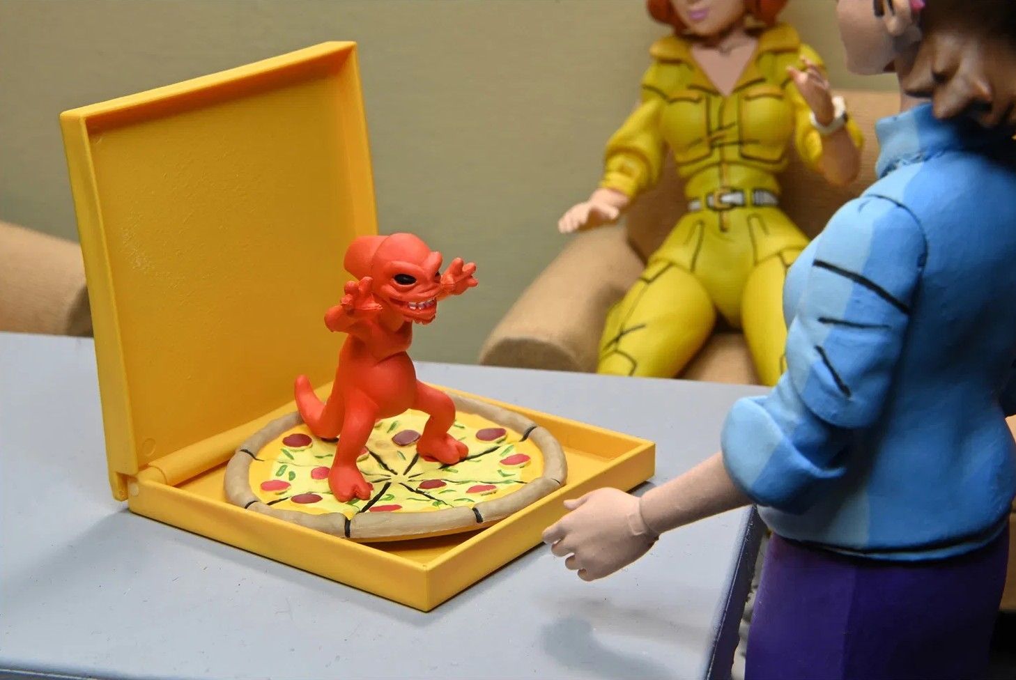 Déjà en 2016, le fabricant avait réalisé une figurine de Xénomorphe (Alien) entièrement jaune. Randy Falk s’en était amusé, ne cachant pas la référence aux Pizza monsters des TMNT. Avec l’arrivée de la gamme du dessin animé de 1987, NECA a teasé à de nombreuses reprises la possibilité de la création de cette figurine, principalement avec l’ajout d’un bébé Pizza monster à la Comic Con de 2019. La petite créature accompagnait la figurine d’April.