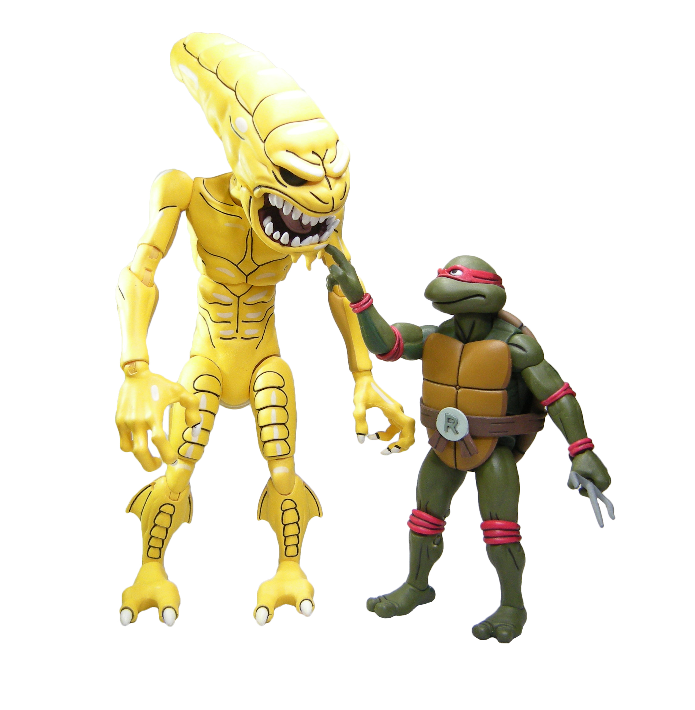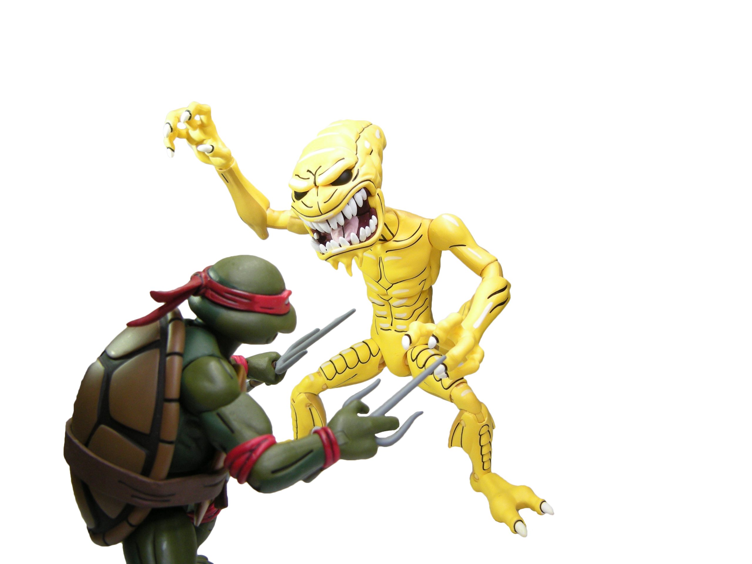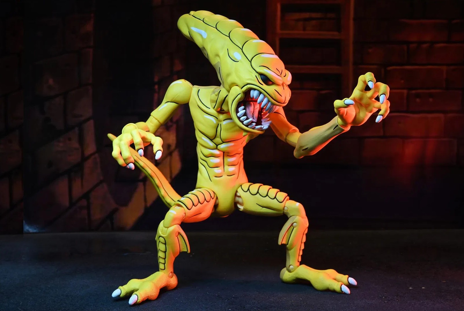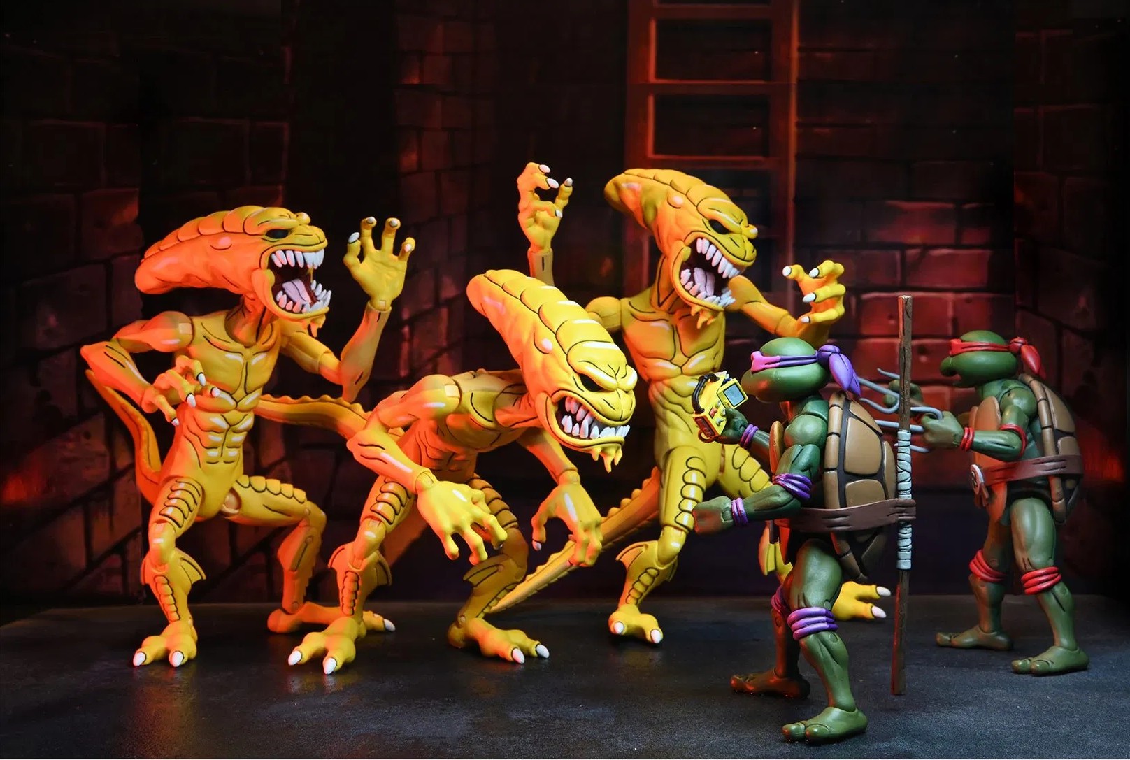 Déjà en 2016, le fabricant avait réalisé une figurine de Xénomorphe (Alien) entièrement jaune. Randy Falk s’en était amusé, ne cachant pas la référence aux Pizza monsters des TMNT. Avec l’arrivée de la gamme du dessin animé de 1987, NECA a teasé à de nombreuses reprises la possibilité de la création de cette figurine, principalement avec l’ajout d’un bébé Pizza monster à la Comic Con de 2019. La petite créature accompagnait la figurine d’April.