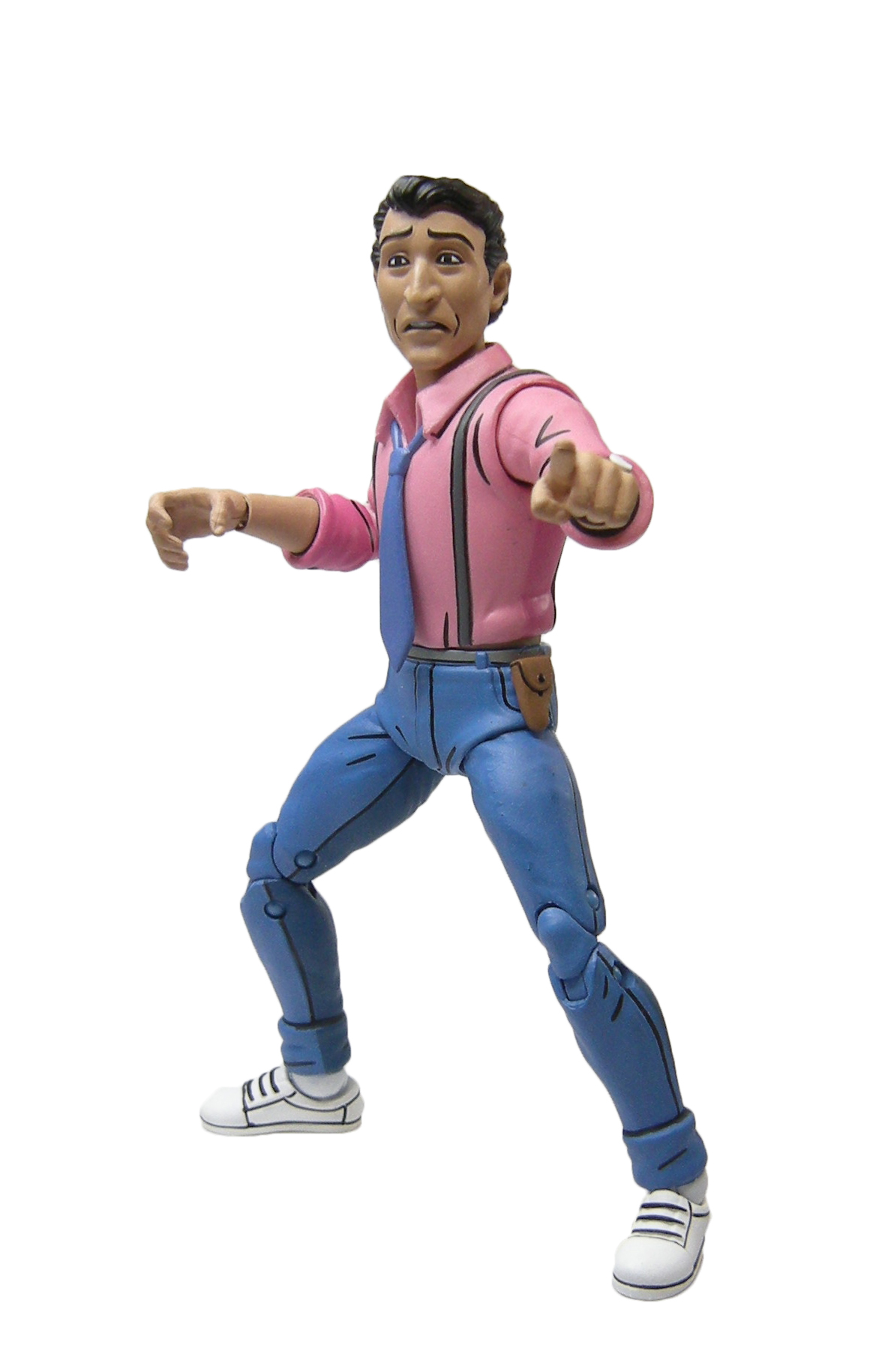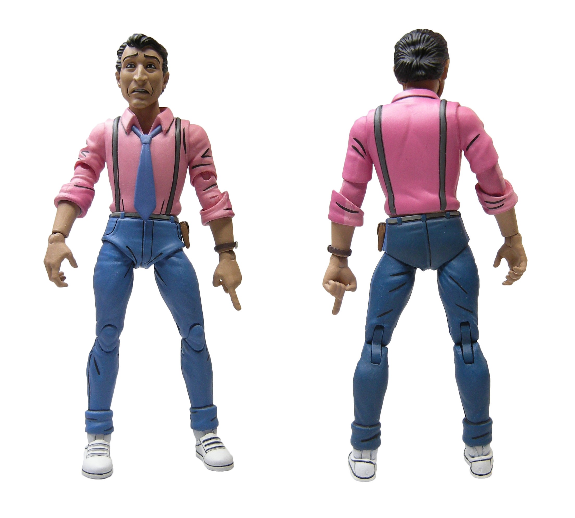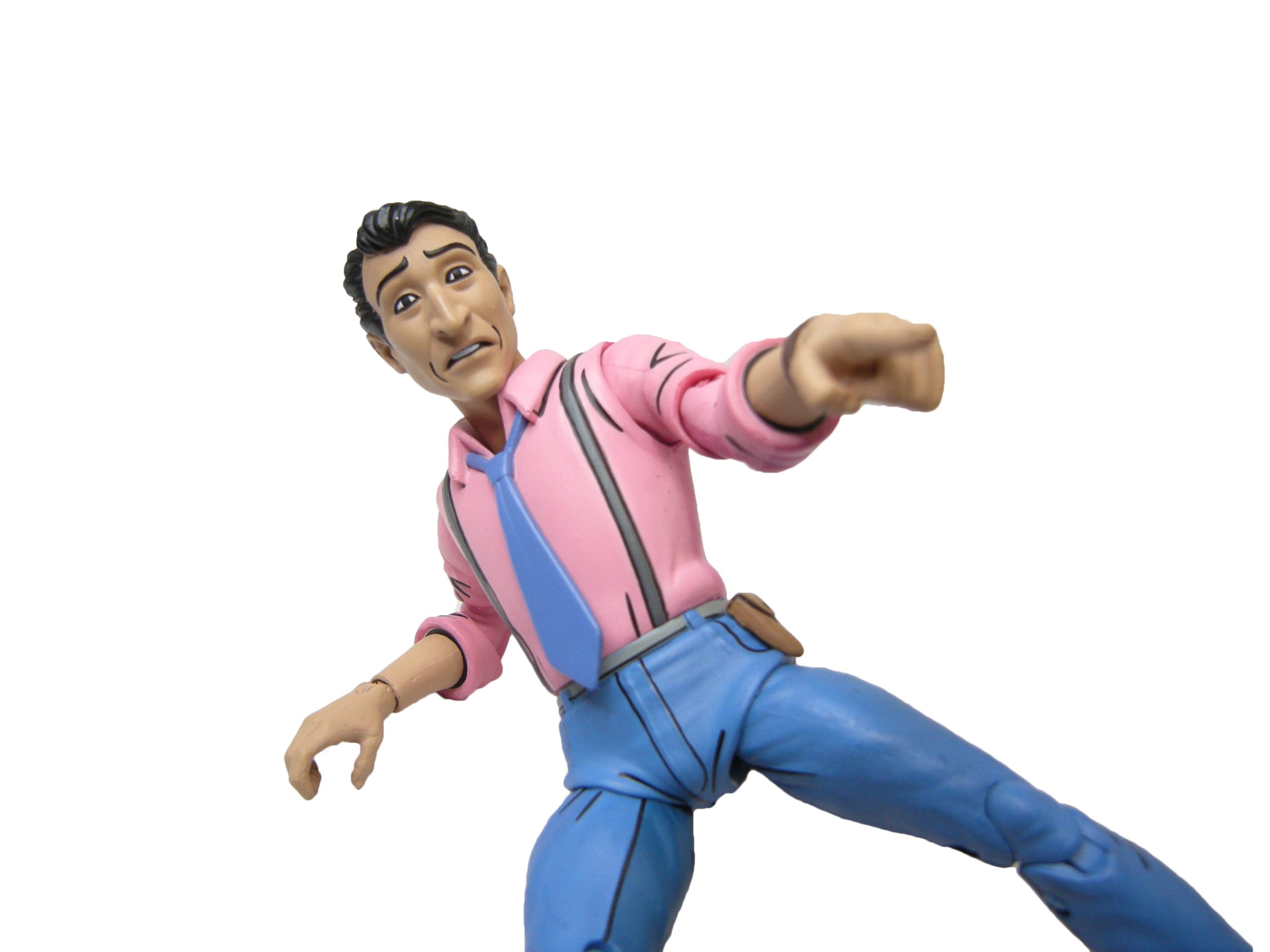 C’est le second élément qui permet de différencier cette version de Vernon de la précédente. NECA a proposé une solution variante économique, en peignant de manière légèrement différente son journaliste. Pour dire vrai, il est juste un peu plus clair. Le rose de la chemise du Vernon précédent était plus soutenu et son jean bien plus foncé, dépourvu d’ombrages. Je pense que la nouvelle version est donc plus fidèle à ce qu’étaient les couleurs du personnage dans le dessin animé. La cravate est également plutôt bleutée, contrairement à la précédente, grise.