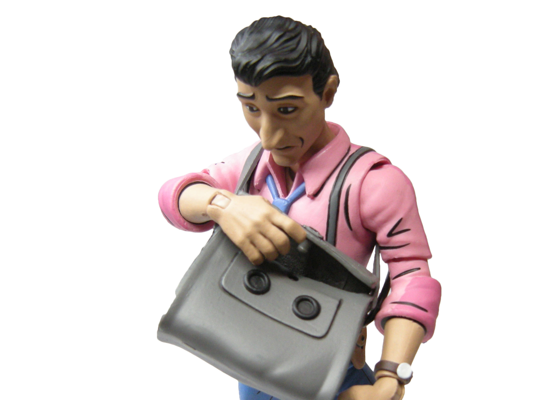La perche de captage de son est relativement petite. Pas très pratique de la faire tenir par la figurine tout en restant discrète au-dessus d’un autre personnage. Elle est rattachée à une sacoche qui peut s’ouvrir à l’aide d’une petite pression. Le casque audio est un ajout très sympathique que l’on pouvait voir au détour de certains épisodes, vissés sur la tête du journaliste (voir la photo de présentation de Vernon, ci-dessus). En revanche pas de caméra. Il n’y a d’ailleurs aucune caméra manuelle dans ce pack. C’est très dommage, si l’on n’a pas acheté la première version de Vernon !