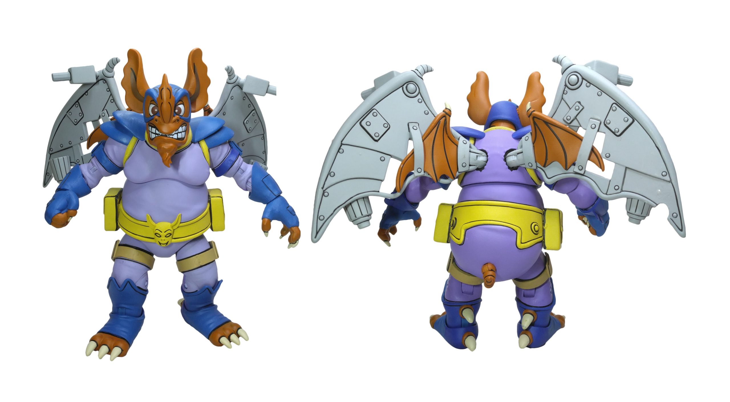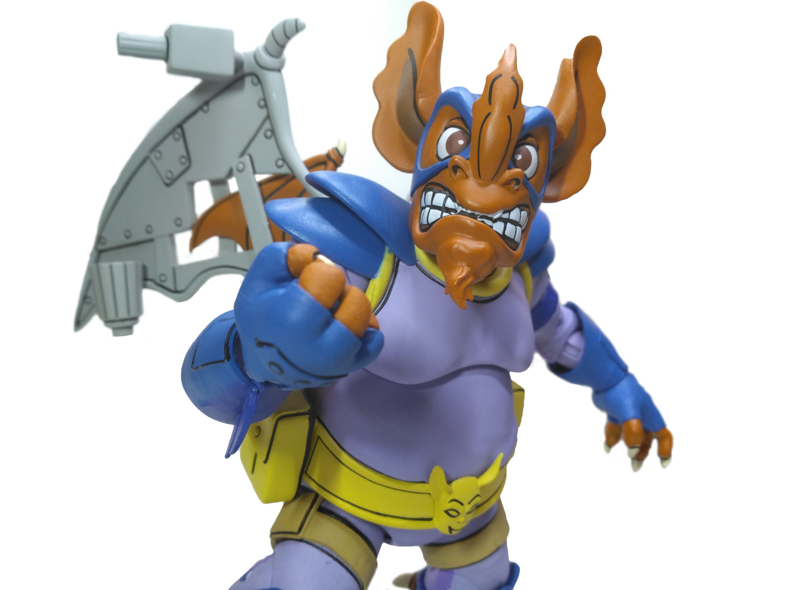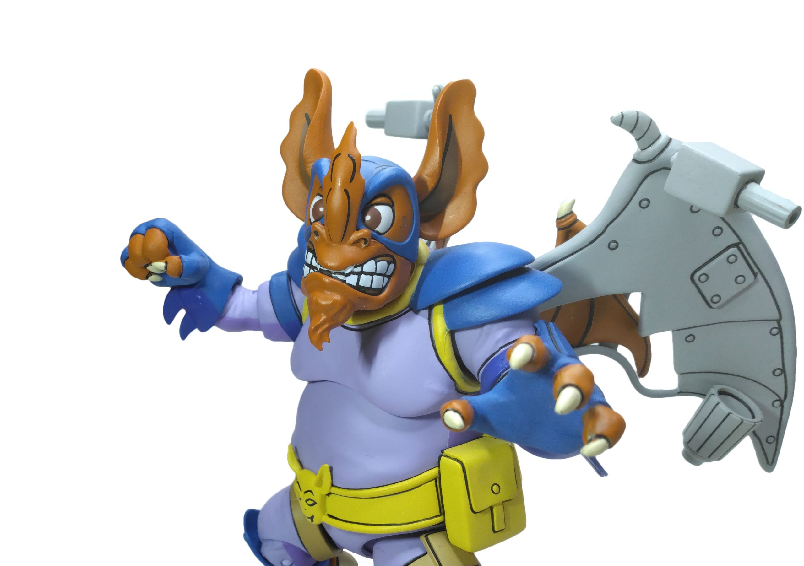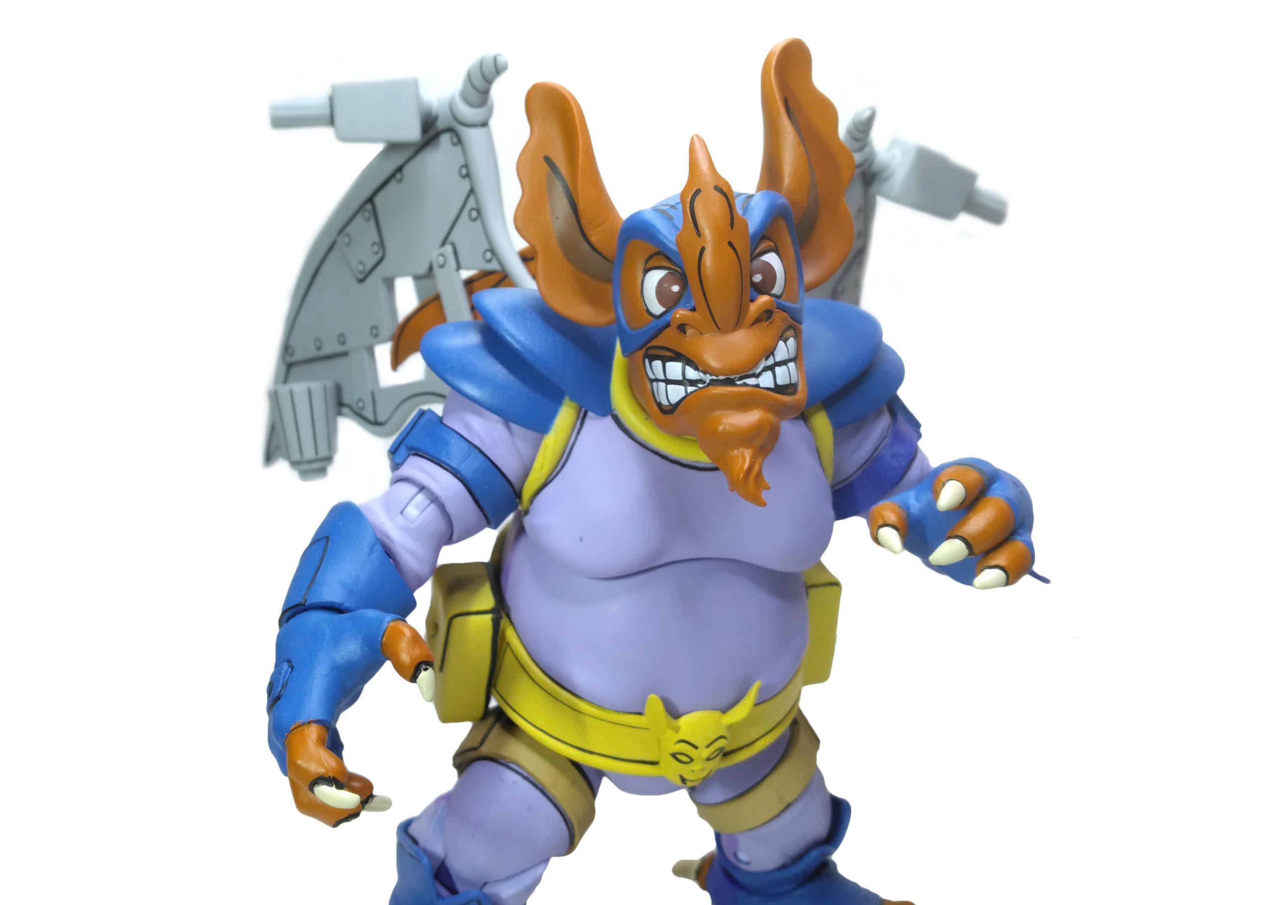 Notre Wingnut est très massif, ce qui explique la largeur de son blister. Imposant par son gros ventre et sa carrure, sa tête pourvue de longues oreilles, mais aussi à cause de ses ailes. Dans le dessin animé, la chauve-souris possédait des ailes atrophiées, comme chez TMNT Adventures. Pour combler ce handicap, il les avait recouvertes de plaques métalliques formant de plus grandes ailes. Tous les détails y sont ! Des jointures des plaques aux rivets, en passant par quelques éléments qui n’ont jamais été exploités dans la série comme des sortes de petites tourelles laser. Les ailes organiques sont maintenues par des sangles sur la partie dorsale. Détails que nous retrouvions finalement déjà chez le Wingnut de Playmates Toys.