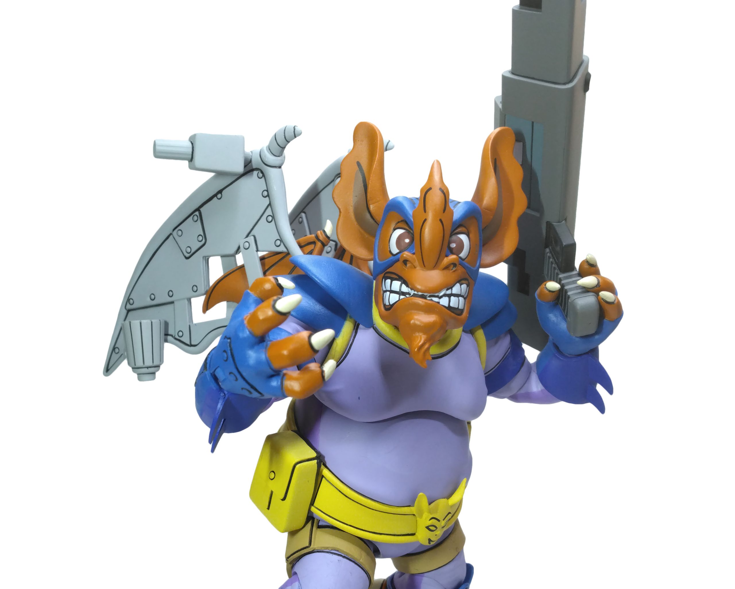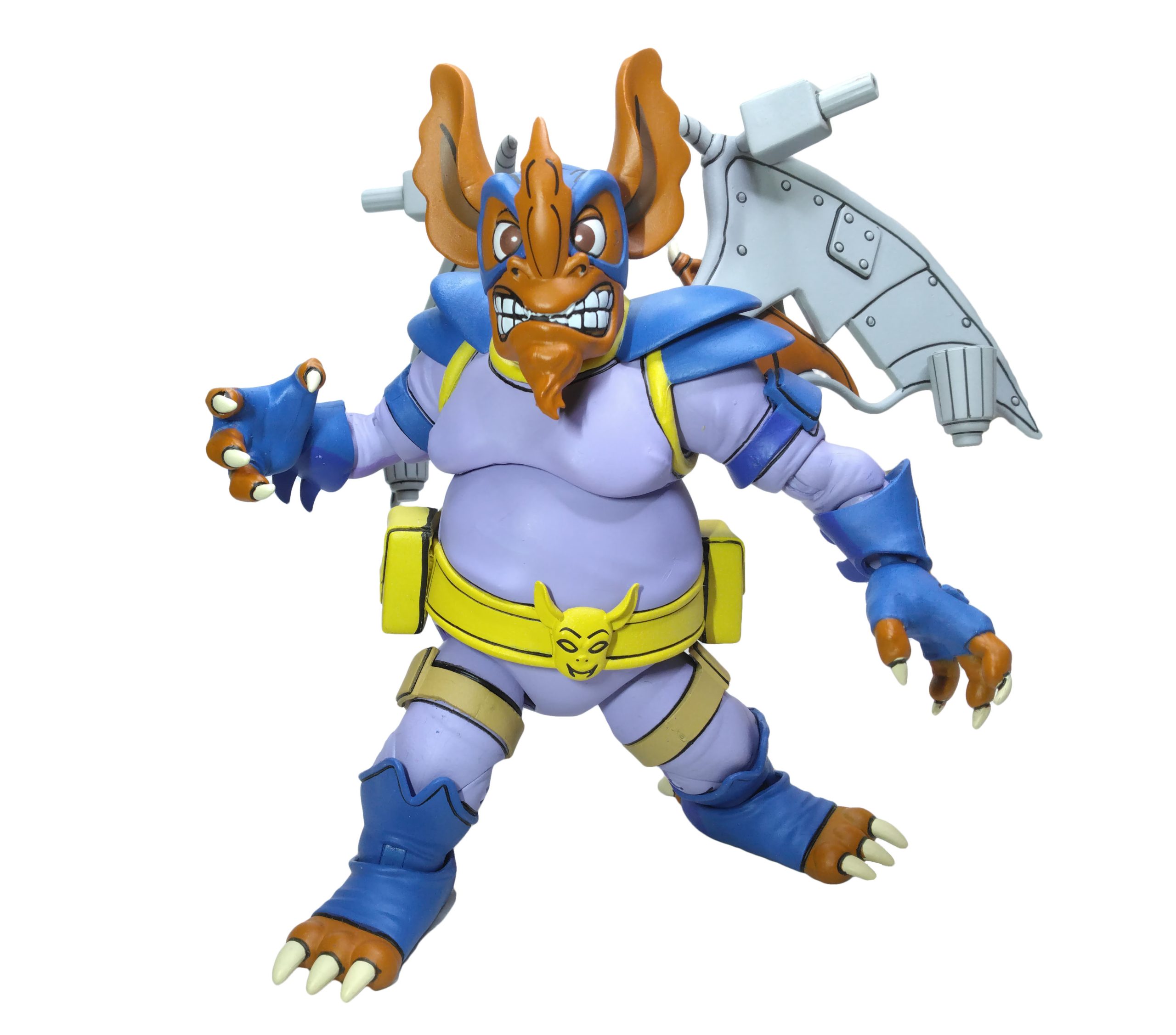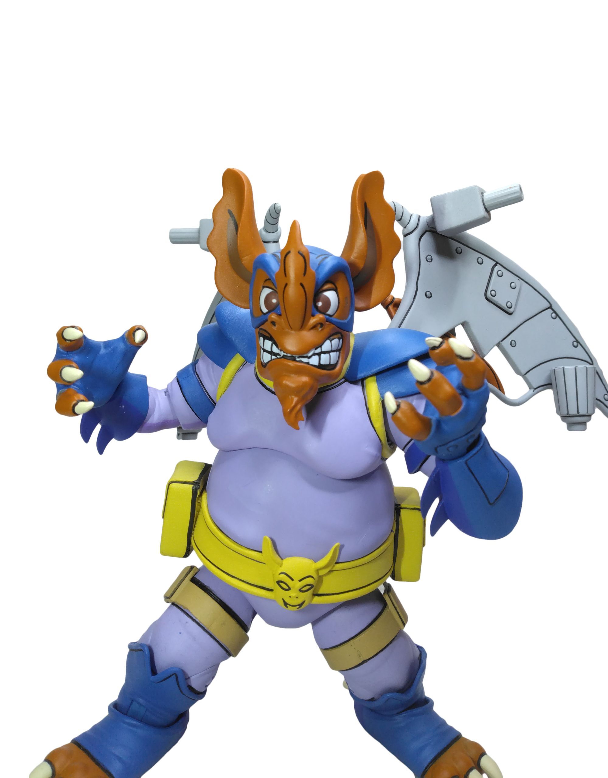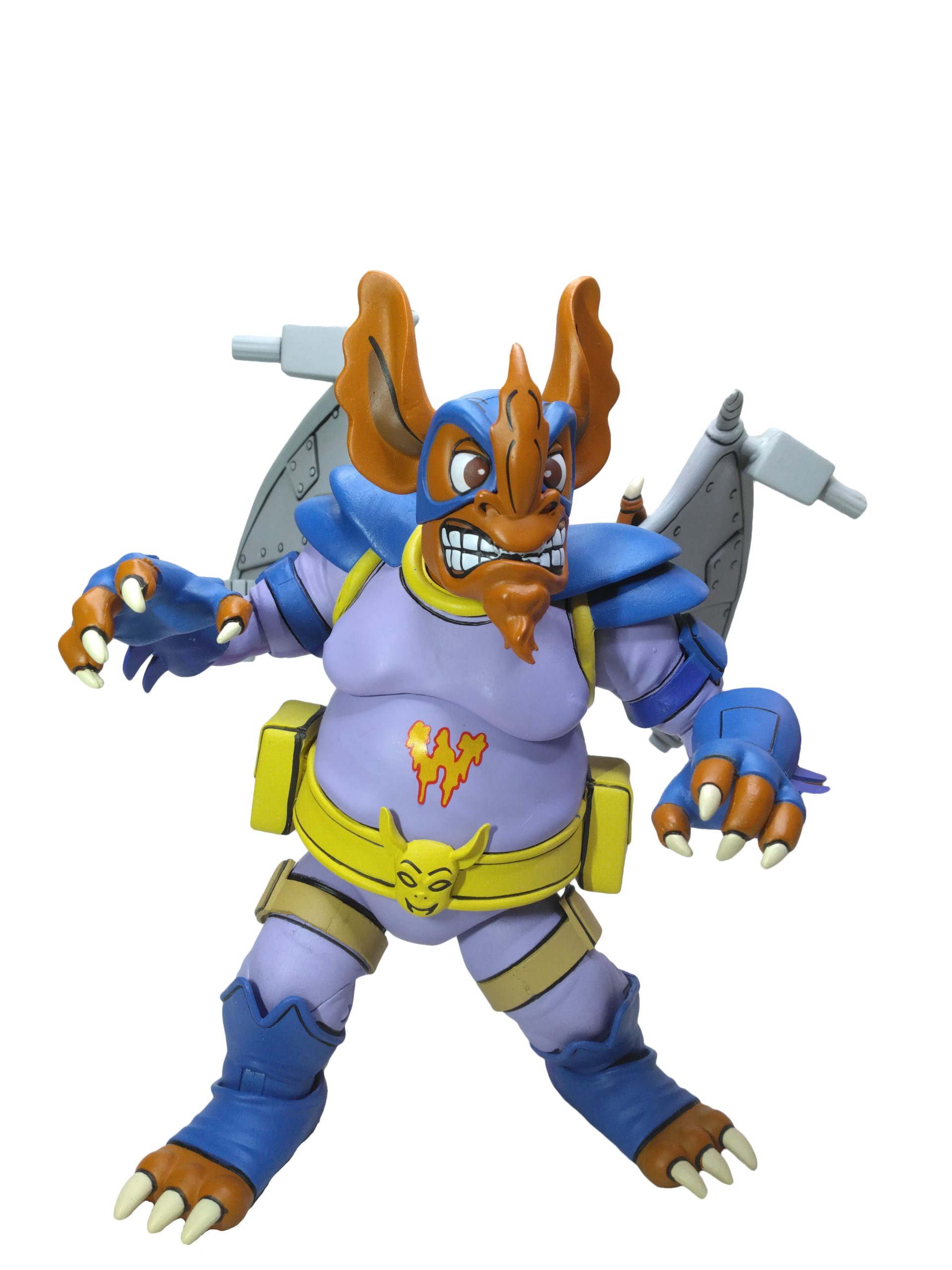 Notre Wingnut est très massif, ce qui explique la largeur de son blister. Imposant par son gros ventre et sa carrure, sa tête pourvue de longues oreilles, mais aussi à cause de ses ailes. Dans le dessin animé, la chauve-souris possédait des ailes atrophiées, comme chez TMNT Adventures. Pour combler ce handicap, il les avait recouvertes de plaques métalliques formant de plus grandes ailes. Tous les détails y sont ! Des jointures des plaques aux rivets, en passant par quelques éléments qui n’ont jamais été exploités dans la série comme des sortes de petites tourelles laser. Les ailes organiques sont maintenues par des sangles sur la partie dorsale. Détails que nous retrouvions finalement déjà chez le Wingnut de Playmates Toys.