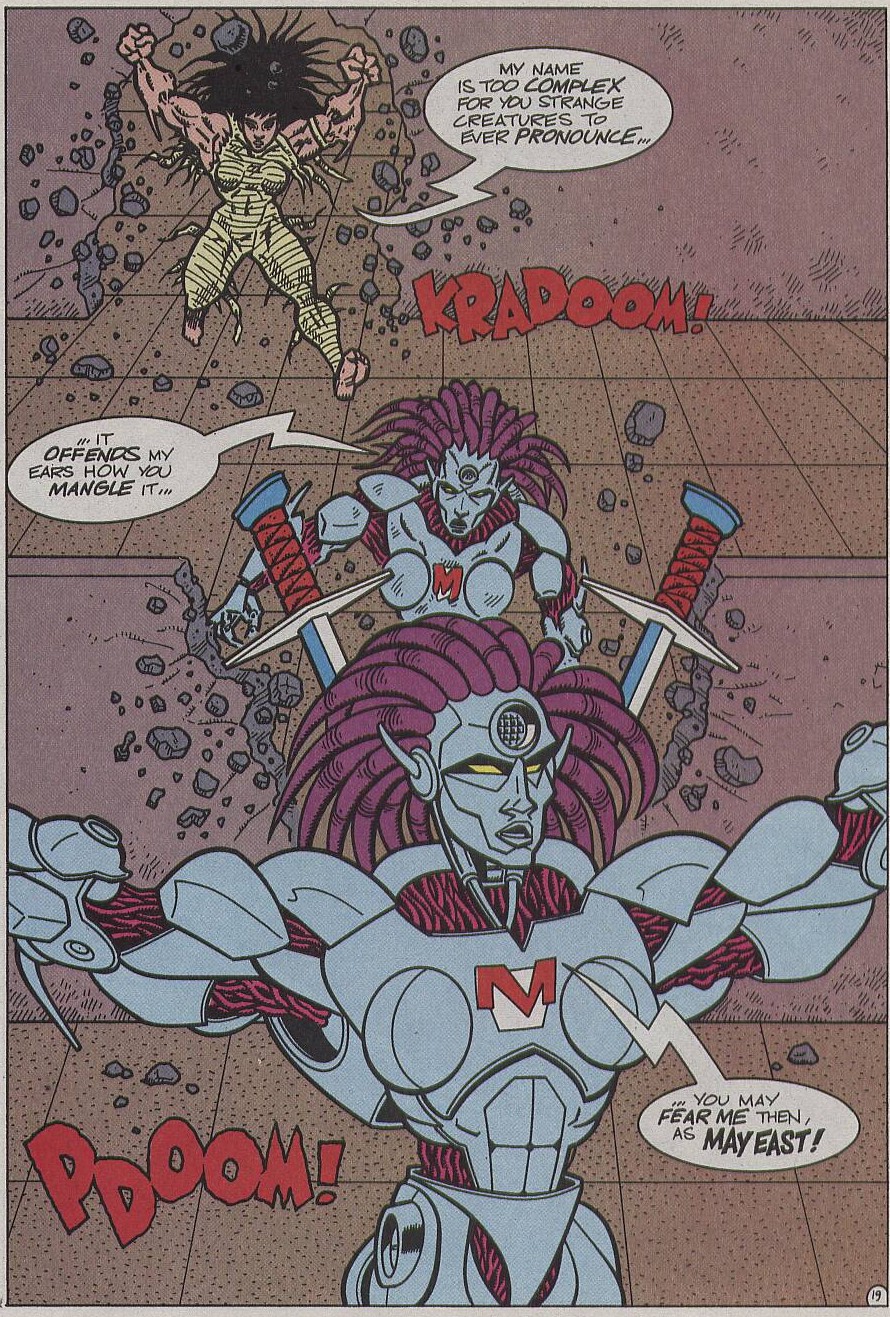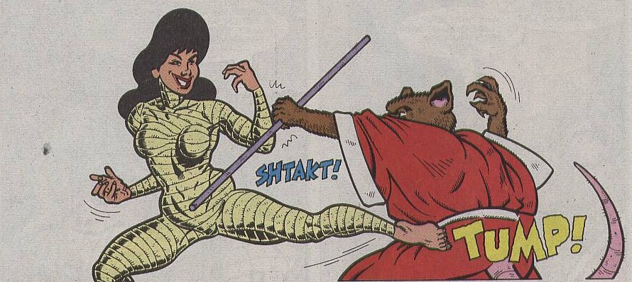 Bientôt, la journaliste devenait un robot géant à son tour et partait au combat, dotée d’une épée. Prenant le dessus sur son adversaire, elle s’apprêtait à lui planter sa lame dans le ventre, lorsque soudain, les deux adversaires retrouvaient leur apparence et leur taille normale. Le combat était terminé. Splinter et les tortues cherchaient leur amie dans les bois. Des traces de pas menaient au temple où May East s’était réfugiée. Les tortues ne parvenaient pas à forcer la porte, protégée. Il valait mieux s’en aller que s’éterniser ici.