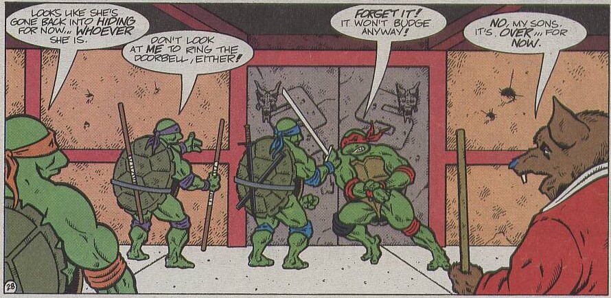 Pire encore, le TMNT A. #58 présente un Michaelangelo enfant en train de ramasser des déchets dans les égouts pour les jeter à la poubelle. Dans ces déchets, se trouve un exemplaire d’un comic nommé « The May East saga », faisant très clairement allusion à un vulgaire bout de papier qui ne mérite que de finir aux ordures.
