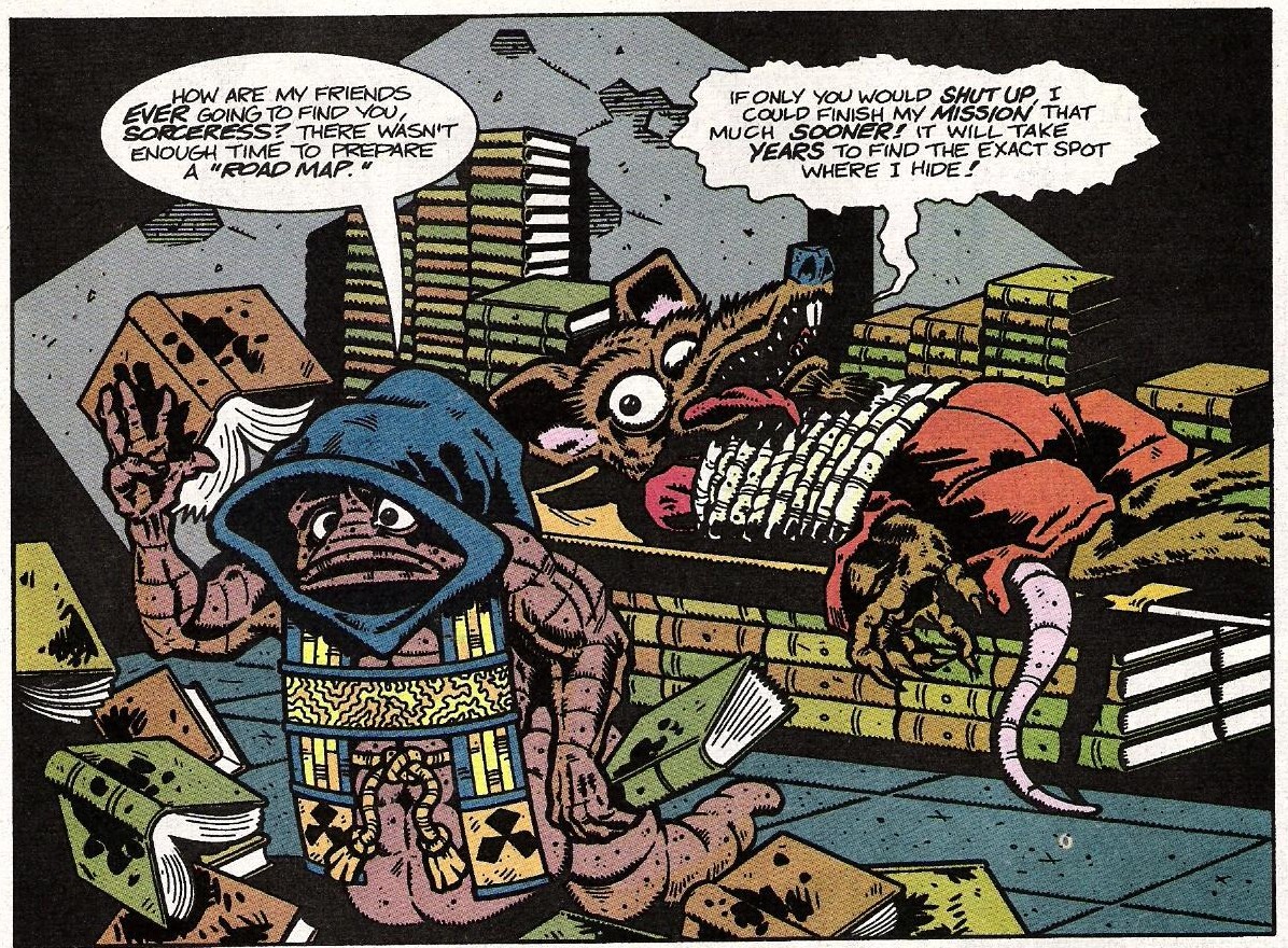 Les tortues s’étaient faites prendre par les cheveux de la sorcière, et ne parvenaient plus à l’approcher. Bookwurm eut l’idée de souffler de la poussière de ses vieux livres sur Splinter, qui se mit à éternuer. Cela provoquait une nouvelle secousse, obligeant May East à lâcher prise. Les tortues et April se sentaient étranges, comme si leur corps changeait. Ils sentaient qu’il grandissait de nouveau, petit à petit. Ils devaient sortir du corps de Splinter au plus vite !