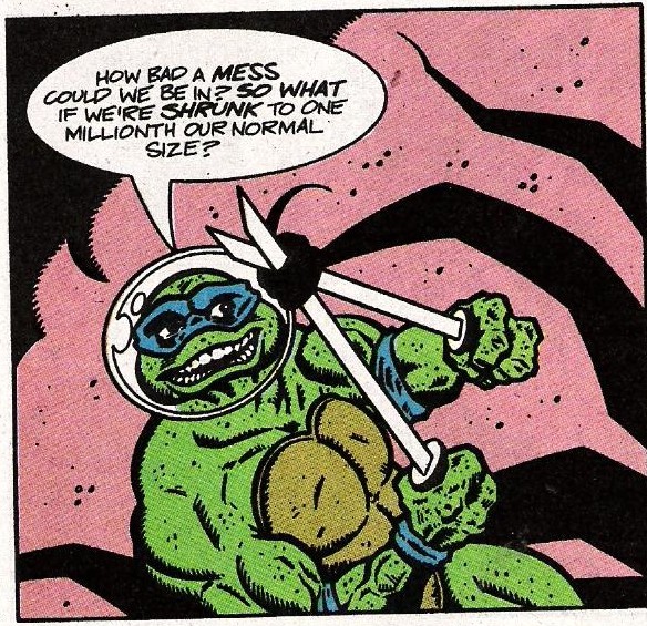 Si le design des tortues a beaucoup changé au cours des trois numéros de cette mini-série, cette fois le dessinateur Fingerman s’est probablement inspiré des figurines Movie stars de Playmates Toys pour réaliser les quatre ninjas. On retrouve de nombreuses similitudes, tant au niveau des coudières et des genouillères, de la forme des muscles des bras, que les visages, et même une tentative de restituer la texture de la peau à travers un mouchetage à l’encre. Il est d’ailleurs très clair que les visages de Leonardo et de Michaelangelo en pages 14 et 17, respectivement, sont inspirés des figurines.