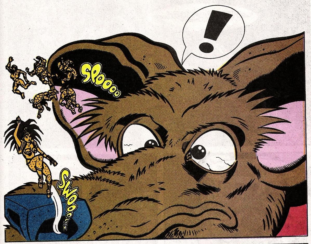 La sphère qui contenait April et les tortues descendait à toute vitesse dans l’oreille du rat. Les cinq compagnons avaient le sentiment d’être une balle dans un flipper. Pour progresser jusqu’au cerveau sans trop de secousses, la jeune femme se servait de la pierre magique pour leur apporter un bocal sur la tête, et sortir de cette sphère. Les secousses ressenties par le tympan, à chaque fois que Bookwurm s’adressait à Splinter, essayant de faire revenir le rat, rendaient le lieu de plus en plus périlleux.