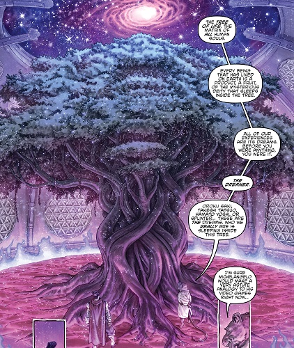 Les deux amis arrivèrent devant une immense porte taillée dans une falaise. Si elle prenait la forme du caractère de la personne qui vivait dans sa réalité de l’après-vie, ce qui se trouvait derrière était commun à tous. Poussant la porte, ils entrèrent dans une pièce abritant un immense arbre au tronc torsadé. Splinter expliqua à son ami qu’il s’agissait de l’Arbre de vie. La vie de chaque être amené à aller sur Terre se trouvait au sein de cet arbre. Les rêves de cet arbre étaient la vie que mènerait chaque être vivant. Et si la vie d’Oroku Saki avait été aussi tumultueuse, ce n’était pas de son propre fait, mais bien que son corps avait dut coexister avec deux esprits, dont un fortement maléfique.