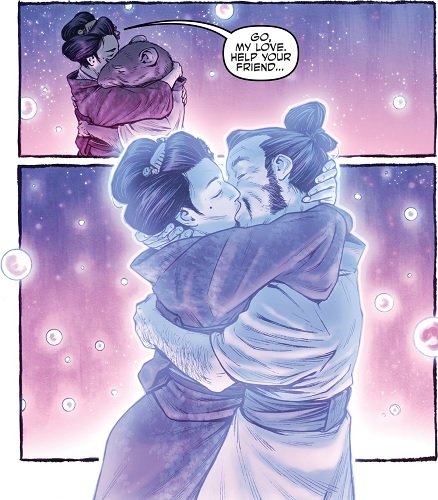 Si Splinter l’avait amené ici, à présent c’était à Saki de lutter contre Tatsuo et le dieu Dragon et faire ses propres choix. Saki était surtout décidé à présent à suivre la voie qu’il choisirait lui et non plus se faire guider par la voix invasive de Tatsuo. Il devait retrouver au plus vite Kitsune, telle était sa promesse envers la femme avant de se donner la mort. Voyant son ami s’enfuir au plus vite de la salle dans laquelle ils se trouvaient, Splinter poussa un soupir. Il aimait cette femme et ferait tout pour être auprès d’elle. Au même moment, apparut Tang Shen. Enlaçant son époux, elle lui demanda de veiller sur son vieil ami et de sauver le monde par la même occasion.