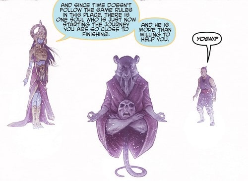 Shredder n’était effectivement pas encore parti. Le Dreamer s’entretenait avec lui sur le plan astral. Elle reconnaissait que Kitsune avait réalisé un travail remarquable, faisant de Saki un être bien supérieur aux autres humains. Il possédait en outre ce que le Dragon n’aurait jamais ; l’amour. Que Kitsune le veuille ou non, elle l’aimait. Et un Dieu regrettait souvent la solitude. Le voyage d’Oroku Saki était sur le point de s’achever, celle d’une autre âme, Hamato Yoshi, allait débuter. Le rat apparut à Saki, méditant sur le plan astral pour lui parler. Son crâne se trouvait entre ses jambes, artefact avec lequel il parvenait à communiquer avec son vieil ami. Le rat lui demandait une aide, un conseil, pour en venir à bout du dragon qui s’apprêtait à surgir dans le monde des vivants (TMNT #99). Pour cela, Oroku Saki avait besoin de revenir également sur Terre et ainsi tenir la promesse faite à Kitsune.