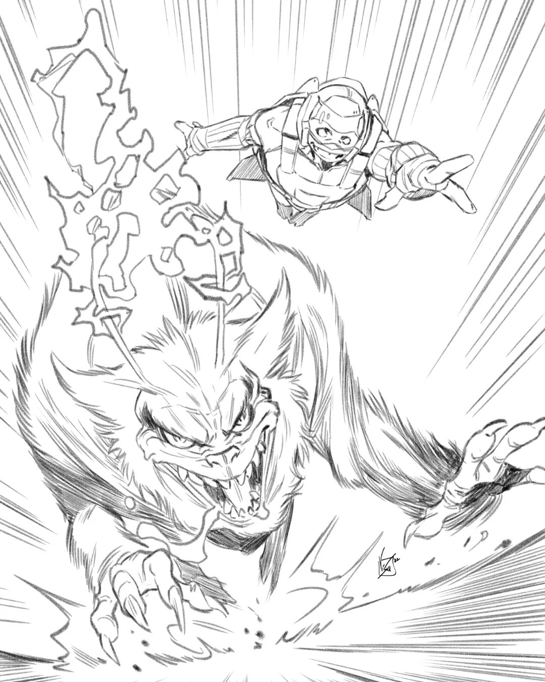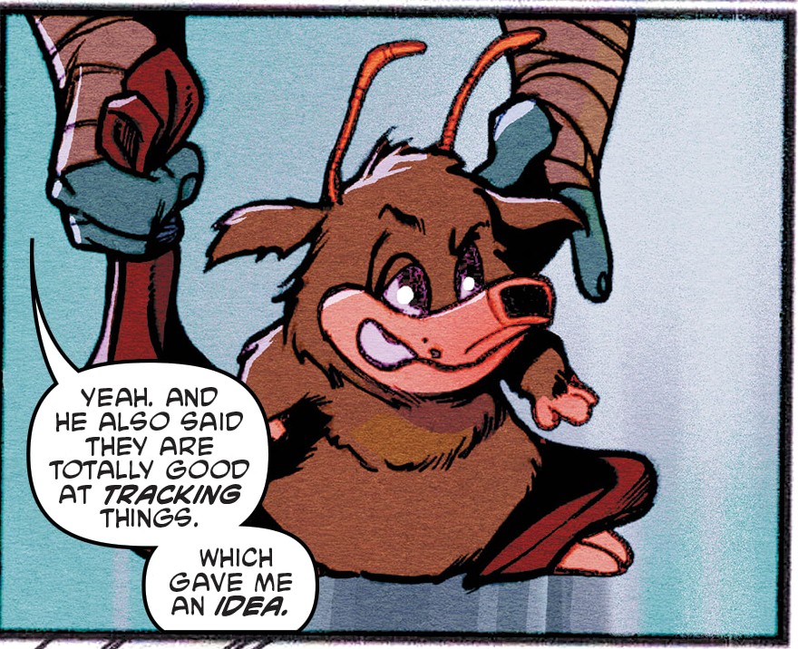 Les neutrinos se mettaient aussi à la chasse de Zixx, sans succès. Personne ne trouvait le contrebandier. Luna Azul mettait quant à elle le pied sur une mine à fumée qui lui faisait perdre sa concentration pour un moment. Les nouvelles continuaient d’être mauvaises. Trip prévenait ses amis qu’à chaque fois qu’ils tiraient sur un hologramme, trois autres apparaissaient. Ils devraient trouver une autre solution pour l’appréhender. Soudain, Michelangelo eut une idée brillante en repensant à sa formation avec Oroku Saki. Il regagnait le vaisseau où se trouvait le grybyx et lui donnait quelque chose à manger. La petite créature se transformait en monstre touffu. Avec son apprentissage, le ninja parvenait à la contrôler par les pensées et se servait de son redoutable flair pour retrouver Zixx. Sans perdre de temps, l’animal partait à la recherche du contrebandier, tel un limier. Il ne tardait pas à le retrouver. De ses antennes, il faisait léviter l’homme au-dessus du sol. S’apprêtant à la réduire en charpies, Michelangelo s’empressait de reprendre le contrôle de l’animal et de lui faire regagner sa taille inoffensive. Torbin Zixx était capturé.
