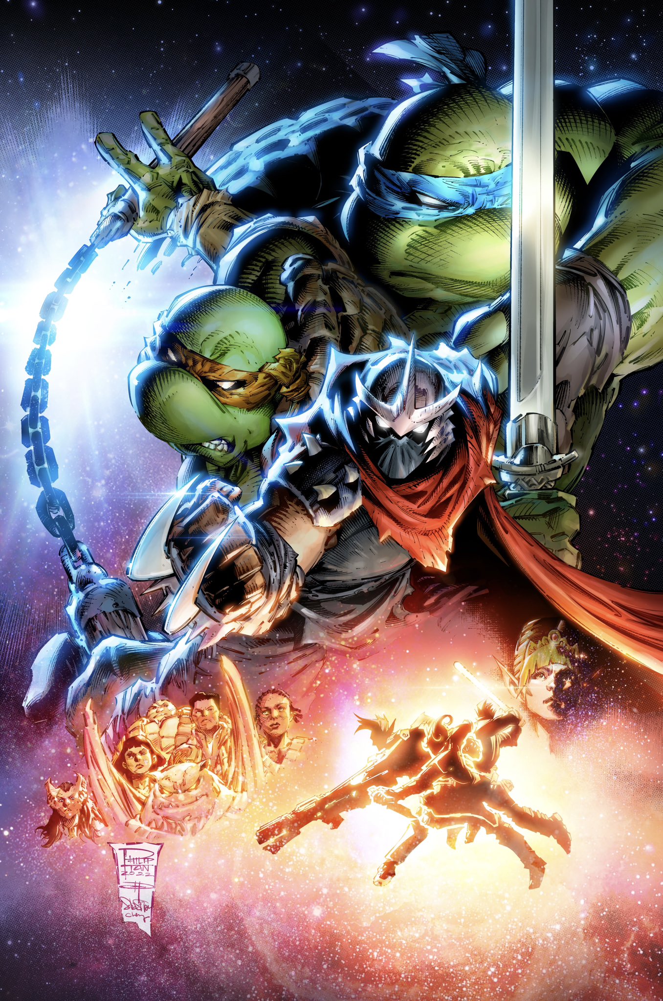 Pendant leur voyage intergalactique à bord de Cudley, Saki entraînait Leonardo. Il voulait que la tortue parvienne à invoquer et révoquer à sa guise sa version obscure. Une fois l’invocation réalisée, les deux guerriers s’offraient un combat d’entraînement. L’invocation de Leonardo s’améliorait largement depuis Northampton (TMNT #132).