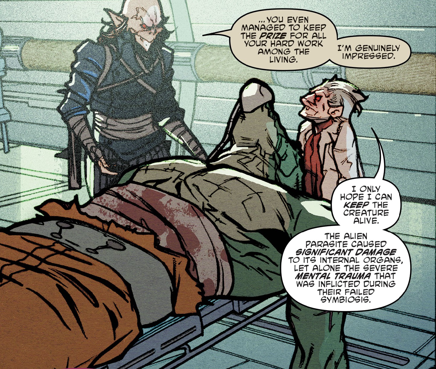 Dans les quartiers de l’EPF, le Rat King retrouvait le docteur Barlow, qui avait de bonnes nouvelles. Il était parvenu à dissocier Krang de Leatherhead. Si l’utrom s’en était sorti, l’alligator était loin d’être sorti d’affaire. Il le voulait vivant, mais l’état du reptile restait préoccupant. Une grande partie de ses organes avaient été touchés par l’invasion parasitaire de l’extraterrestre. Il espérait que le ooze circulant dans ses veines parvienne à le guérir rapidement. En revanche, il s’était bien aperçu des problèmes de Leatherhead.