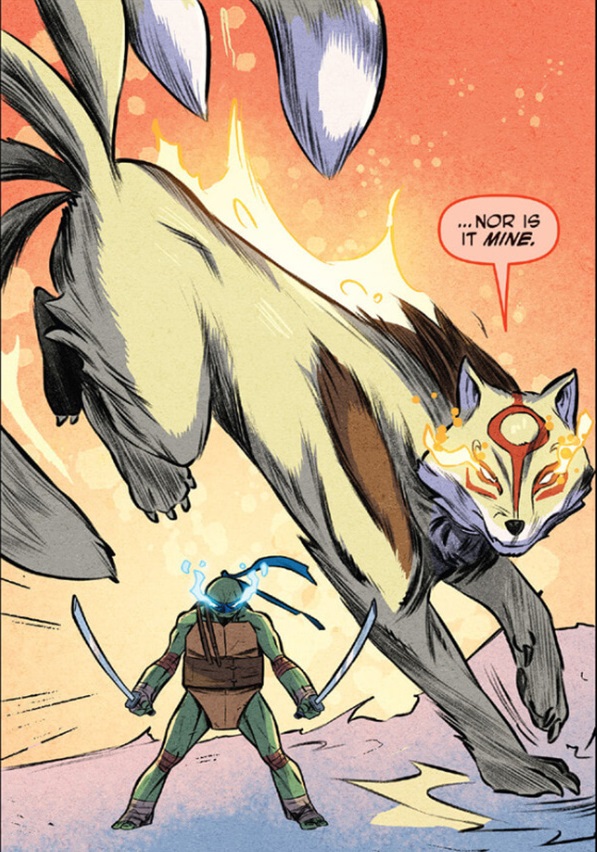 La terrible figure du Rat King apparaissait face aux tortues, Saki et Kitsune, dans le ciel. Il se moquait de ses adversaires, si faibles et pourtant si téméraires. S’avançant vers ses opposants, la créature semi-divine gagnait en taille, ce qui n’était pas sans effrayer les tortues. Leonardo se devait de rester digne et mettait ses lames au clair. Il l’avait déjà affronté par le passé (TMNT #84). Ils ne devaient pas flancher. Ils étaient toute une équipe cette fois. Et forts d’un enseignement puissant.