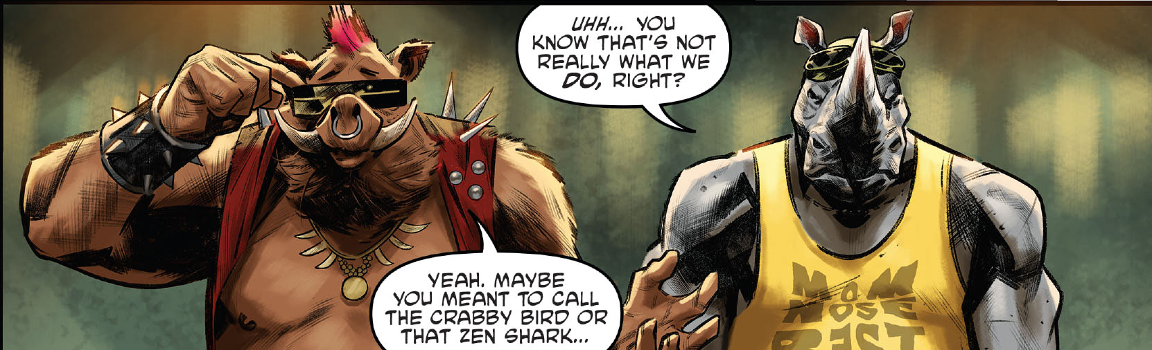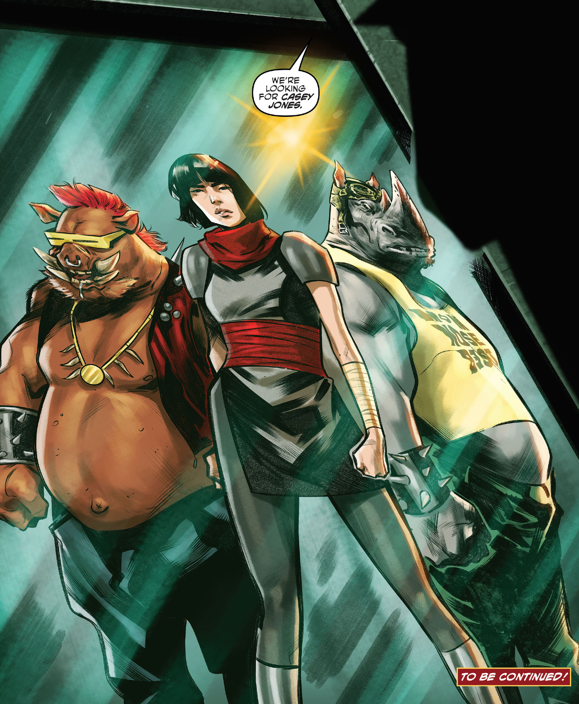 Arrivant sur les lieux, Karai retrouvait le phacochère et le rhinocéros en train de détruire des carcasses de voitures. Les deux mutants ne comprenaient pas ce que la femme leur voulait. Comment pouvaient-ils l’aider à reconstruire quelque chose, alors qu’ils ne savaient pas faire autre chose que tout détruire ? Koya et Bludgeon n’auraient pas été mieux pour cette mission ? Pour Karai tout était très clair. Avec l’aide des deux mutants, ils allaient conduire le Foot Clan vers un chemin jamais encore emprunté. Quelque chose que Shredder n’aurait jamais pensé faire.