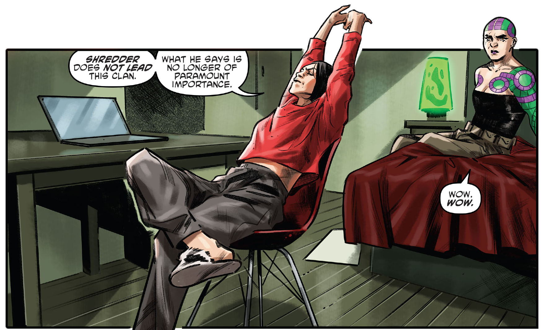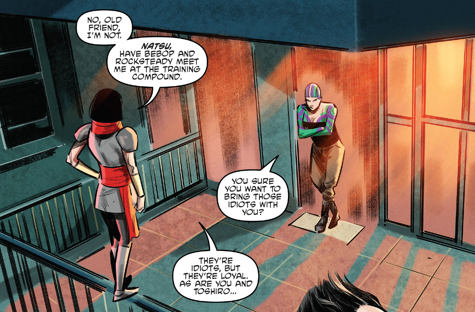 De retour à ses appartements, Karai annonçait à Natsu et Toshiro qu’elle partait un temps pour former de nouvelles alliances. Eux deux avaient pour mission de la remplacer à la tête du Foot Clan et de suivre les ordres de Shredder, tant qu’ils n’entraient pas en contradiction avec les siens. Elle demandait à Natsu de contacter Bebop et Rocksteady. Ils devaient retrouver leur cheffe d’ici une heure dans le local d’entraînement du clan.