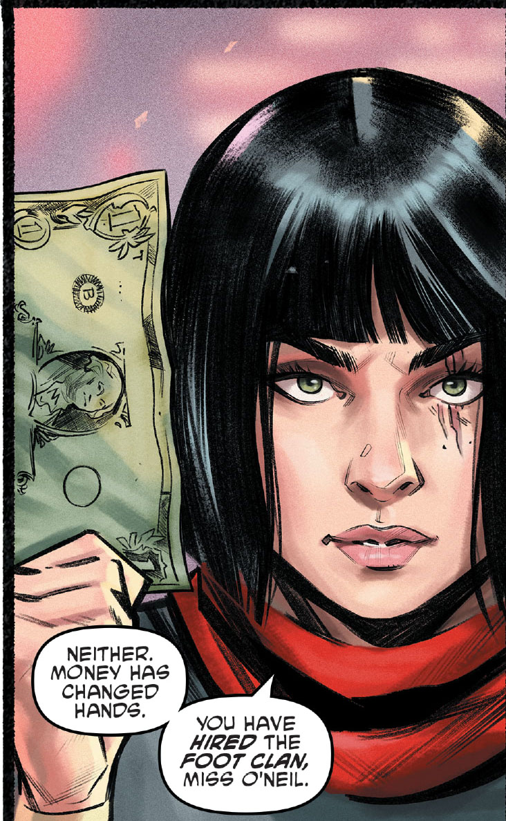 Ils avaient rendez-vous avec Karai sur les toits. Se trouvaient là également l’agent Kara Lewis et Alex Winter. Une fois la cheffe du Foot Clan arrivée, April demanda des explications, surprise de voir qu’elle ne s’occupait plus de son clan comme jadis. Mais à sa grande surprise, Karai lui demandait 1$. Prenant le billet, elle annonçait à la jeune femme qu’elle venait d’engager ses services. Le Foot Clan n’allait plus suivre la voix d’un chef voulant tout contrôler. À présent, son clan serait là pour honorer des contrats. Cela commencerait par la lutte contre l’Armageddon Game.
