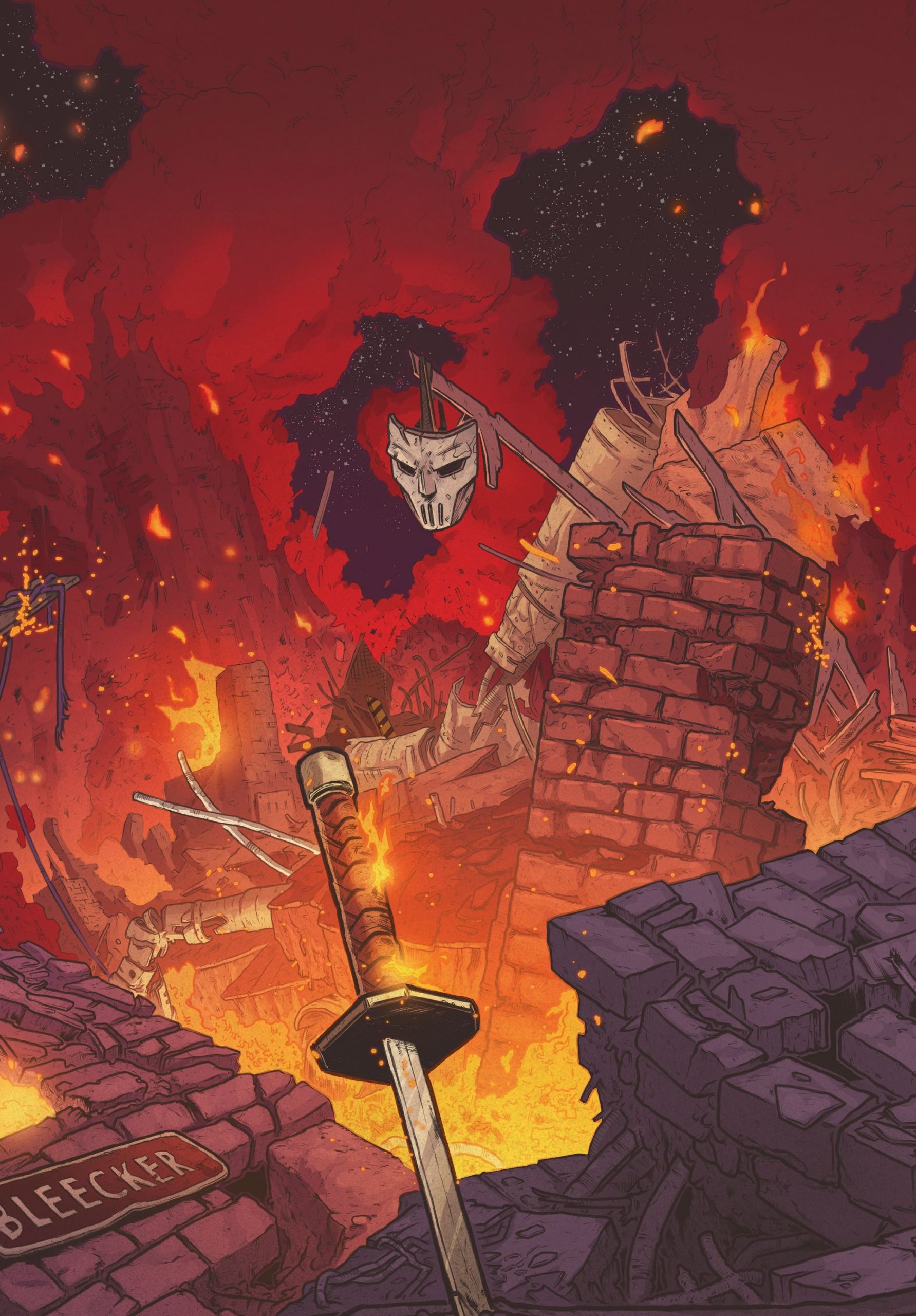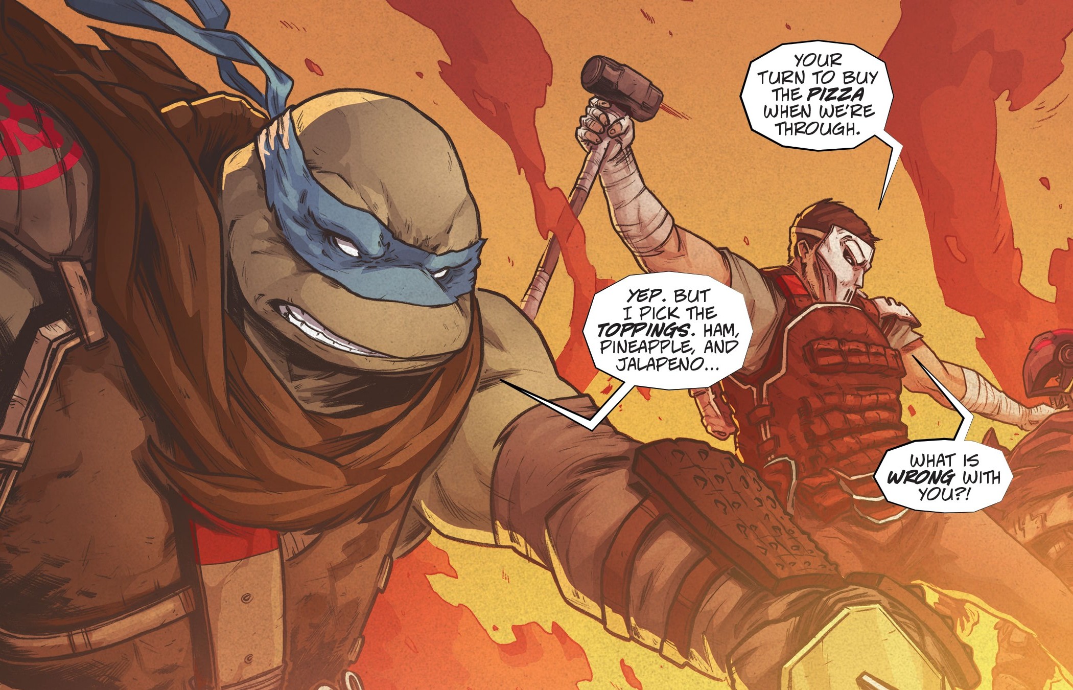 Face au mur, Leonardo et Casey savaient que l’issue du combat leur serait fatale. Ils n’avaient plus qu’à gagner du temps pour permettre à leurs familles de prendre la fuite. Le visage en sang, le justicier remettait son masque sur le visage et se tenait aux côtés d’une tortue déterminée à résister le plus longtemps possible. Michelangelo avait compris qu’un de ses frères allait une fois encore partir ce soir. Le Fugitoid hurlait, menaçant Stockman de s’auto-détruire s’il faisait du mal à ses amis. Qu’il en soit ainsi. Le scientifique observait ce qui se passait depuis ses ordinateurs. S’il ne pouvait mettre la main sur le robot, alors il réduirait ses ennemis à néant. Ses Mousers explosaient, soufflant tout le bâtiment. Seuls le masque de Casey et le sabre de Leonardo subsistaient dans les décombres enflammés.