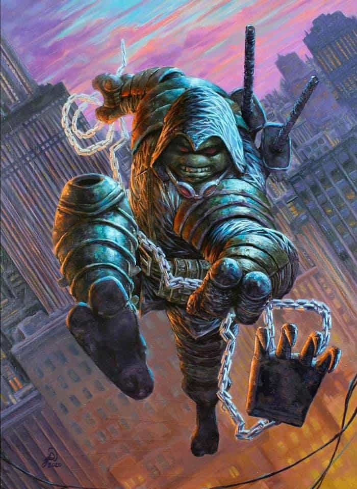 Depuis toujours il avait ressenti l’absence de sa mère. Trop occupée avec le Foot Clan de son vivant. Dans le coma depuis près de 30 ans. Il relativisait. Son destin était de devenir plus grands que sa mère. Si grand qu’il était persuadé d’être ce qu’Oroku Saki, son grand père, n’avait jamais pu être. Sa soif de pouvoir et son arrogance le faisait sauter dans le vide et se rattraper sur des câbles qui cédaient sous son poids. Il se moquait de chuter ainsi. Des serres approchaient pour l’empêcher de toucher le sol.