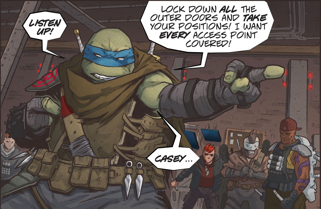 Les parties hautes du bâtiment étaient déjà assiégées par les ninjas, les soldats tombaient les uns derrière les autres. Casey demandait à Michelangelo et leurs hommes de mettre April et Honeycutt dans une zone d’abri. Lui, partait rejoindre Leonardo, resté sur le front.