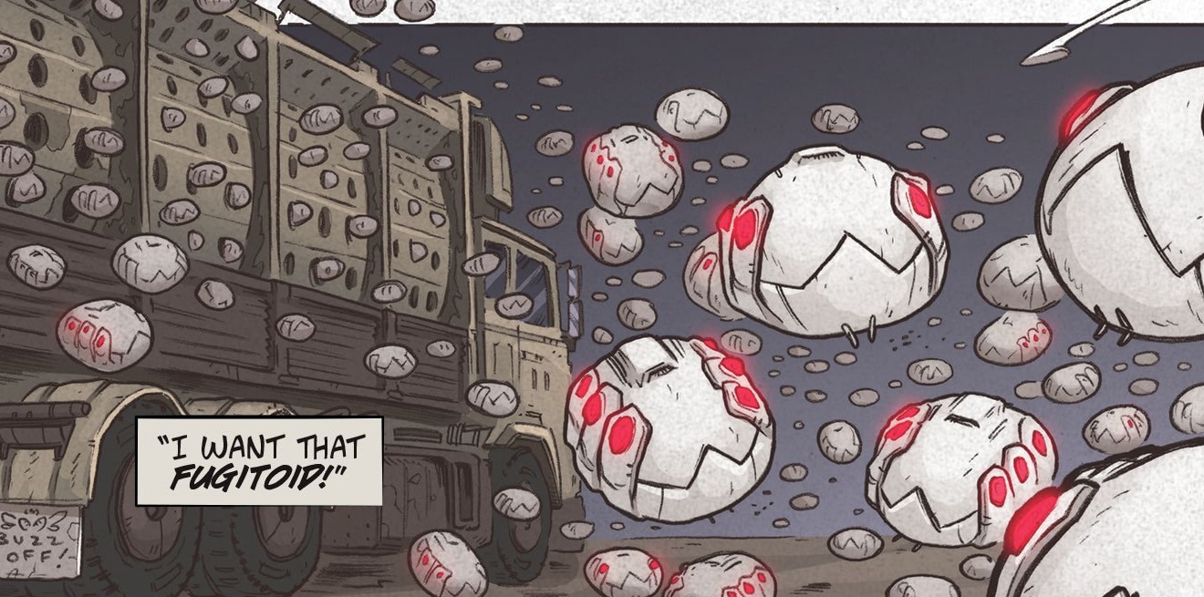 Soudain, Casey Marie entrait dans la pièce, surprise de voir la tortue parler seule dans le noir. Elle lui annonçait qu’April l’attendait dans le laboratoire. La femme lui présentait une vieille connaissance, la tête du Fugitoid !