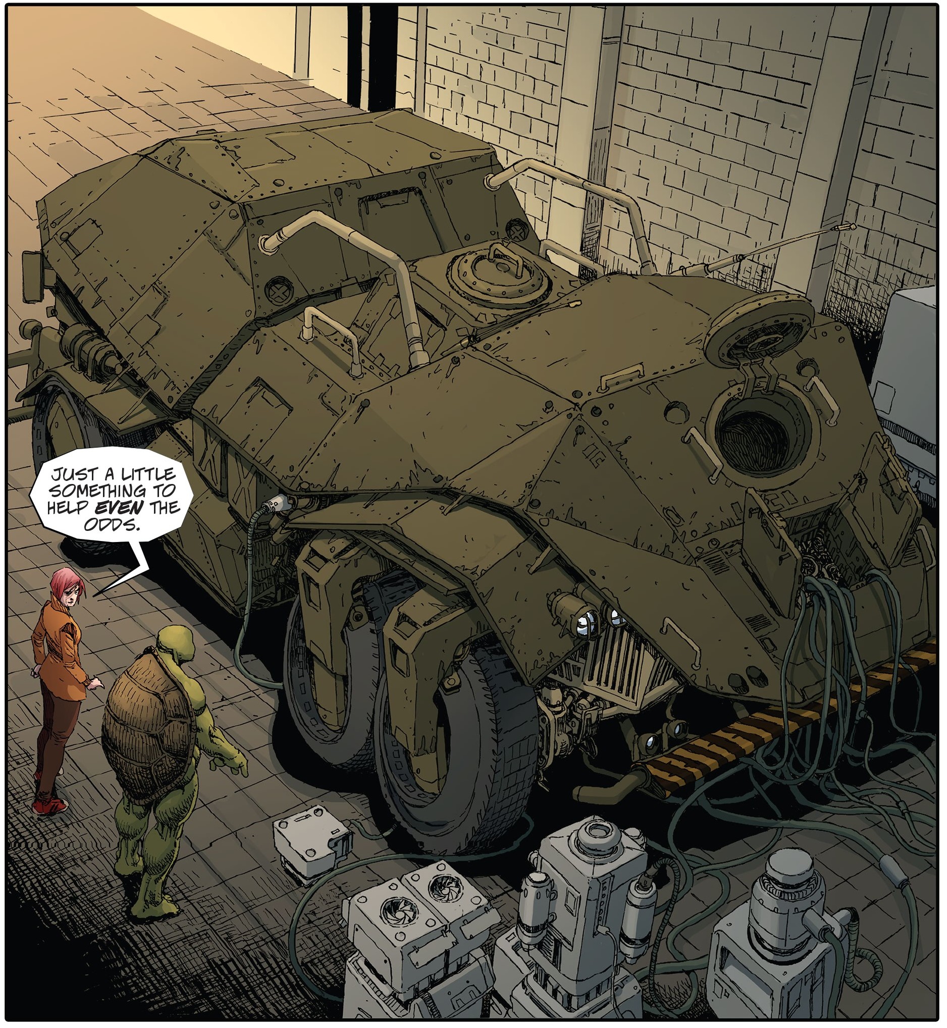 Il était stupide d’attaquer Hiroto de front. Le plan était à présent d’assiéger la base de Stockman. En réactivant le Fugitoid au bon moment, ils pouvaient neutraliser les installations, puis porter un coup fatal à Hiroto dans la foulée. Mais ce plan était trop risqué pour Michelangelo. C’était pourtant la seule chance de se débarrasser de l’homme. April saisissait son ami par le bras pour lui montrer quelque chose qu’elle avait construit durant toutes ces années. Donatello en serait très fier ! Un char d’assaut…