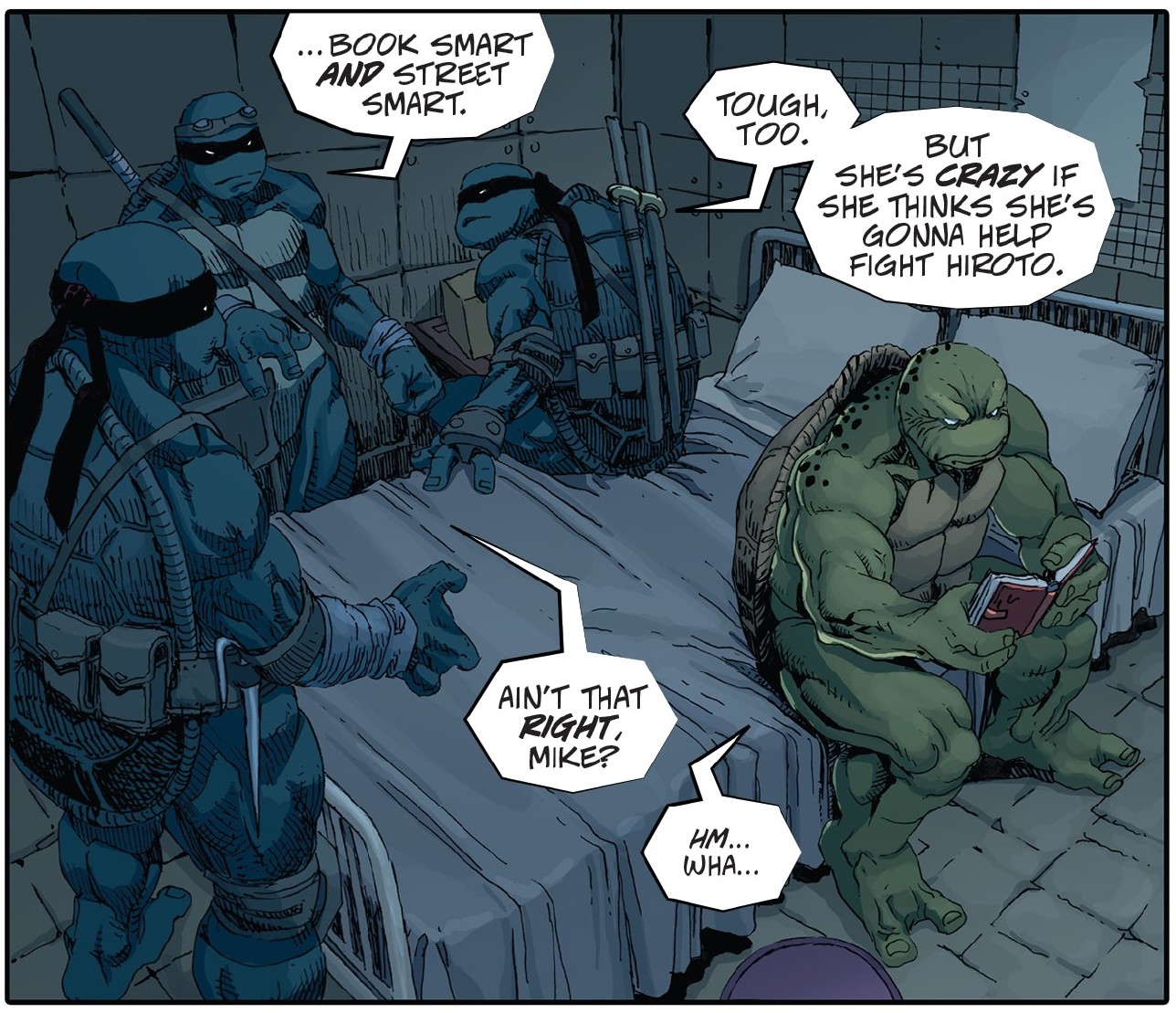 Dans les égouts, Michelangelo continuait de songer. L’entrain de Casey Mary était touchant. Mais très risqué. Ses frères cherchaient à le raisonner. Après tout, elle avait 16 ans, comme eux lorsqu’ils affrontaient le Foot Clan. Mais pour le dernier ronin, rien n’était comparable. Ils avaient beau être jeunes, les quatre frères demeuraient des mutants entraînés tout au long de leur vie par un expert. Ce n’était clairement pas le cas de l’adolescente.