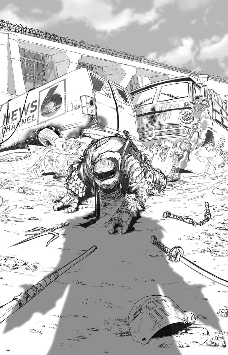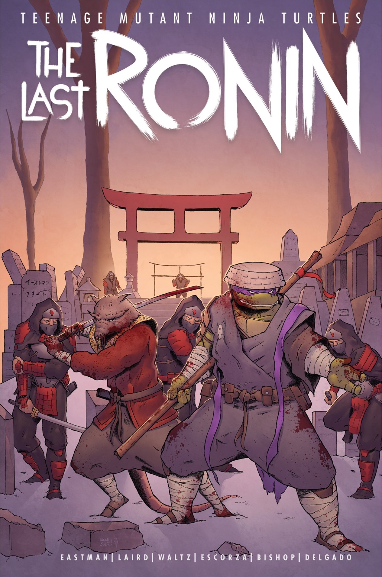 D’un geste vif, Splinter tirait sa lame au clair et faisait tomber la tête de l’ambassadeur du Foot Clan et de deux de ses gardes. Mais les soldats du Foot Clan les encerclaient totalement, sortant des tombes et de cachettes de fortune sous la neige. Ils ne pouvaient faire confiance à aucun Oroku. Splinter n’aurait apporté aucune arme s’il avait cru le petit fils de Shredder. Le combat éclatait. Très vite, les soldats du clan Hamato étaient dépassés par le nombre. L’expérience de Splinter et de Donatello permettaient de contenir l’assaut.