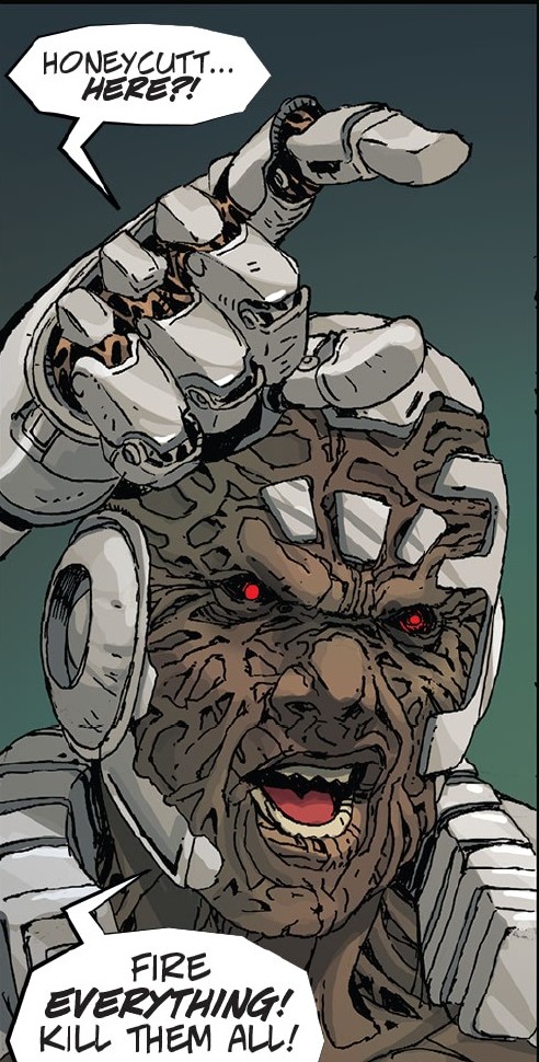 Enfonçant le mur de la pièce où se trouvait l’unité centrale, April s’empressait de connecter la vieille tête du Fugitoid à la machine. La décharge électrique la propulsait en arrière. Les Mousers déferlaient dans la pièce, soutenus par de nombreux robots. Michelangelo et les rebelles essayaient de les repousser. Stockman, détectant le si précieux et recherché professeur Honeycutt, se jetait sur le caisson qui le caisson où il était renfermé. April, au nom de son défunt mari, lui assénait un grand coup. Mais le corps en partie robotique de Stockman encaissait très bien, et lui rendait la pareille, la jetant au sol. S’emparant de la tête, le scientifique fustigeait déjà. Au même moment, Honeycutt s’activa pour venger la mort de ses amis. Stockman était littéralement pulvérisé. Honeycutt avait également disparu, libérant des millions de petits nanorobots qui s’empressaient de neutraliser tout le système de défense de Roosevelt Island.