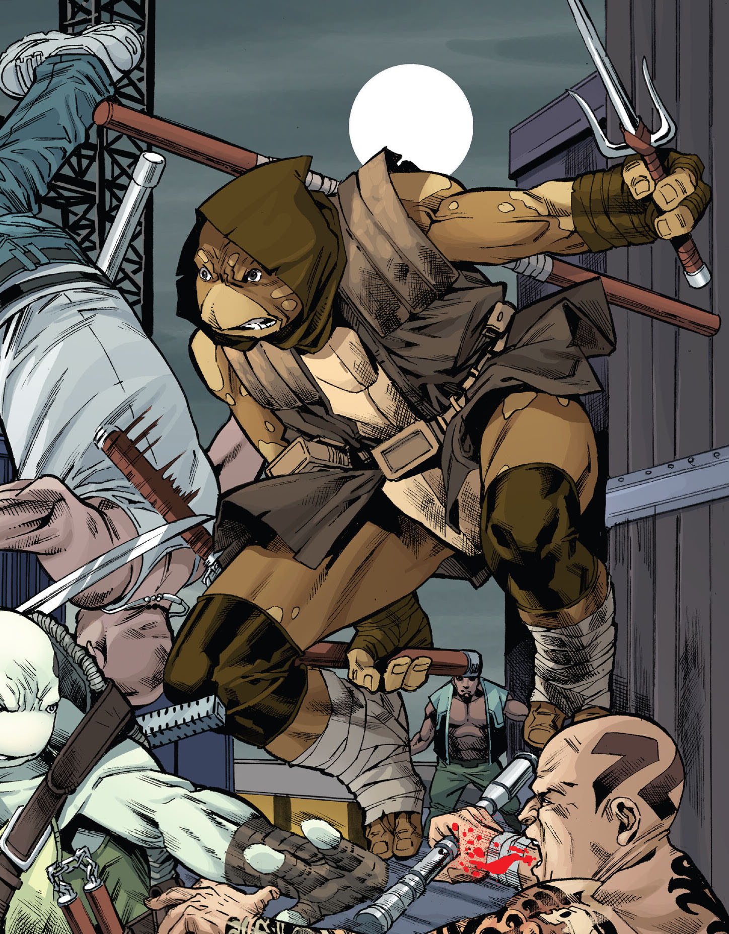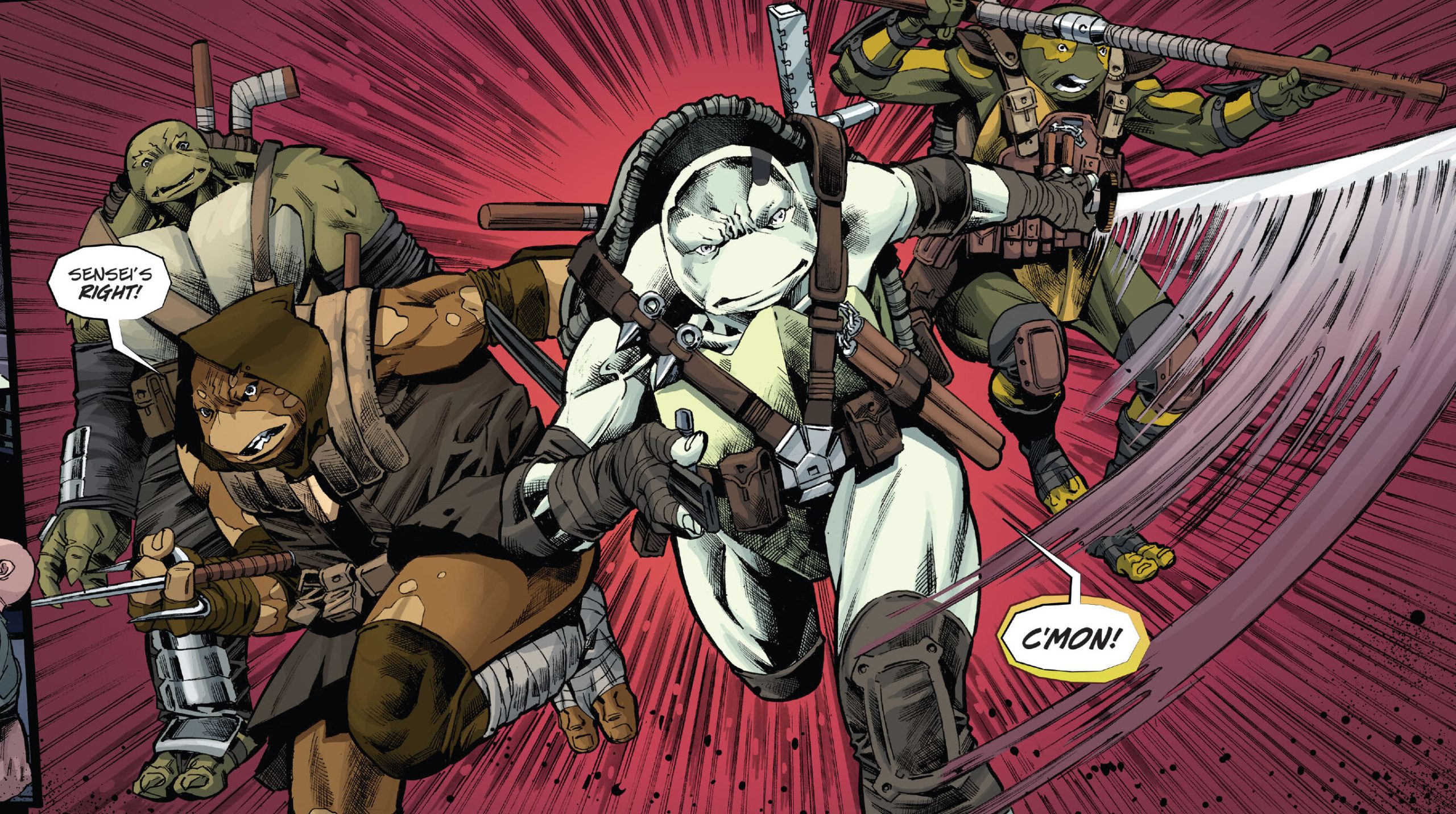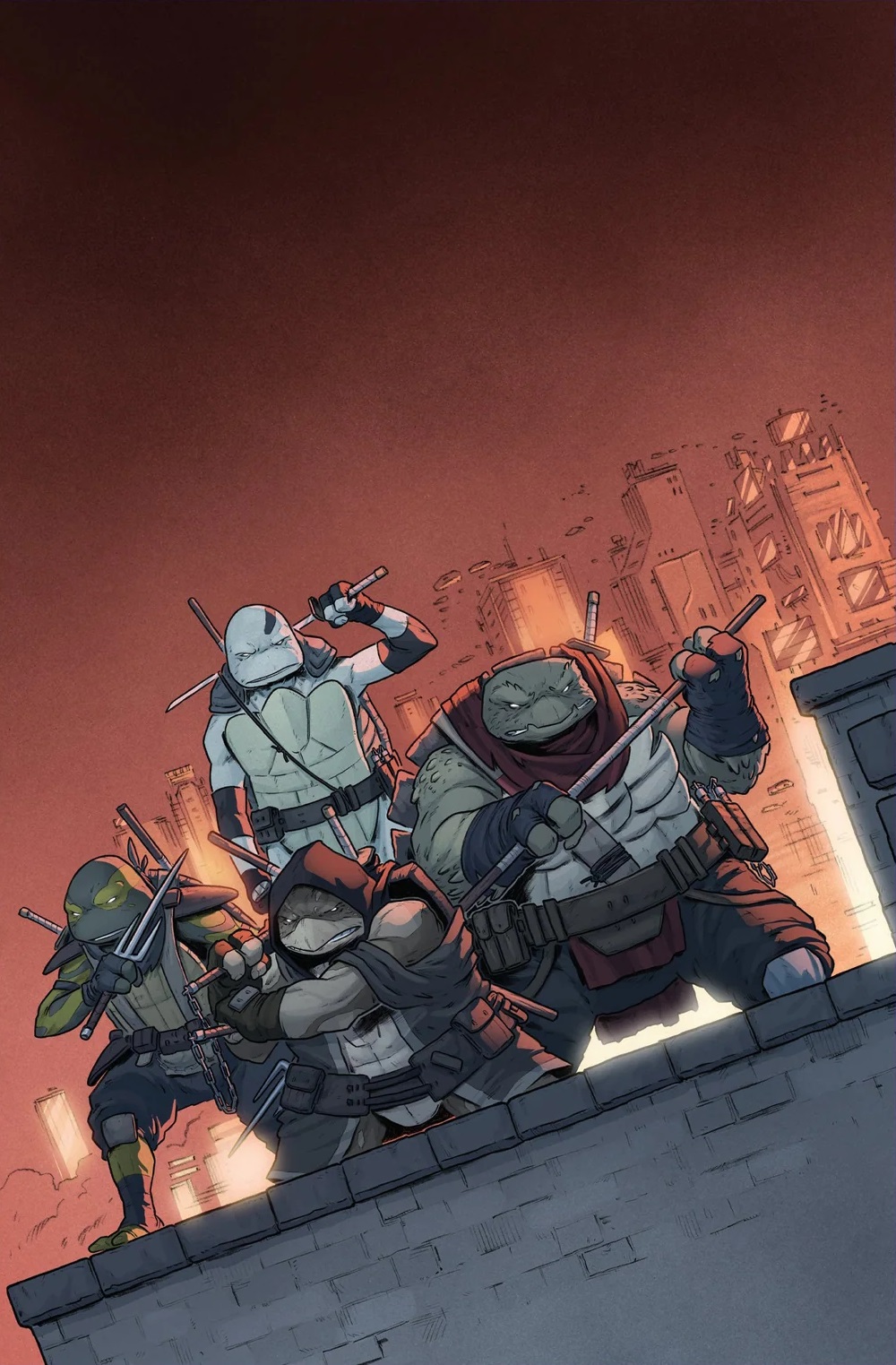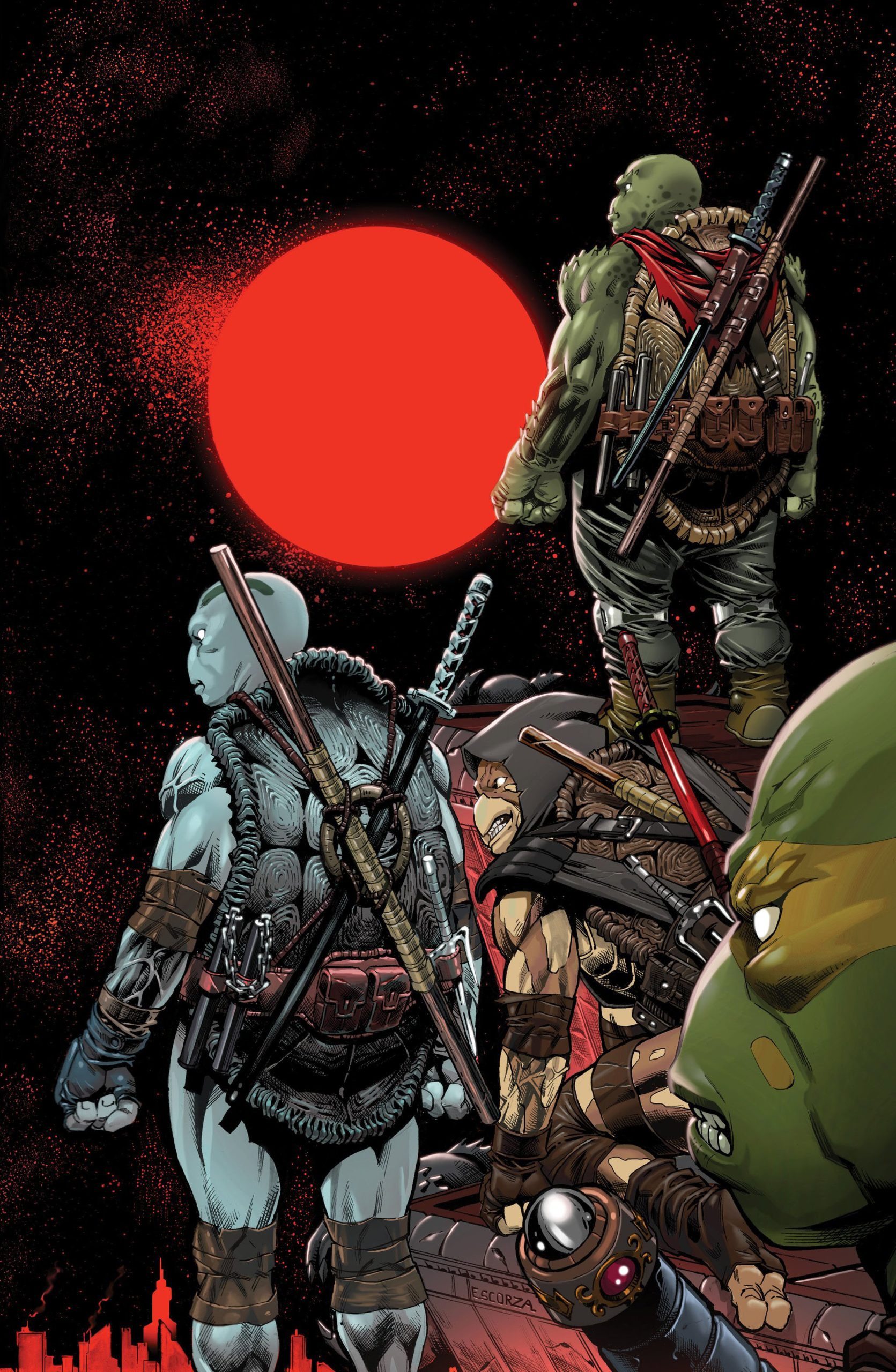 (The last ronin #2). Suivirent des années de chaos où Leonardo (The last ronin #3) et Donatello et son père (The last ronin #4) périrent à leur tour. Le dernier des quatre frères, Michelangelo, revint des morts pour venger à son tour la destruction de sa famille et tua Hiroto, le fils de Karai, qui avait pris la tête du Foot Clan et faisait régner la terreur à New York. Cette bataille avait été sa dernière (The last ronin #5). Quelques mois plus tard, quatre nouvelles petites tortues mutantes venaient au monde. Odyn, Yi, Uno et Moja. Elles aussi étaient entraînées par leur maître, Casey Marie Jones, sous la tutelle d’April O’Neil. À présent adolescents, les quatre reptiles voulaient honorer la mémoire de leur famille en marchant sur leurs pas.
