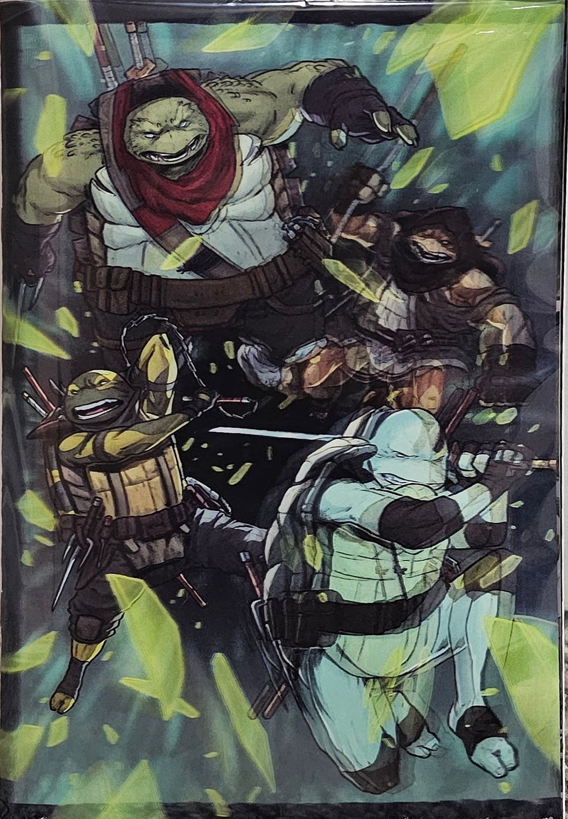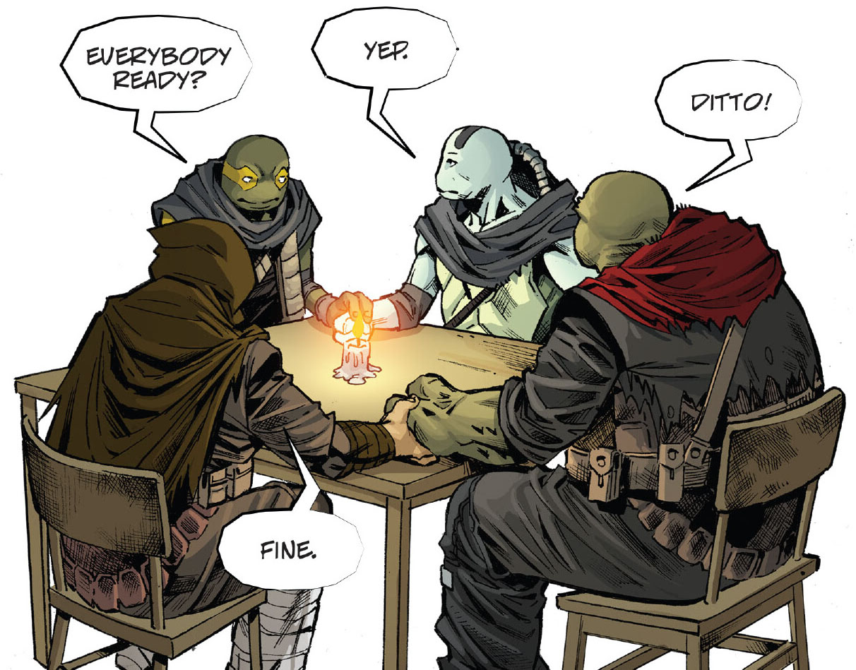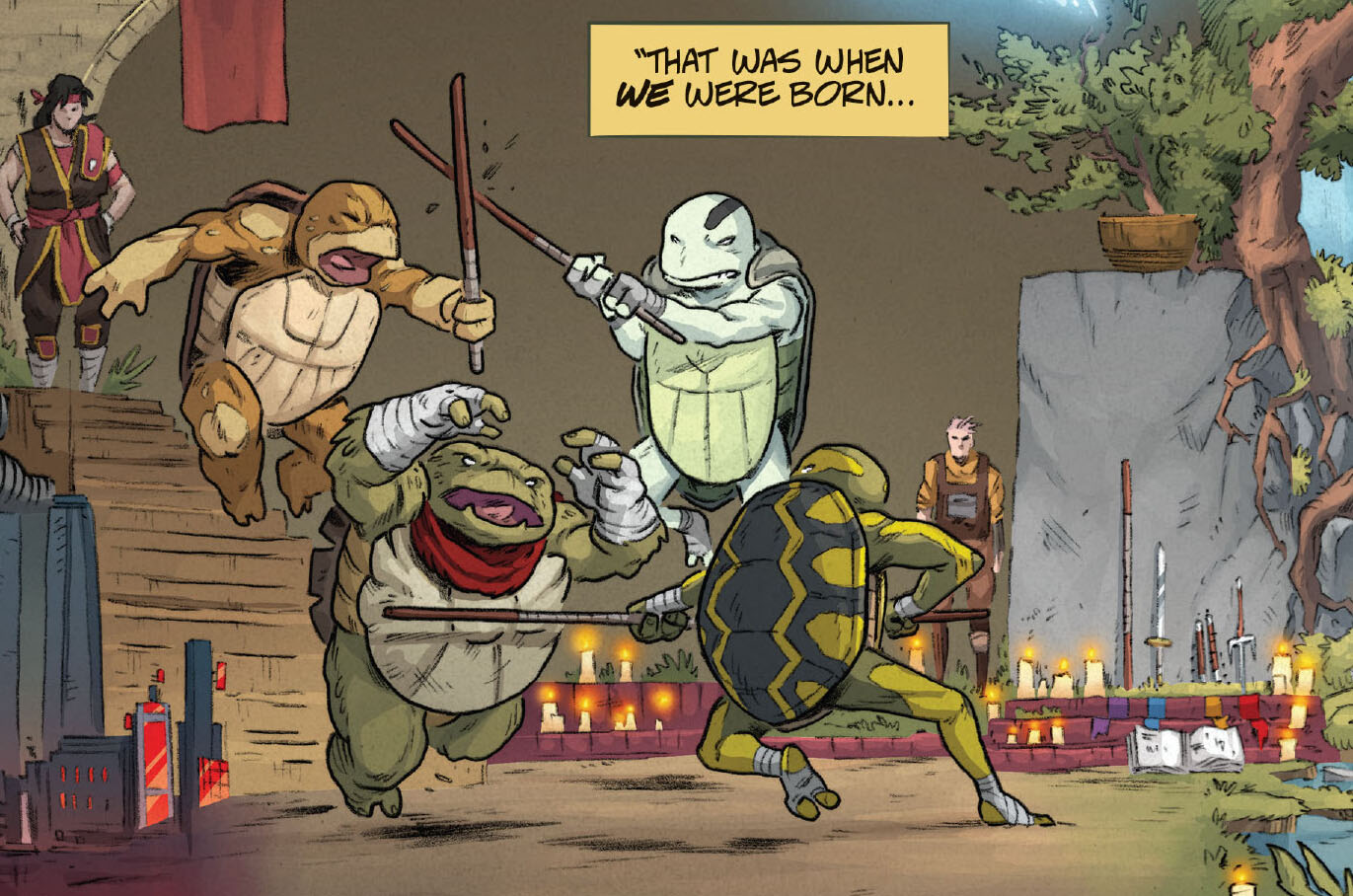 Les jeunes tortues avaient bien grandies. Et avaient soif d’aventure. Au cours de leur pérégrinations, elles avaient découvert une cachette souterraine, devenue leur repaire secret. Uno s’empressait d’allumer une bougie tandis qu’Odyn lisait un comic book. Les quatre frères et sœurs allaient une fois encore se raconter l’histoire légendaire de leur famille. Celle du grand ninja Hamato Yoshi et de son vieil ami, devenu rival, Oroku Nagi. Cette fois, c’était Yi qui allait raconter l’histoire. Et pour rendre le récit plus impressionnant, la tortue le raconterait par télépathie. Une faculté que les quatre reptiles avaient remarquablement développée en grandissant.