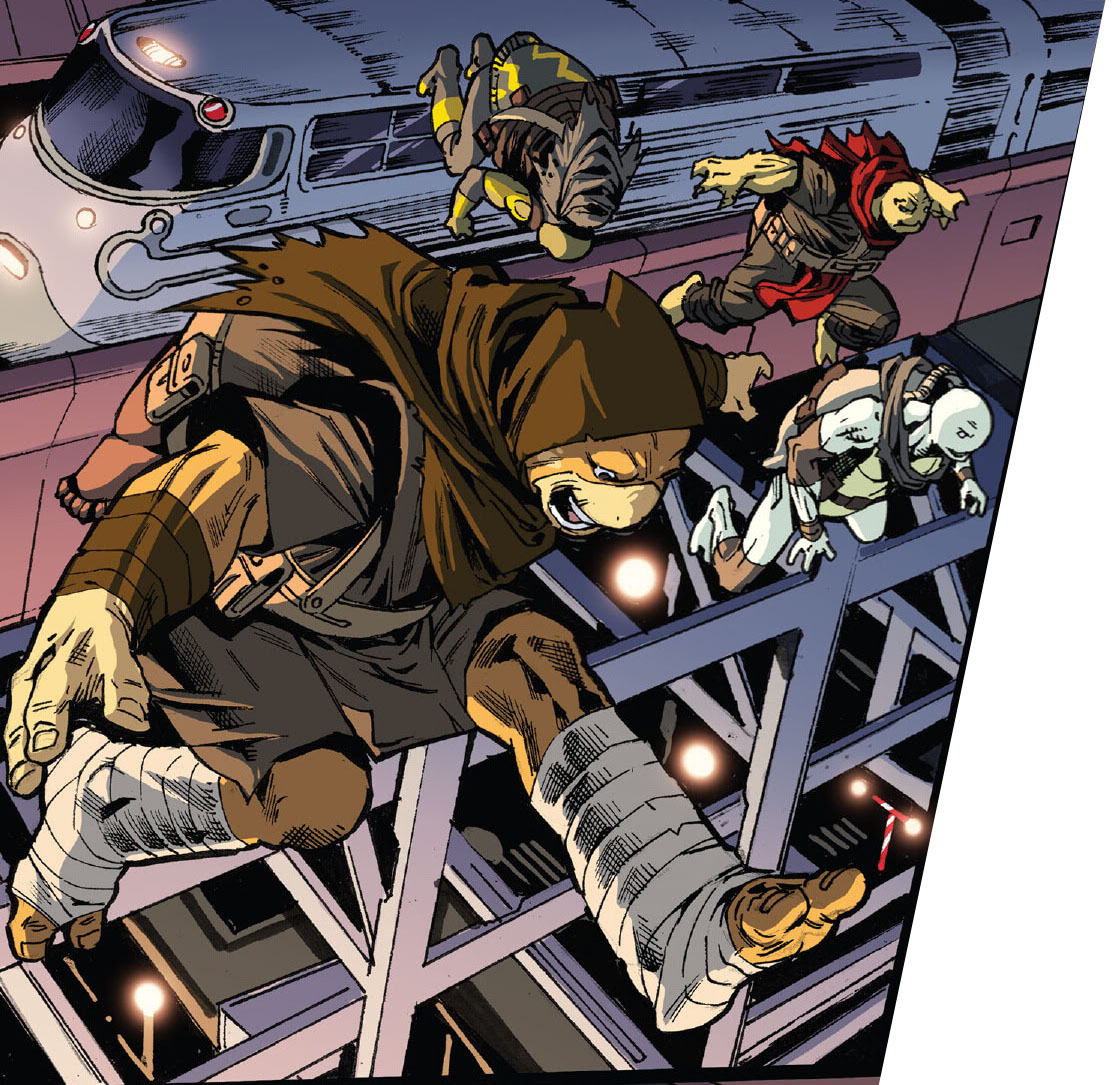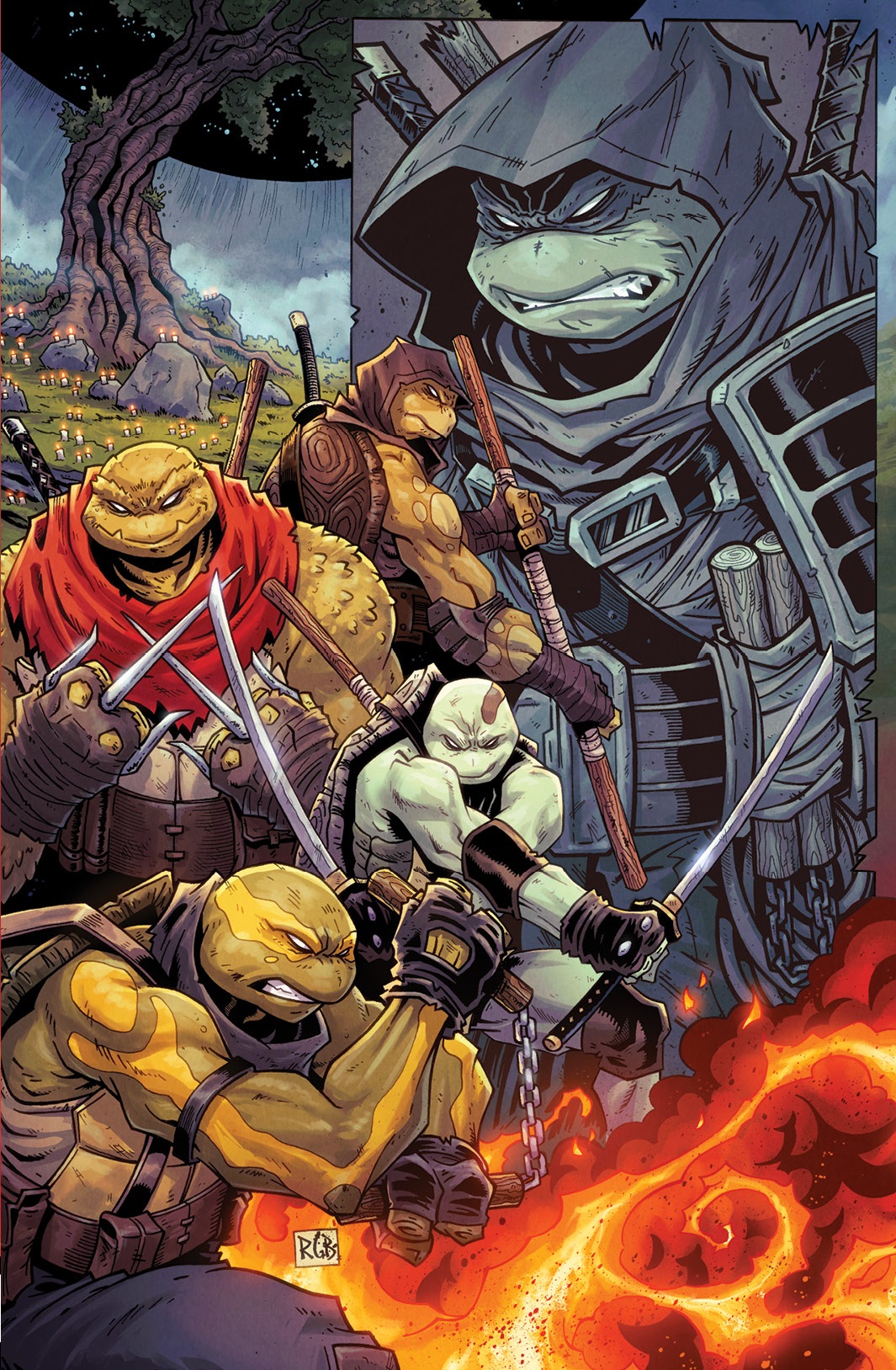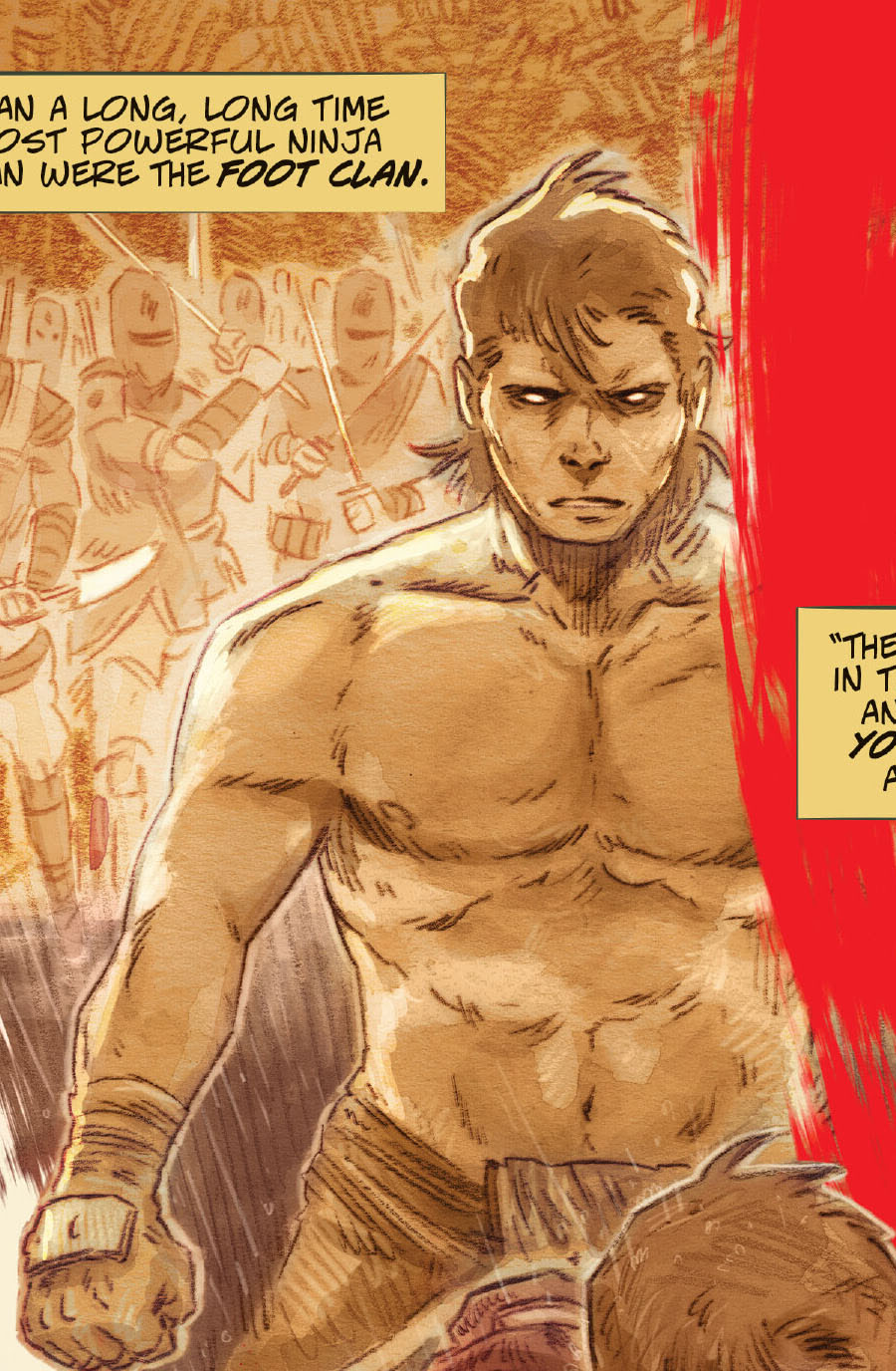 Les jeunes tortues avaient bien grandies. Et avaient soif d’aventure. Au cours de leur pérégrinations, elles avaient découvert une cachette souterraine, devenue leur repaire secret. Uno s’empressait d’allumer une bougie tandis qu’Odyn lisait un comic book. Les quatre frères et sœurs allaient une fois encore se raconter l’histoire légendaire de leur famille. Celle du grand ninja Hamato Yoshi et de son vieil ami, devenu rival, Oroku Nagi. Cette fois, c’était Yi qui allait raconter l’histoire. Et pour rendre le récit plus impressionnant, la tortue le raconterait par télépathie. Une faculté que les quatre reptiles avaient remarquablement développée en grandissant.
