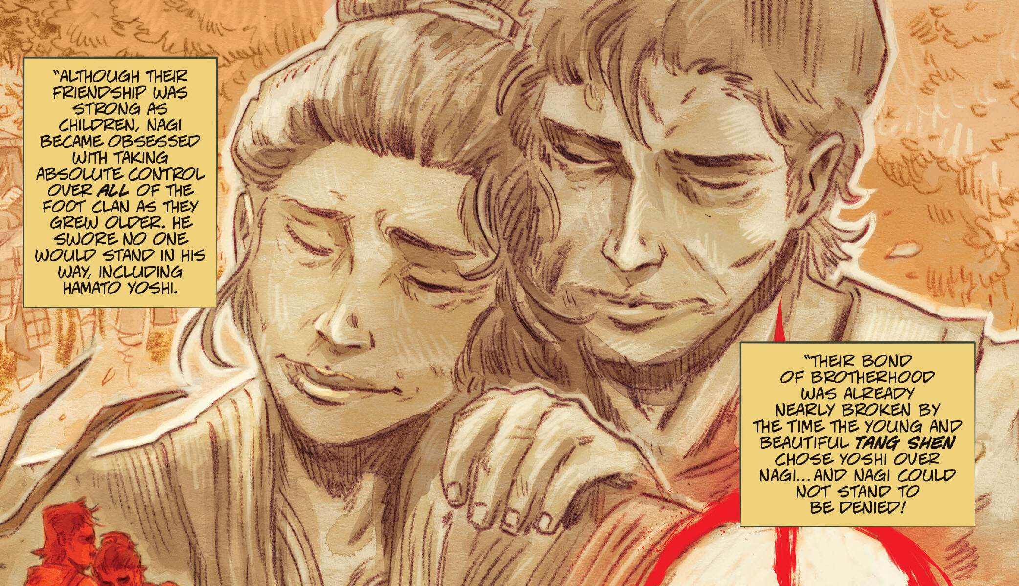 Tout avait commencé plusieurs décennies dans le passé, au Japon. C’était l’histoire des deux plus grands ninjas du Foot Clan, devenus rivaux car Nagi aimait le pouvoir. Il ne pensait qu’à contrôler, à commencer par le clan qu’il voulait à ses pieds. De nombreuses disputes avaient mises à l’épreuve leur ancienne amitié. L’amour des deux hommes pour Tang Shen avait terminé d’en avoir raison. Un jour, Nagi força Shen à lui avouer des sentiments inexistants. Furieux, il la blessa grièvement. Retrouvant sa bien-aimée sauvagement agressée, Yoshi perdit son sang-froid et tua Nagi de ses poings. Oroku Saki, fils de Nagi, jura vengeance pour la mort de son père.