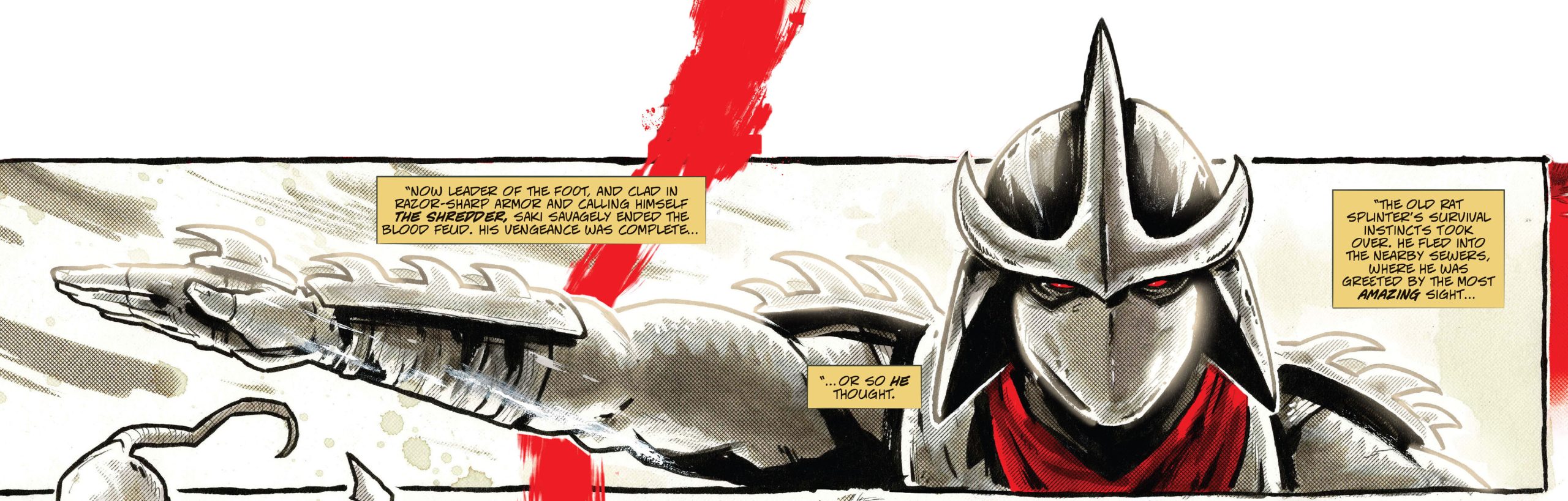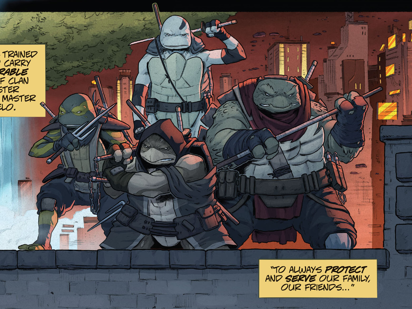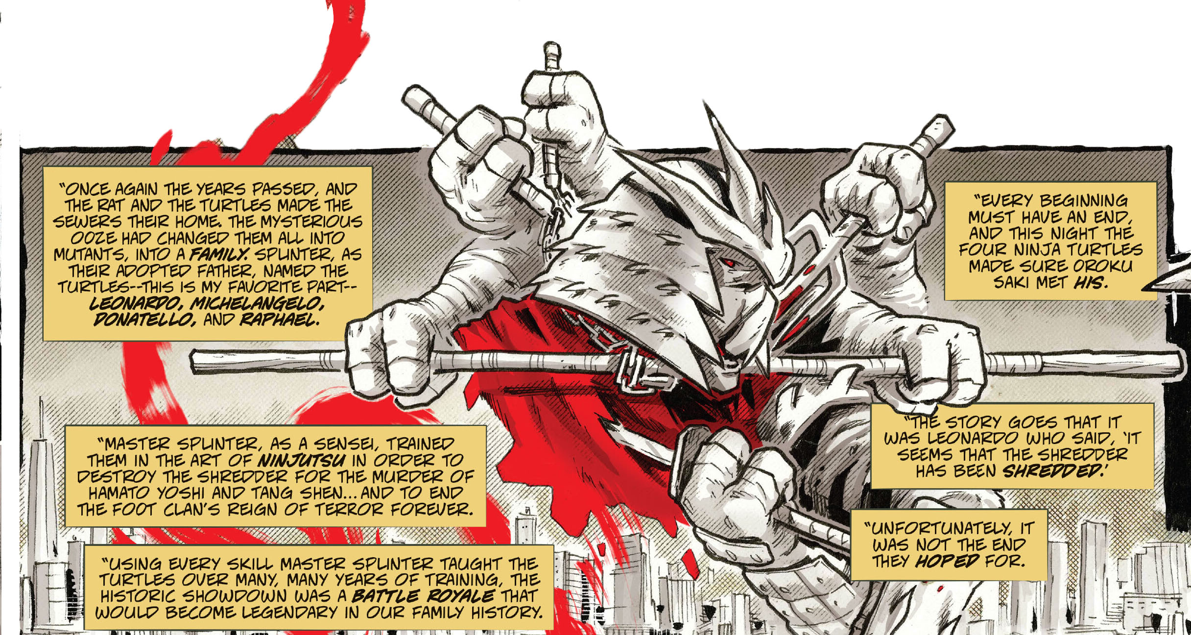 Après le massacre, le rat de compagnie, Splinter, s’enfuit de sa cage et partit pour les égouts, où il découvrit quatre petites tortues qui pataugeaient dans une boue verdâtre. Devenus des mutants, Splinter leur donna des noms, Leonardo, Raphael, Michelangelo et Donatello. Et leur enseigna les arts martiaux pour venger la mort de ses maîtres. Un soir, les tortues finirent par avoir raison du sanglant Shredder. Ce n’était que le début de leurs combats. Les mutants avaient été formés pour la vengeance. Ils avaient les capacités de faire la justice dans les rues de la ville.