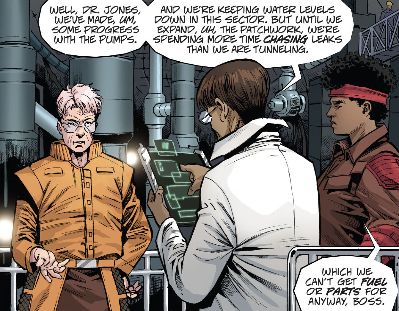 Une fois tous les ouvriers repartis, elle faisait le point avec Ahmed, son ingénieur en chef et Marly, sa seconde. L’homme n’avait pas de bonnes nouvelles. Autant ils parvenaient à canaliser l’eau dans les souterrains, autant ils n’auraient pas les pièces nécessaires pour achever leur ouvrage. Il leur manquait notamment les forêts de la machine principale, qui s’usaient à vue d’œil. Face à ce problème, April pensait se tourner vers Tinker Smith II. Son marché noir pourrait peut-être remédier à leurs carences. Cependant, un autre défi allait se poser. La main d’œuvre manquait cruellement ! La vieille dame espérait pouvoir demander des hommes au commandant Zaragoza. Beaucoup étaient déjà occupés ailleurs, comme au combat. Mais achever ces tunnels était primordial dans leur lutte.