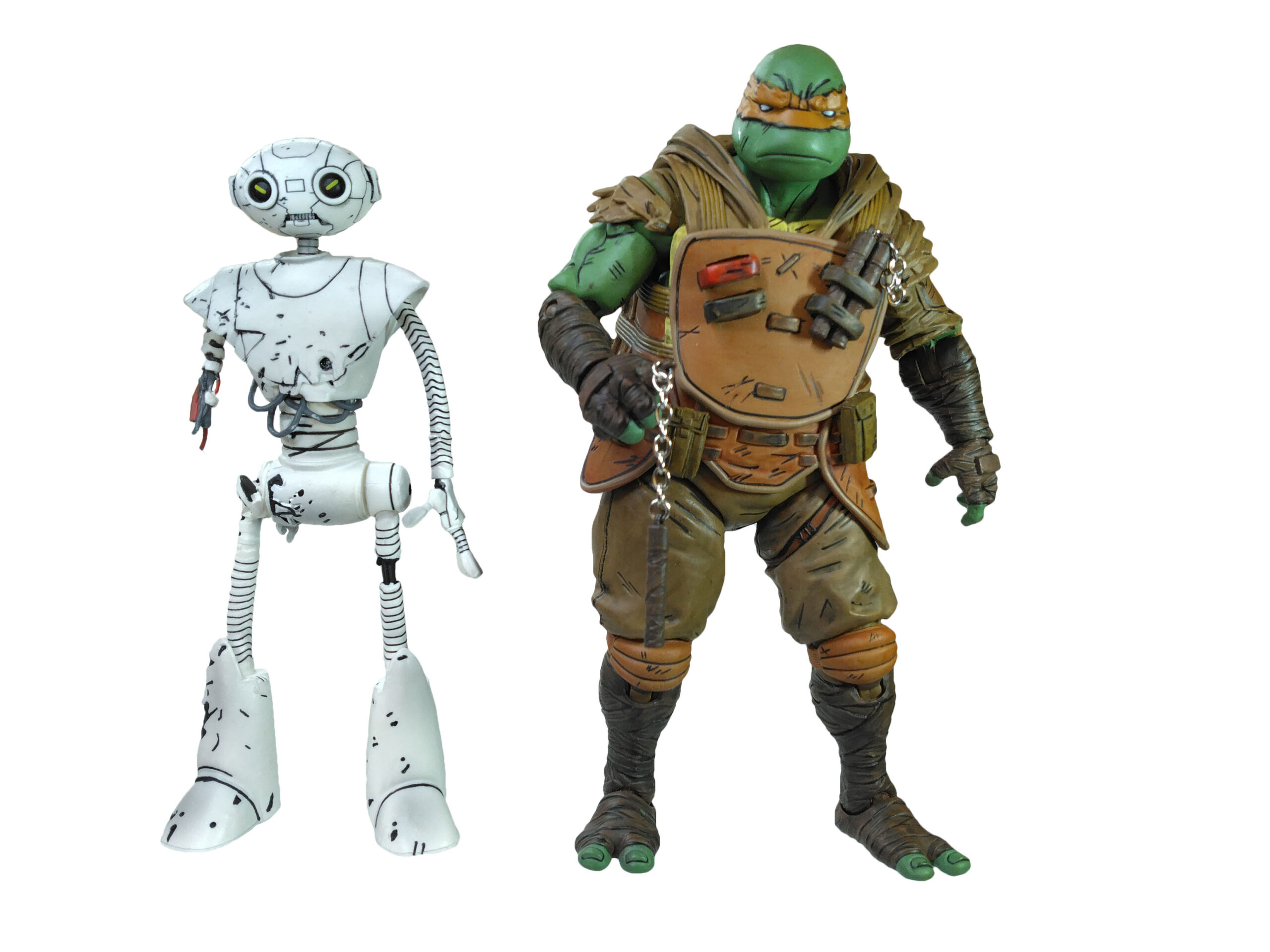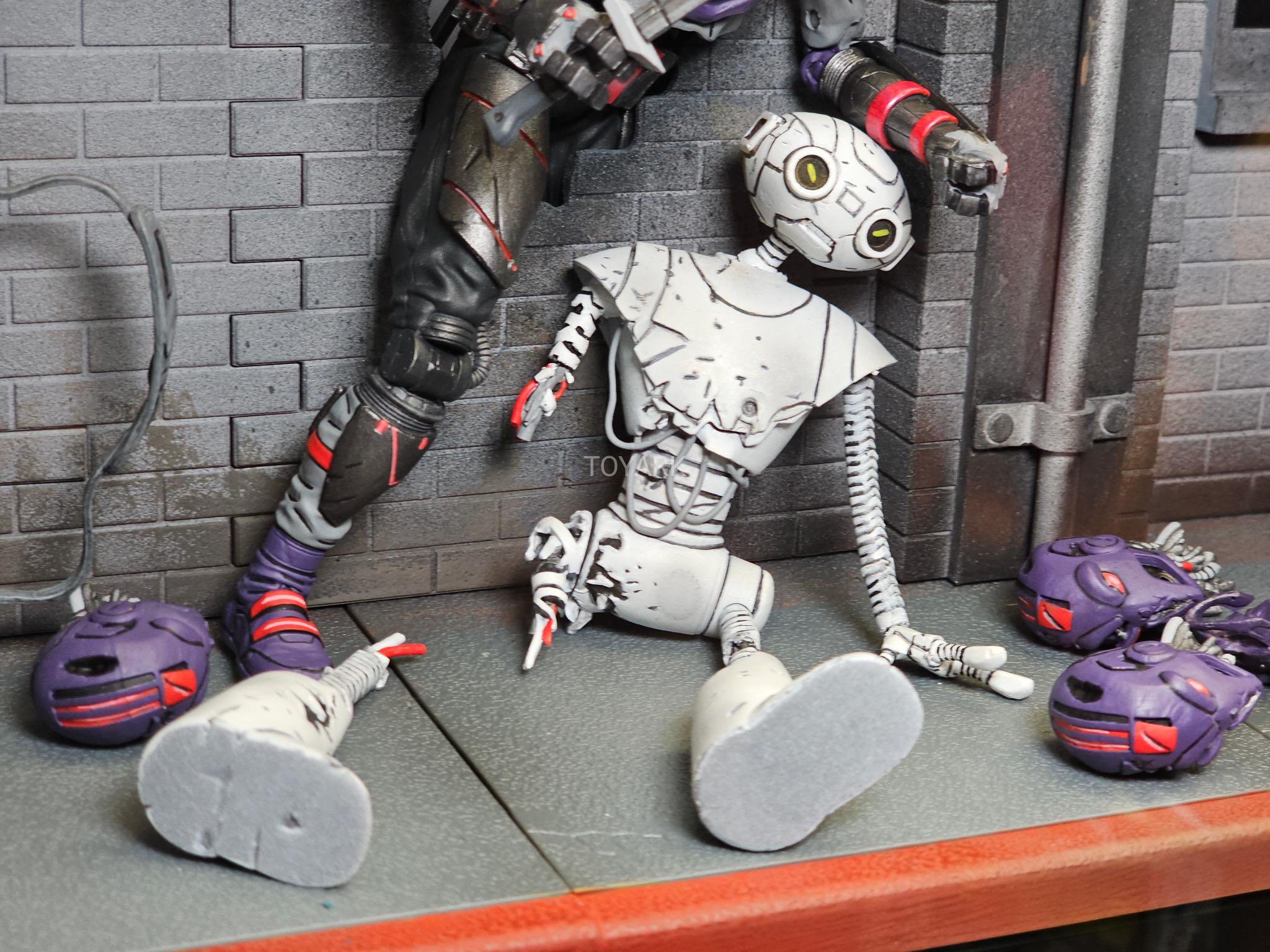 La figurine est très détaillée à tous les niveaux et reprend fidèlement le design proposé brièvement dans The last rōnin. NECA a opté pour proposer le robot dans une version endommagée après l’assaut des robots de Stockman sur le quartier général des Splinter’s strikers (The last ronin #3). Si les jambes sont interchangeables, il n’est hélas pas possible d’obtenir une figurine totalement épargnée par le combat. Tête, plastron, plaques des jambes, tout est écorché ou cabossé. Le bras droit du robot est arraché avec des câbles apparents. De même pour le torse. Le bras droit n’est d’ailleurs articulé qu’à l’épaule et non traversé par une tige de fer. Son aspect est d’ailleurs plus irrégulier, avec les anneaux qui sillonnent son bras désaxés.