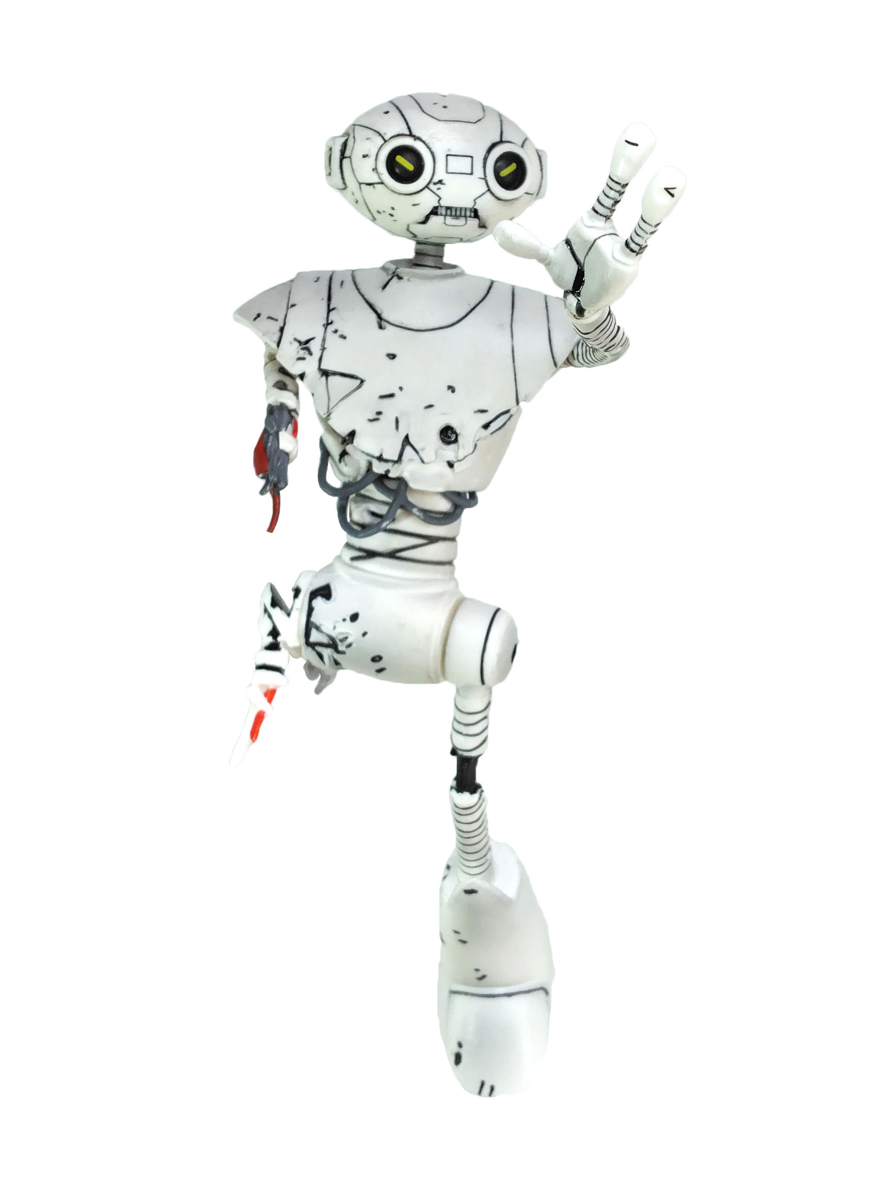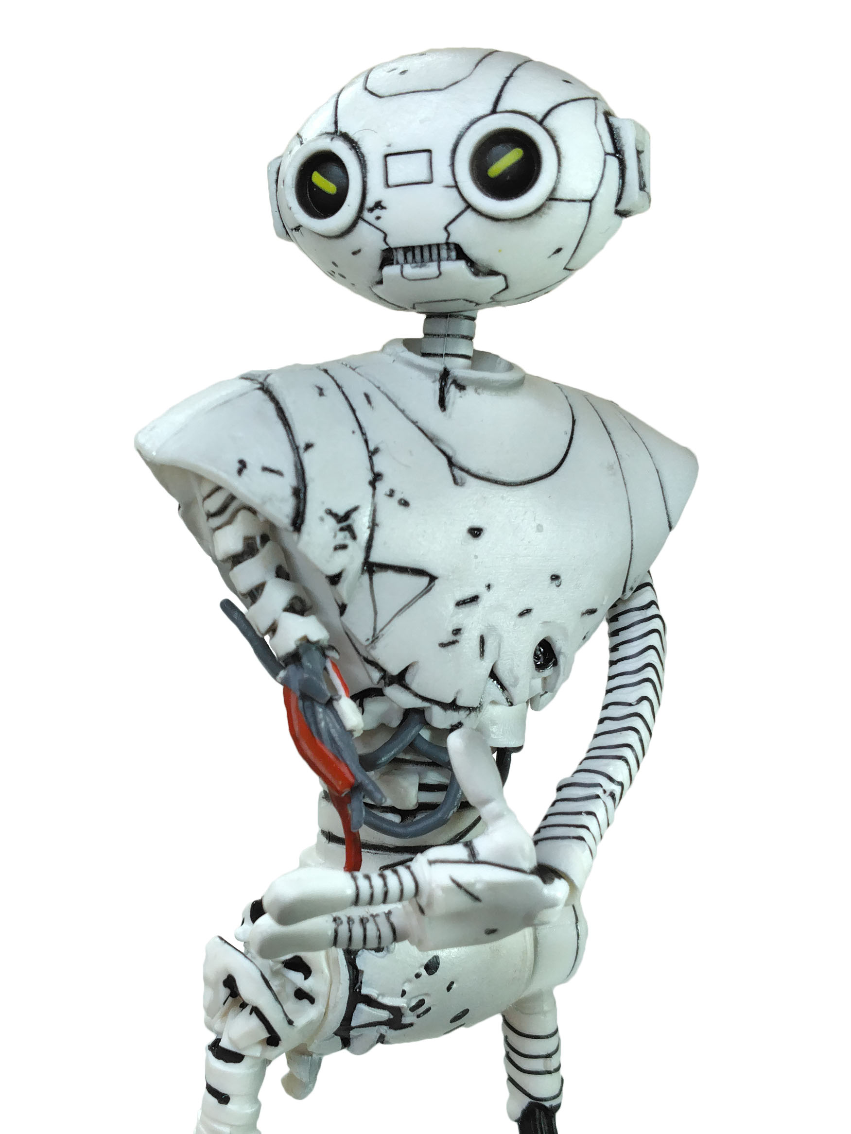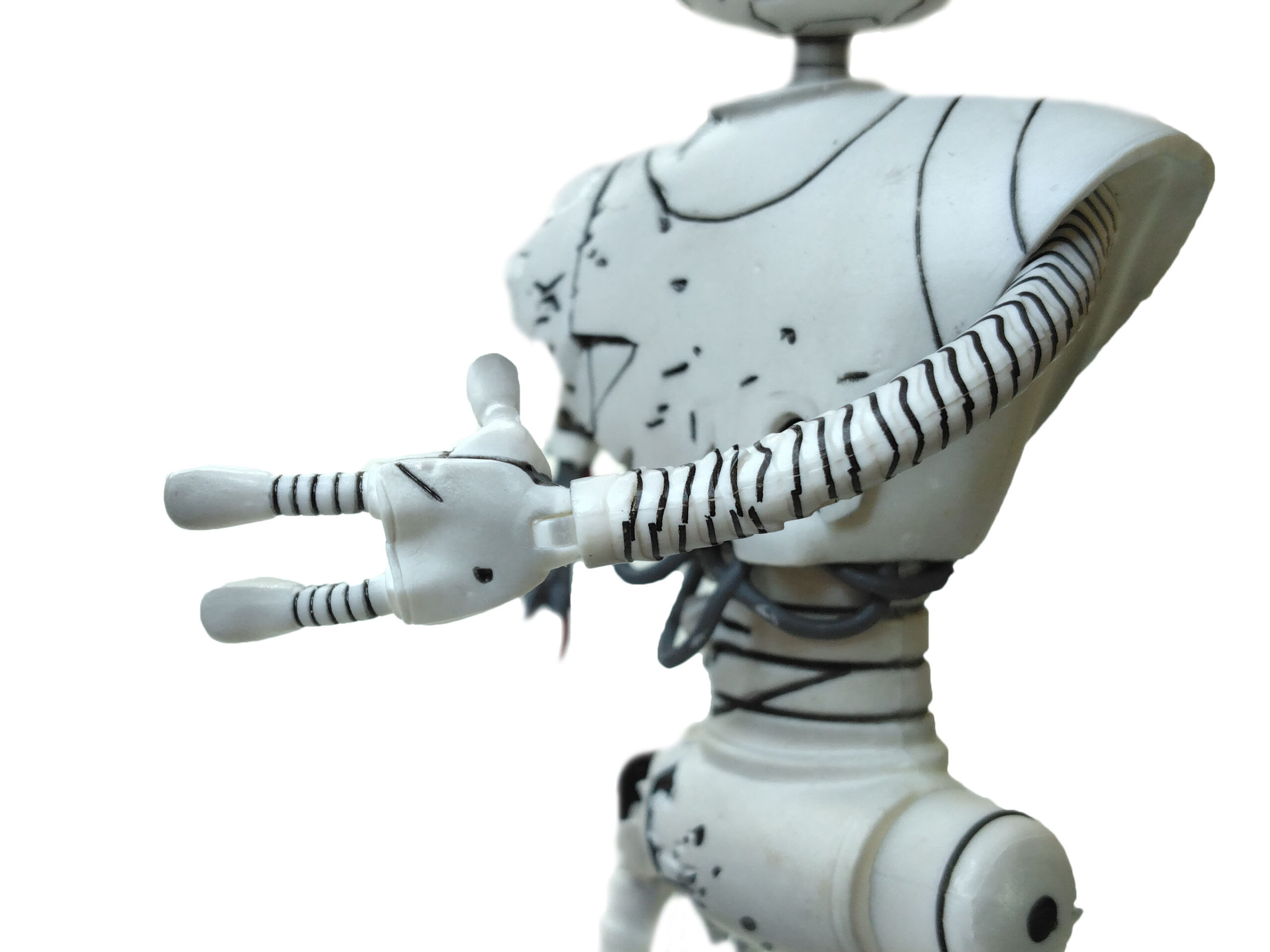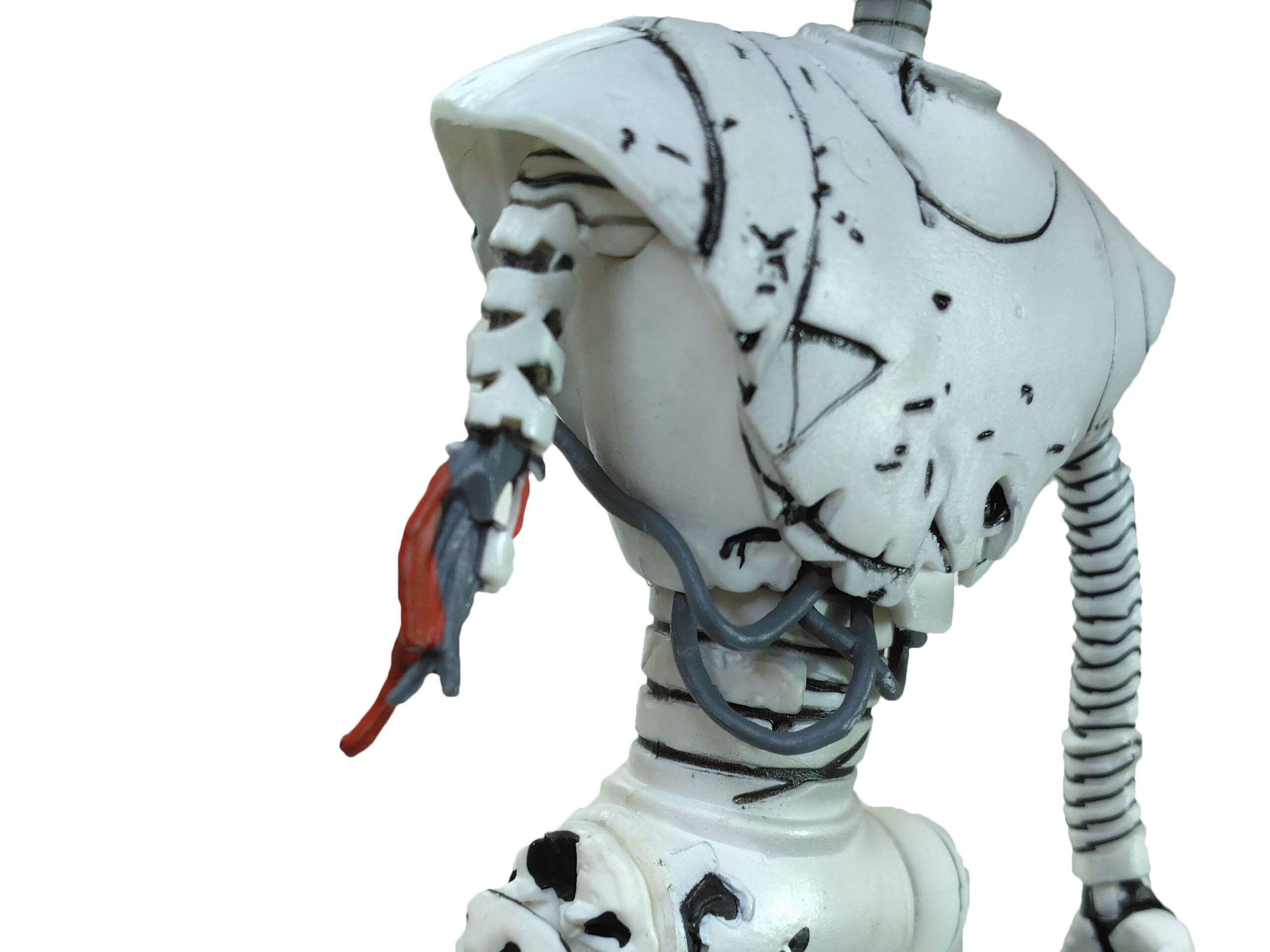 La peinture de cette figurine est relativement simple. Entièrement peinte de blanc, quelques détails parsèment le personnage. De très nombreux traits noirs permettent de mettre en valeur les différents dégâts subits par le robot.