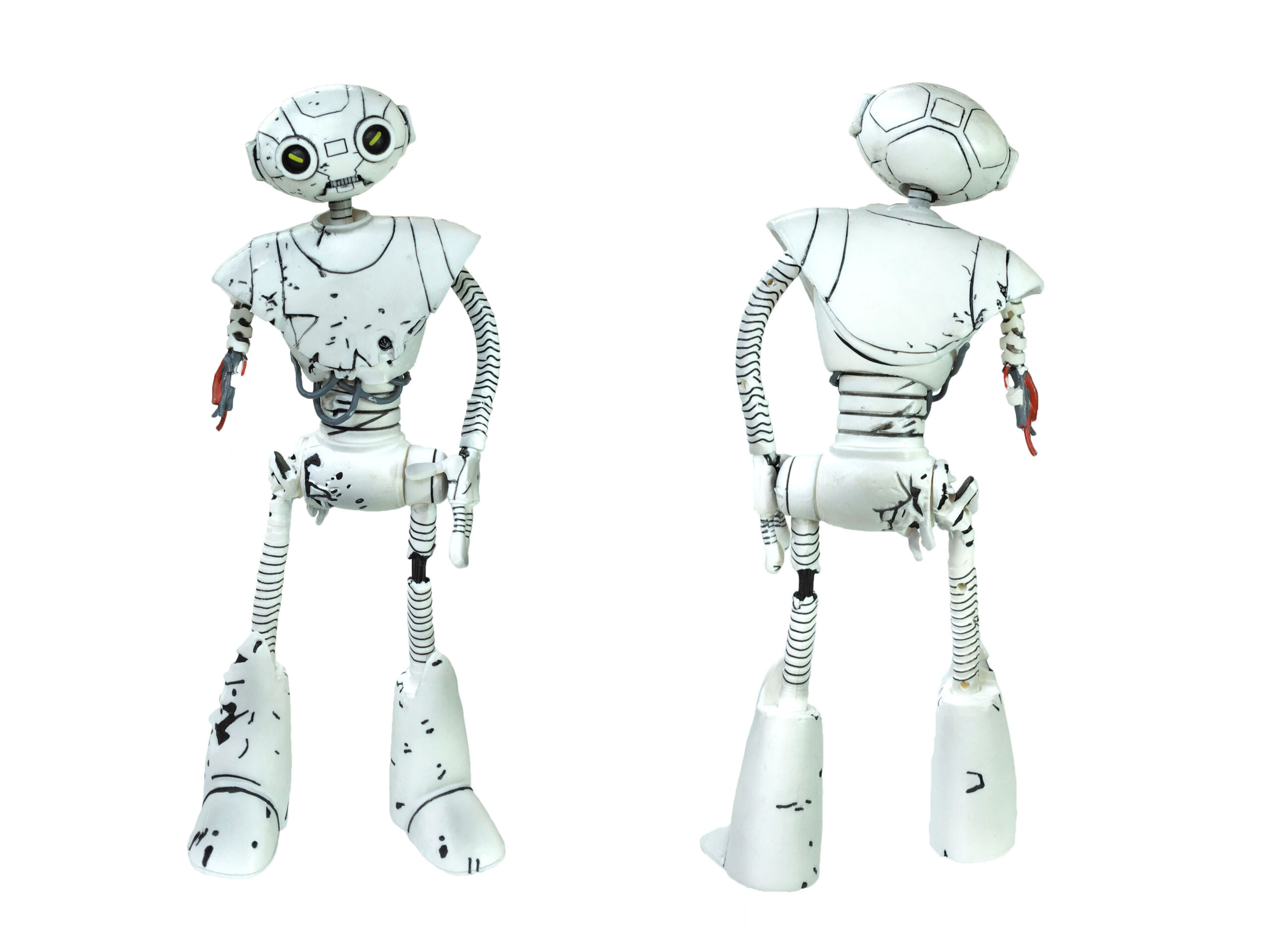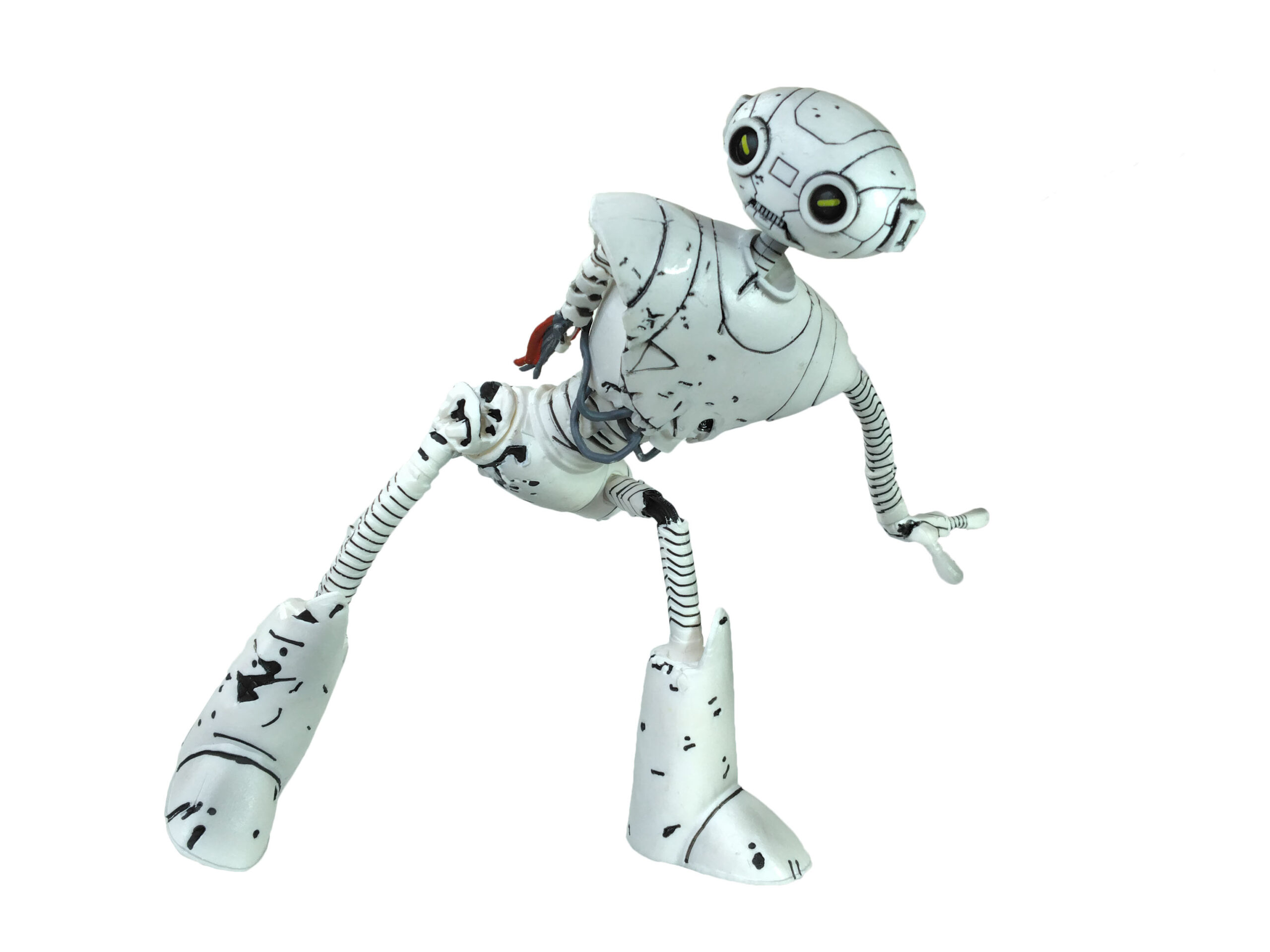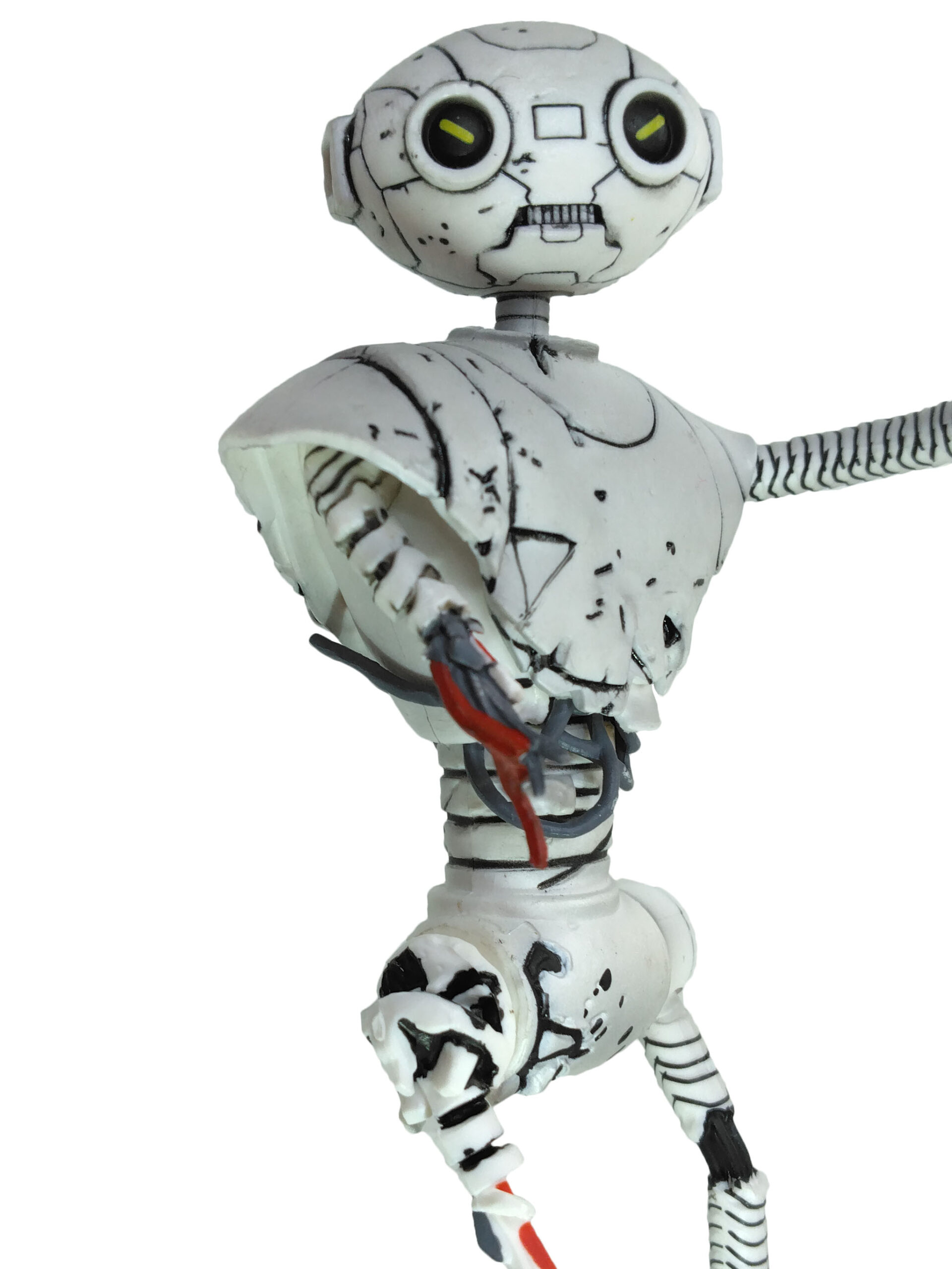 La peinture de cette figurine est relativement simple. Entièrement peinte de blanc, quelques détails parsèment le personnage. De très nombreux traits noirs permettent de mettre en valeur les différents dégâts subits par le robot.