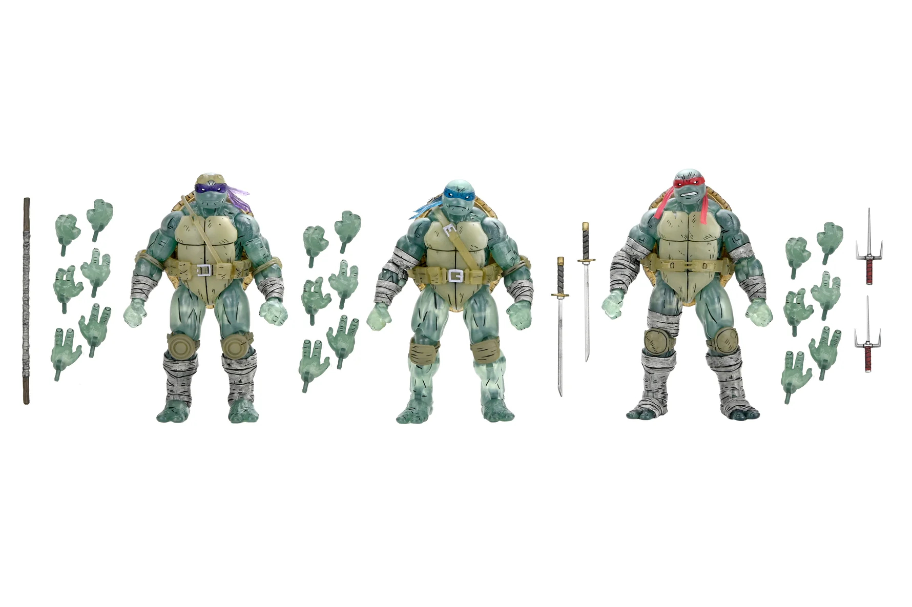 Le 10 décembre 2024, NECA a lancé sur son site un 3-pack qui n’avait jamais encore été annoncé, comprenant les trois tortues dans leur état spectral, apparaissant au dernier ronin à travers les pages des comics. Si jusqu’ici, NECA avait présenté un grand nombre de figurines à venir pour la gamme The last ronin, celles-ci ne l’avaient pas encore été.