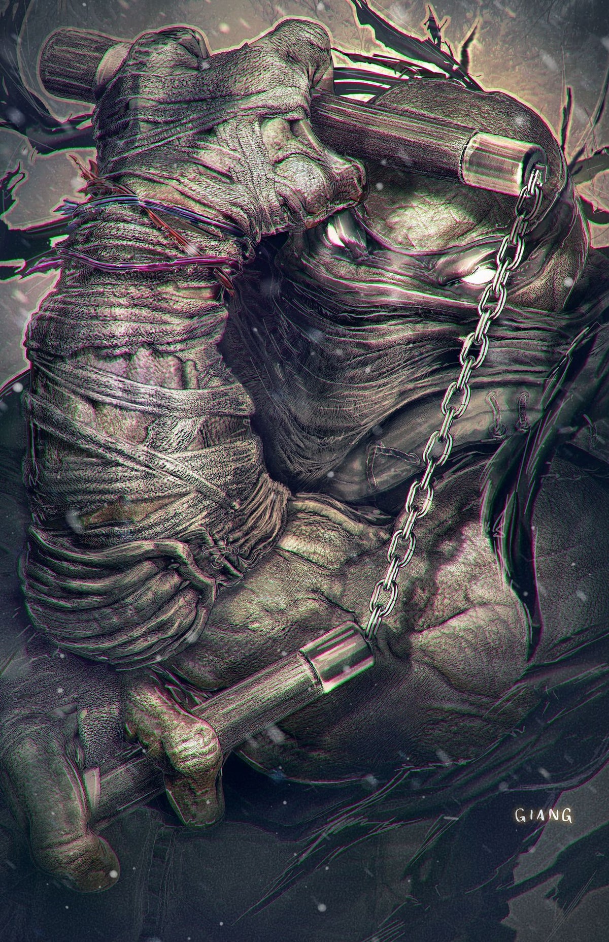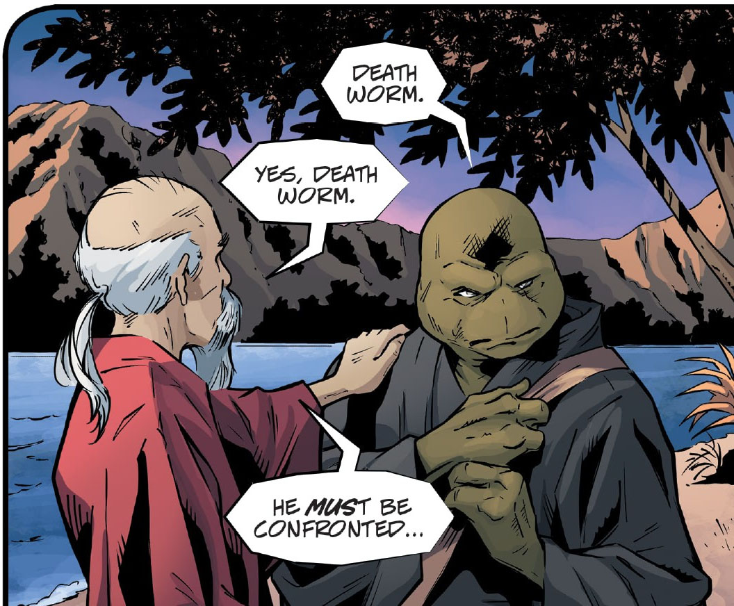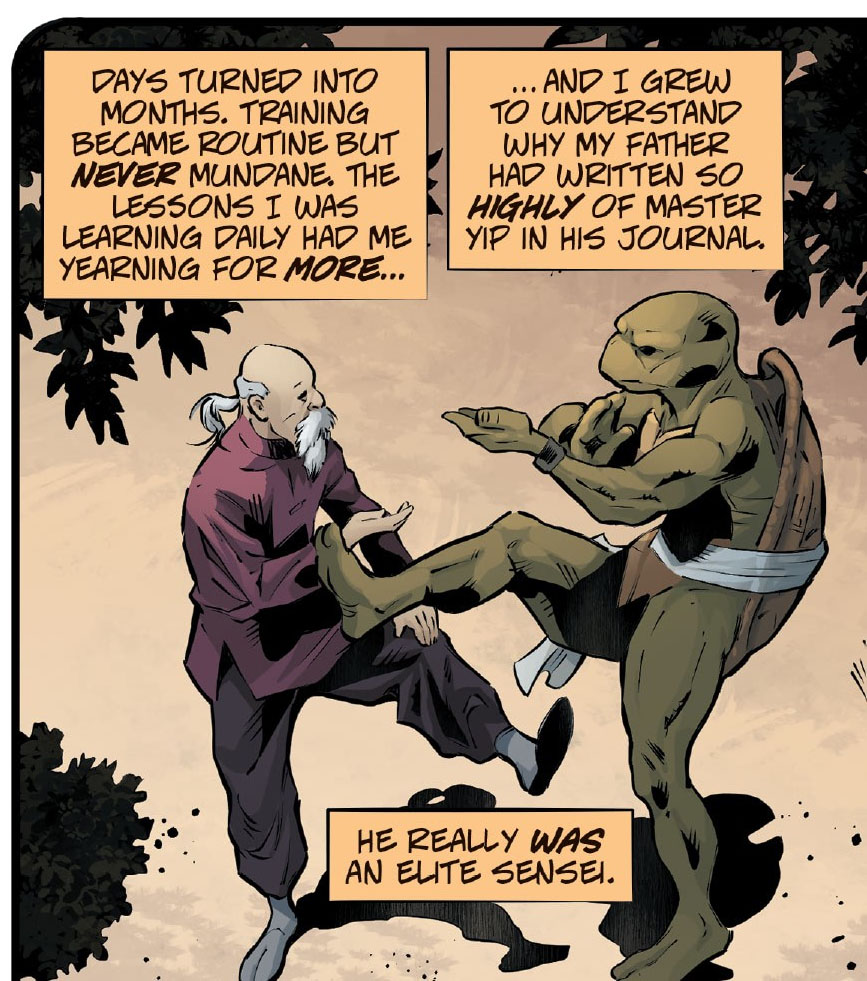 Une fois reposé, Michelangelo vint le trouver pour commencer son entraînement. Il allait se soumettre au sojido, la tradition du grand nettoyage pour les chunins qui venaient en apprentissage chez leur maître. Une manière de remercier ce dernier. Son entraînement pouvait commencer. Yip voulait reprendre les fondamentaux avant de passer aux armes, ce qui leur prit plusieurs mois. Mais Michelangelo reconnaissait volontiers le talent du maître, souvent vanté dans les notes du carnet de Splinter. Après plus d’un an et demi d’entraînement, l’heure était venue pour la tortue de repartir pour New York. Sur le départ, maître Yip lui fit prendre conscience qu’il n’avait aucun intérêt à repartir venger sa famille s’il n’avait pas un dernier travail à mener en Asie. Tuer Hiroto n’était-il pas synonyme de fuite de Death Worm ?
