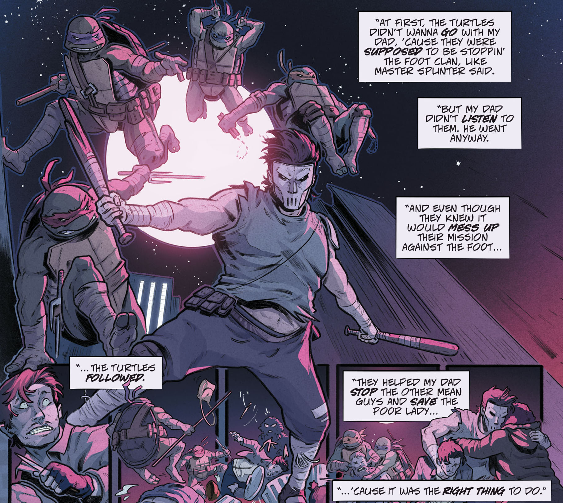 S’asseyant auprès des jeunes tortues, Casey Marie leur racontait une histoire. Celle de Casey Jones, son père, et des Tortues Ninja. Un soir, alors qu’ils s’apprêtaient à arrêter des ninjas Foot en train de commettre un vol, le justicier au masque de hockey vit une dame se faire agresser. N’écoutant pas Leonardo, qui voulait se concentrer sur leur mission, il lui vint en aide. Les tortues, malgré les ordres de Splinter, préférèrent lui prêter main forte. C’était la meilleure chose à faire, malgré l’échec de leur mission. La morale de cette histoire était qu’il valait mieux faire ce qui était nécessaire, et donc réfléchir et juger de l’importance d’une affaire, plutôt que de suivre bêtement une directive sans penser aux conséquences.