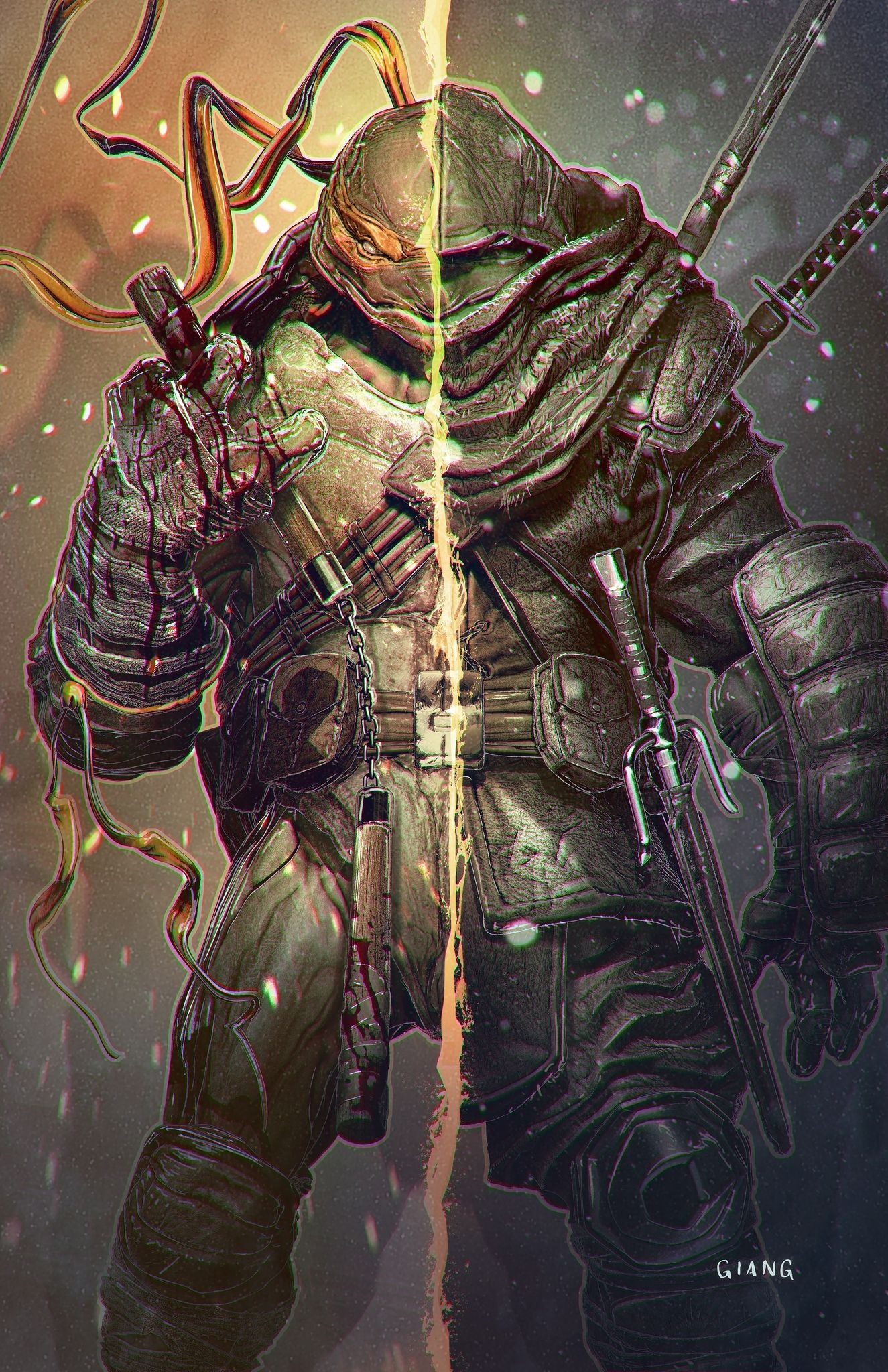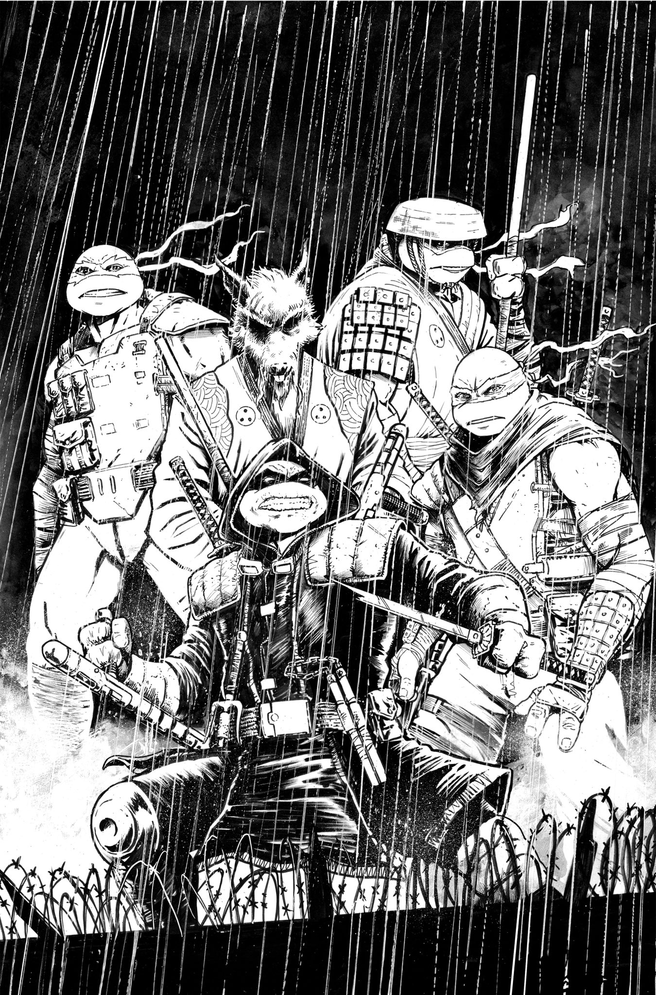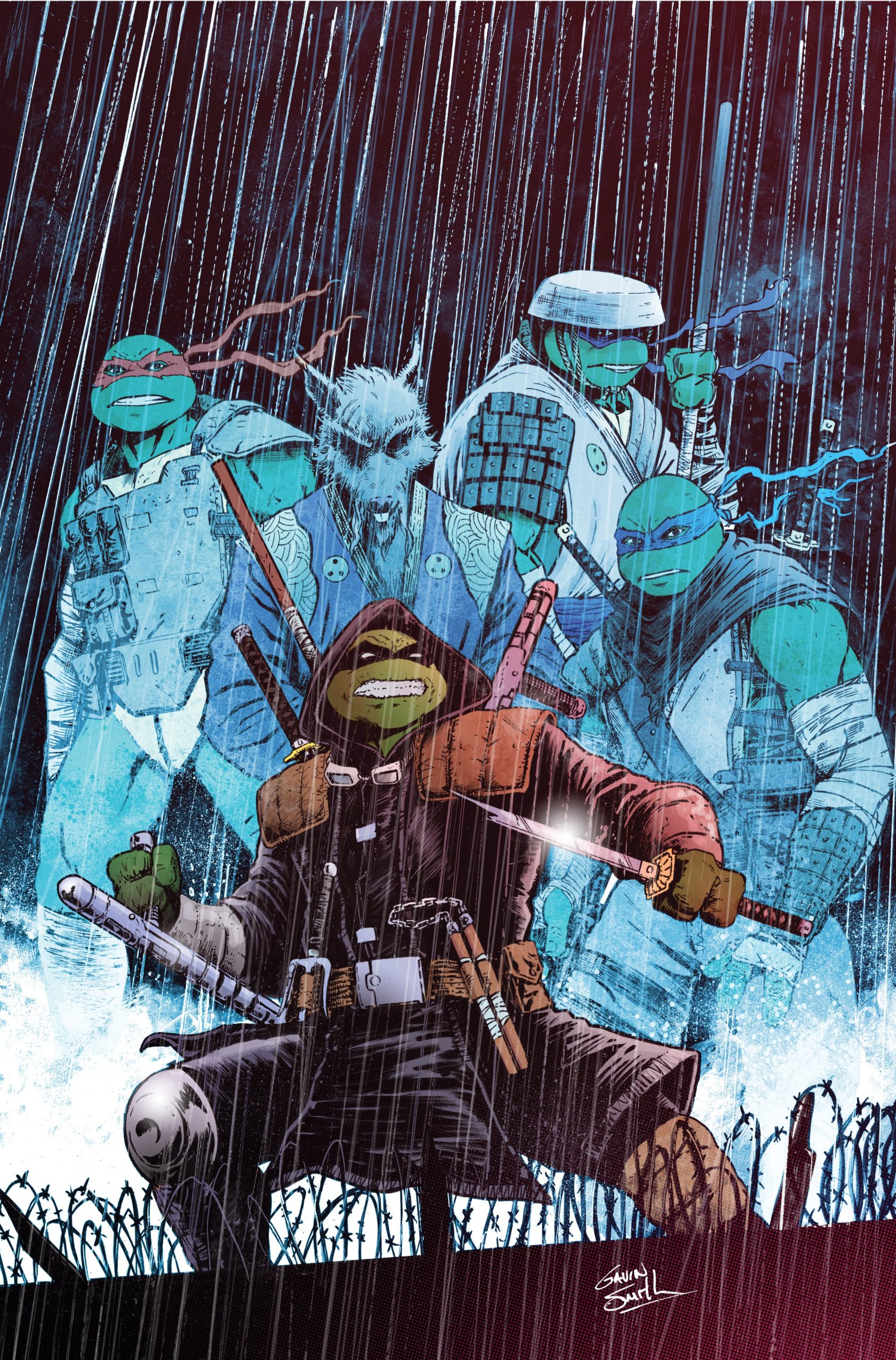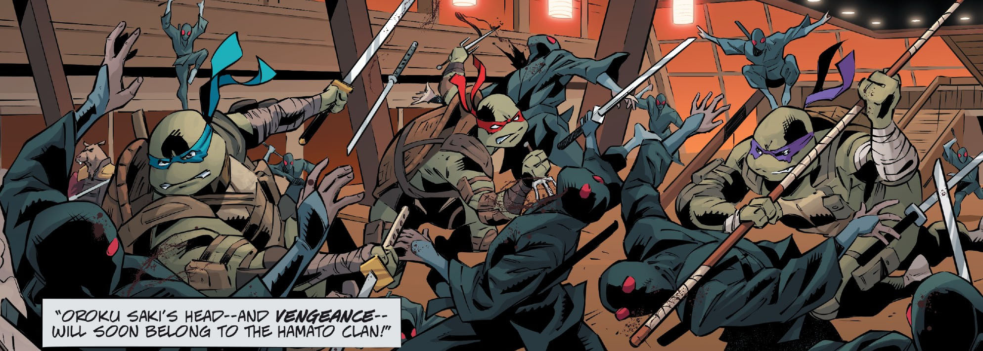 Arrêtant d’une main le kama qui s’abattait sur elle, la tortue désarmait son adversaire et retournait l’arme contre lui. Les autres hommes, désemparés par ce changement d’attitude, sautaient sur le monstre vert, qui les abattait les uns derrière les autres. Tant d’années qu’il n’avait plus combattu. Mais il avait encore de bons restes face à ces individus sans scrupules. Des années à ressasser la colère, la solitude et la culpabilité. Seul l’un d’entre eux était encore debout et prenait la fuite. Épuisé, Michelangelo ramassait le journal de Splinter, fier d’avoir redressé la tête.