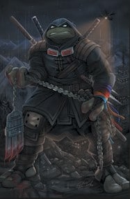 Entendant ces mots, la tortue sortait de ses gonds et saisit les armes de ses frères pour fondre sur les bandits qu’il tuait les uns derrière les autres. Allait-il tenir un deuxième combat alors qu’il n’avait plus livré bataille depuis des lustres ? Il n’en restait bientôt plus qu’un. Le même qu’il avait laissé s’échapper de son jardin. Le même qui l’accusait de les avoir attaqués. S’avançant vers lui, la tortue ne lui démontrait pas la clémence escomptée et le plantait du sabre de Leonardo. Le corps sans vie glissait de la lame pour s’effondrer au sol.